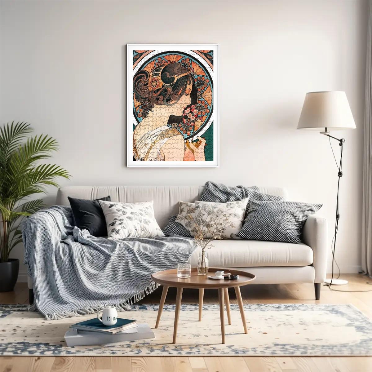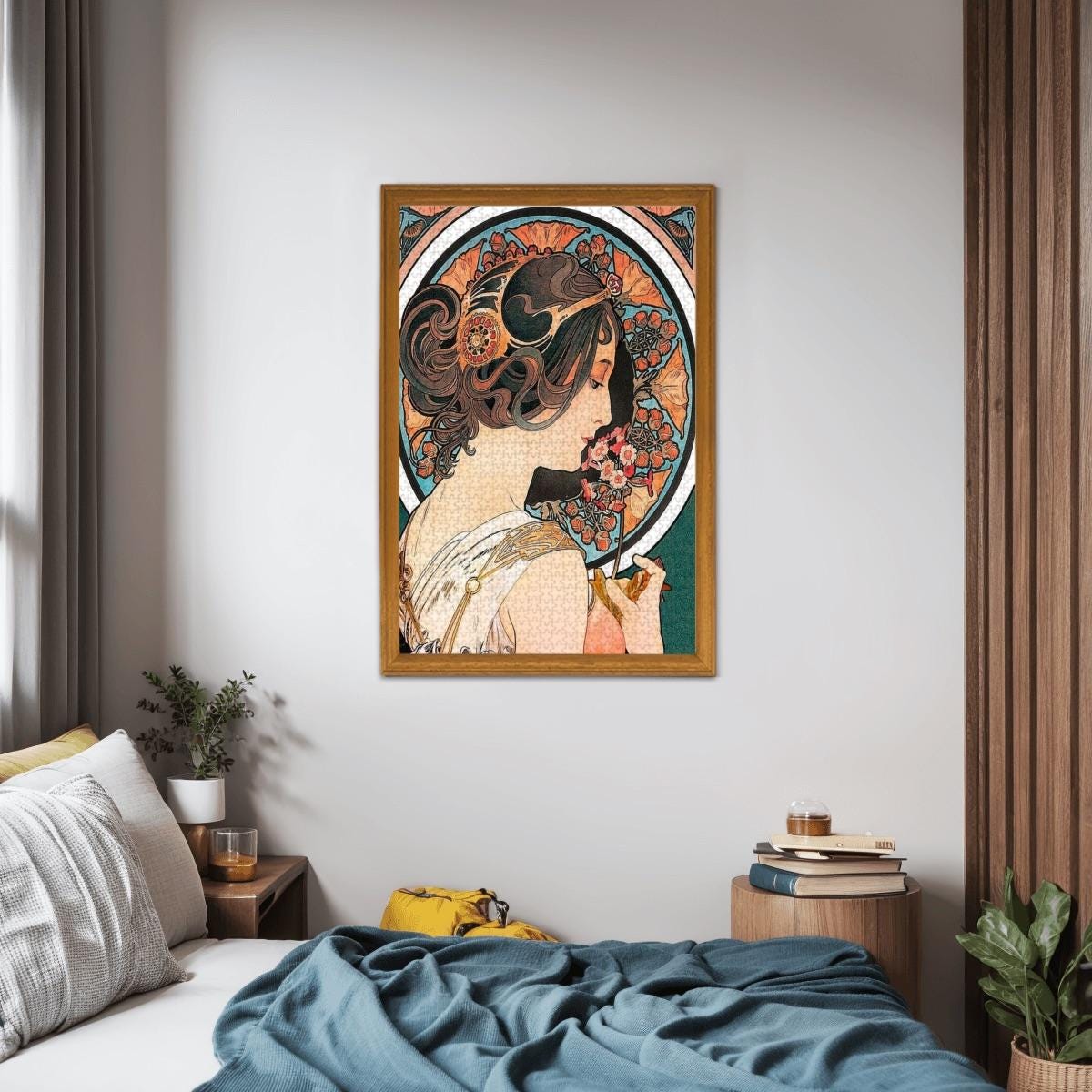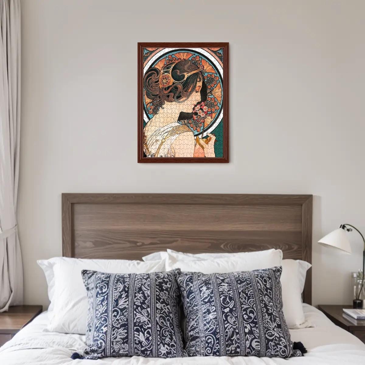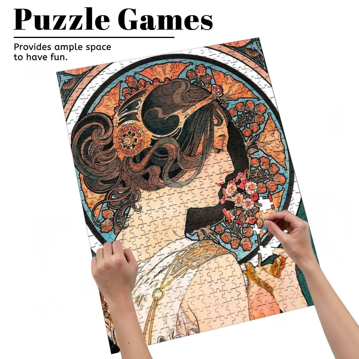 Bring the elegance of Art Nouveau to your puzzle table with this Vintage Mucha-Style Wooden Puzzle, available in 500 or 1000 pieces. Featuring a graceful woman surrounded by floral motifs, swirling lines, and soft vintage colors, this puzzle beautifully captures the romantic, decorative style inspired by Alphonse Mucha’s iconic artwork.