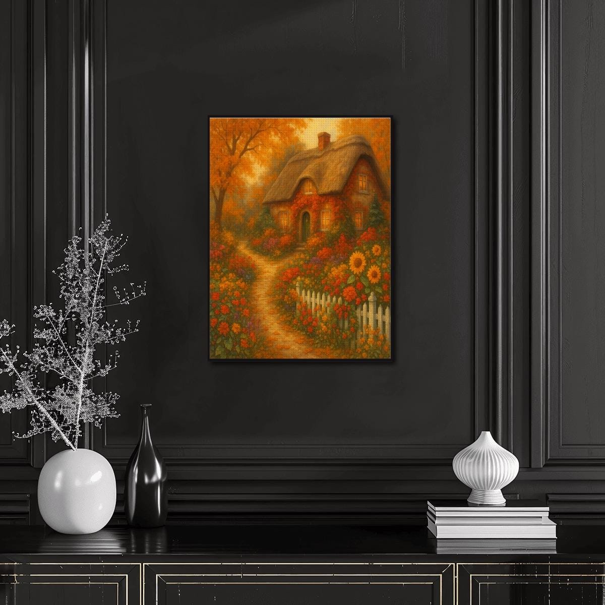 A warm, glowing autumn cottage surrounded by colorful fall trees, pumpkins, flowers, and a peaceful winding path. This DIY diamond painting kit is relaxing to work on and perfect for fall décor or year-round cozy home decorating.