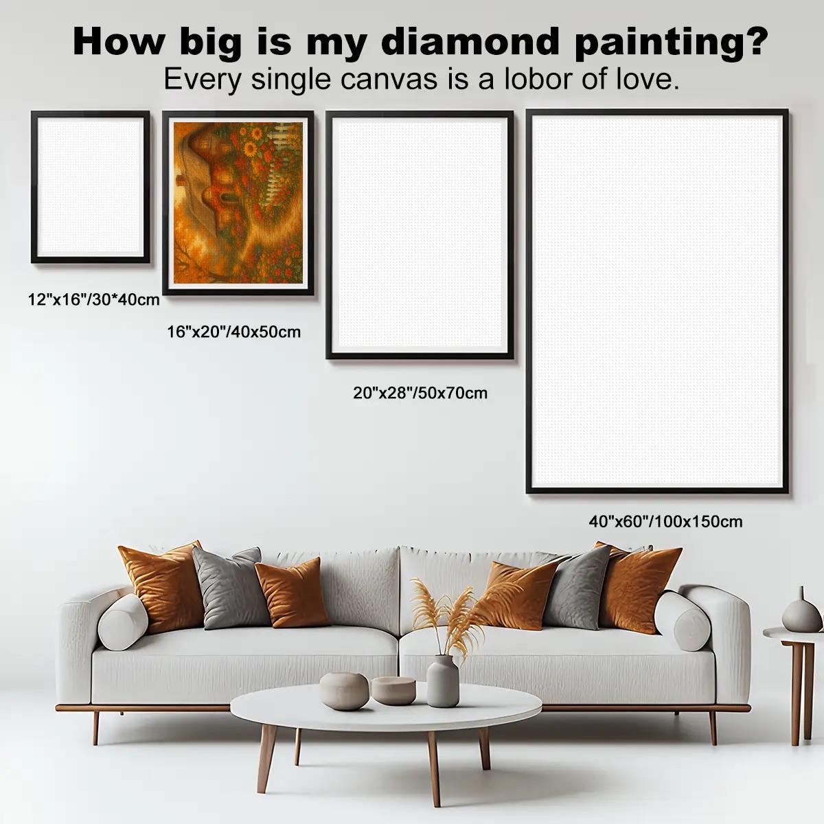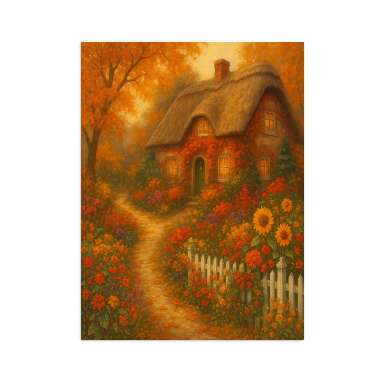 A warm, glowing autumn cottage surrounded by colorful fall trees, pumpkins, flowers, and a peaceful winding path. This DIY diamond painting kit is relaxing to work on and perfect for fall décor or year-round cozy home decorating.