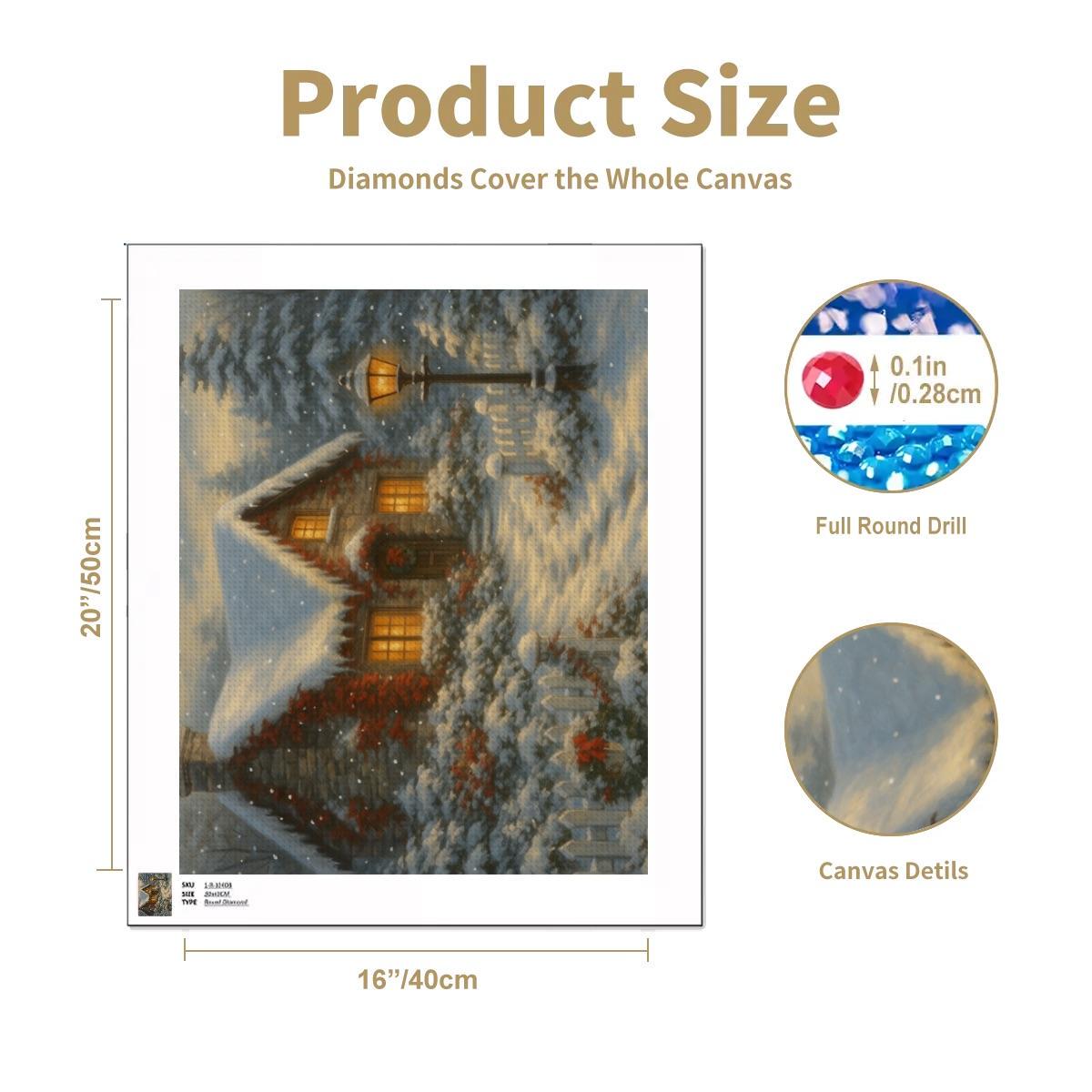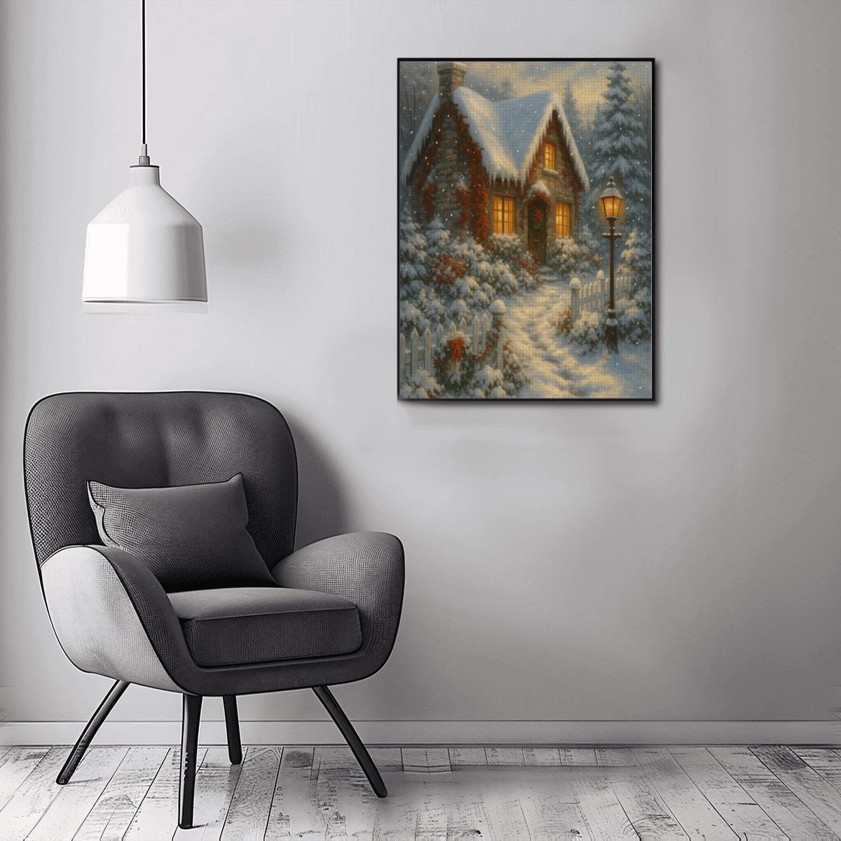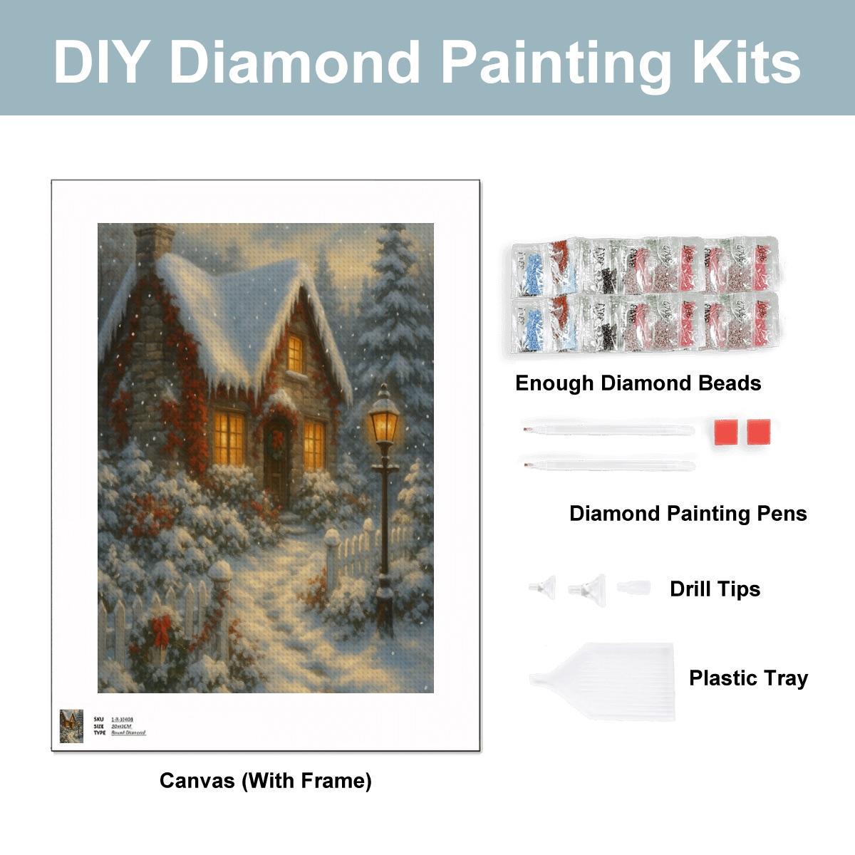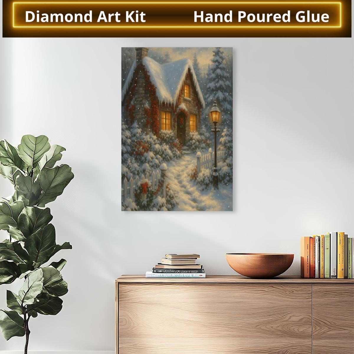 Beautiful Winter Cottage Diamond Painting Kit with warm glowing cabin, snowy trees, and cozy Christmas details. Full round drill, easy and relaxing DIY craft.