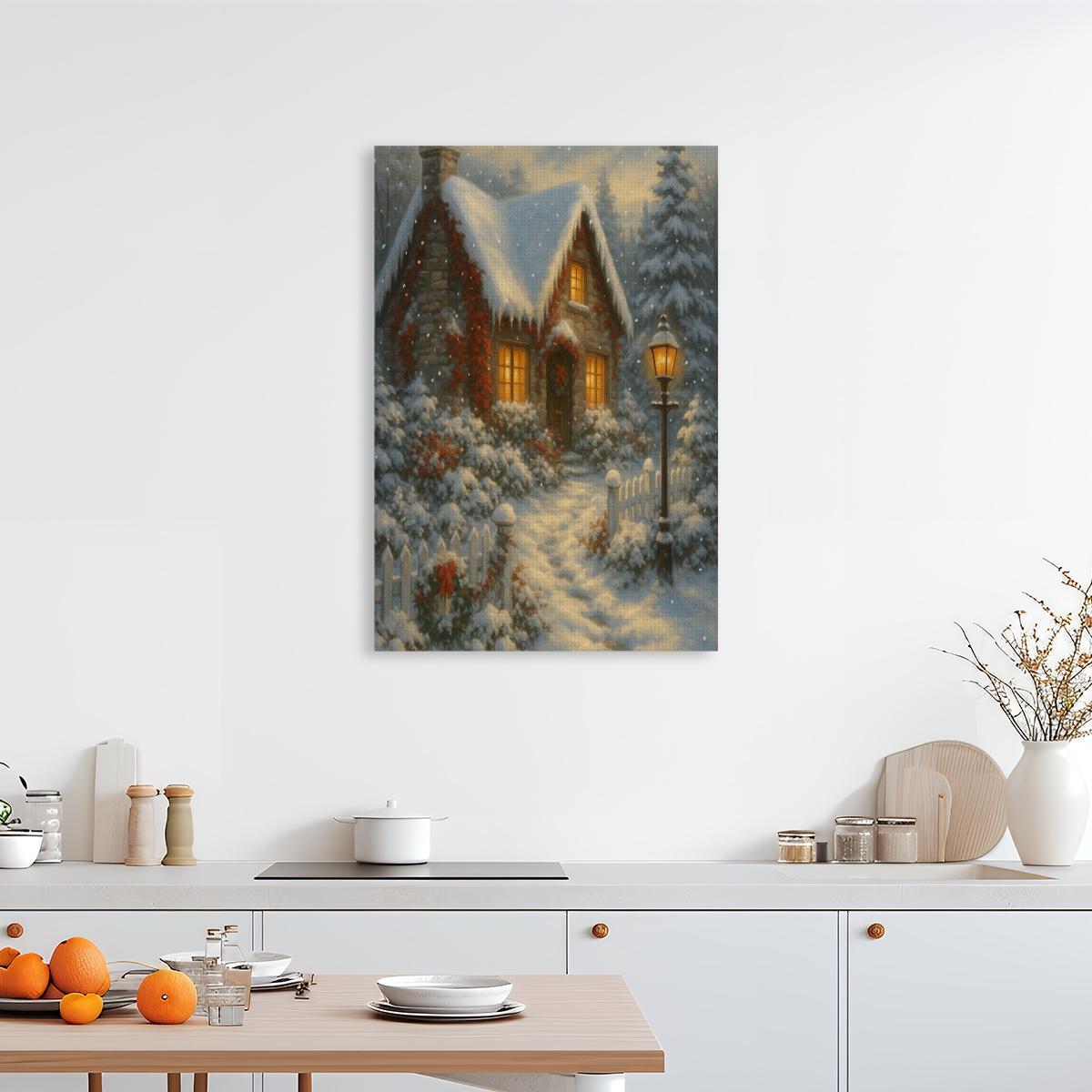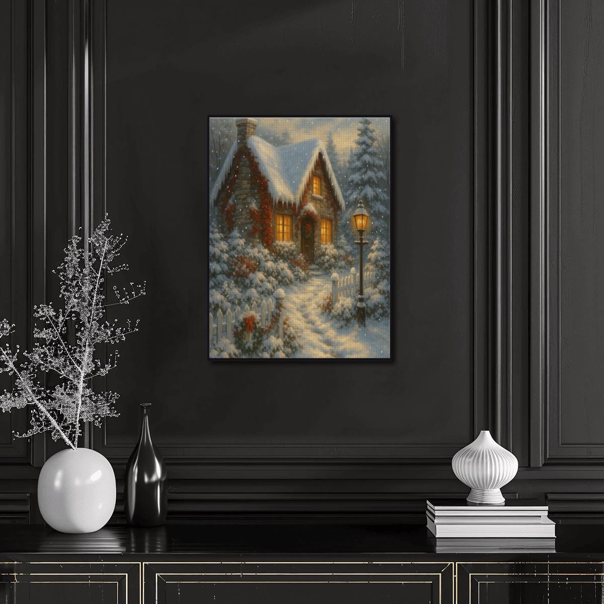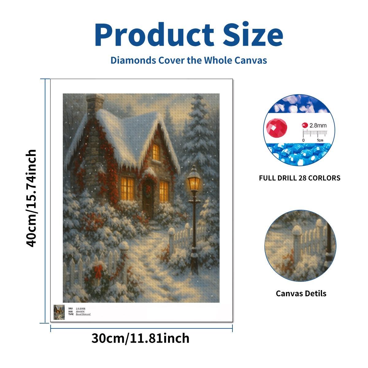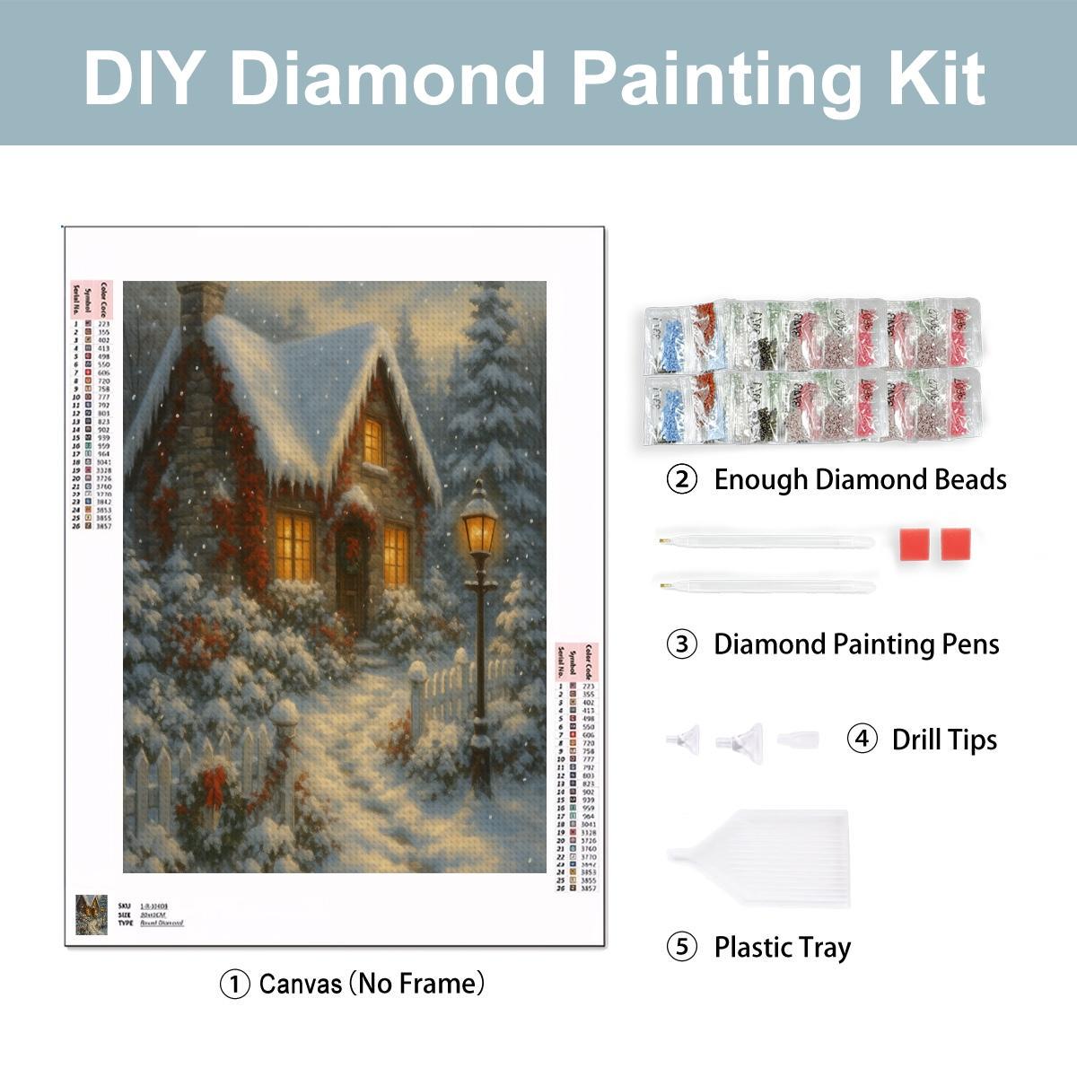 Beautiful Winter Cottage Diamond Painting Kit with warm glowing cabin, snowy trees, and cozy Christmas details. Full round drill, easy and relaxing DIY craft.