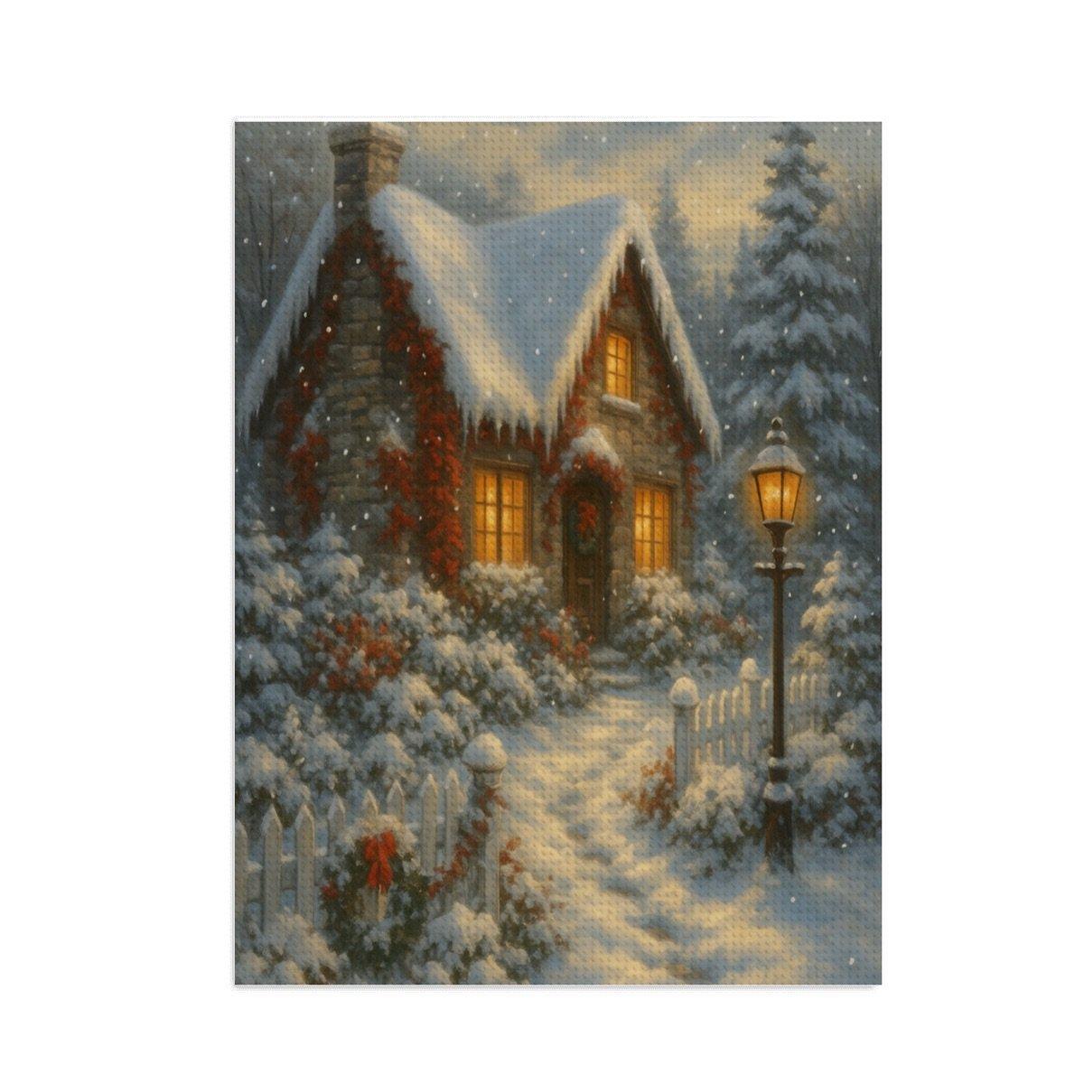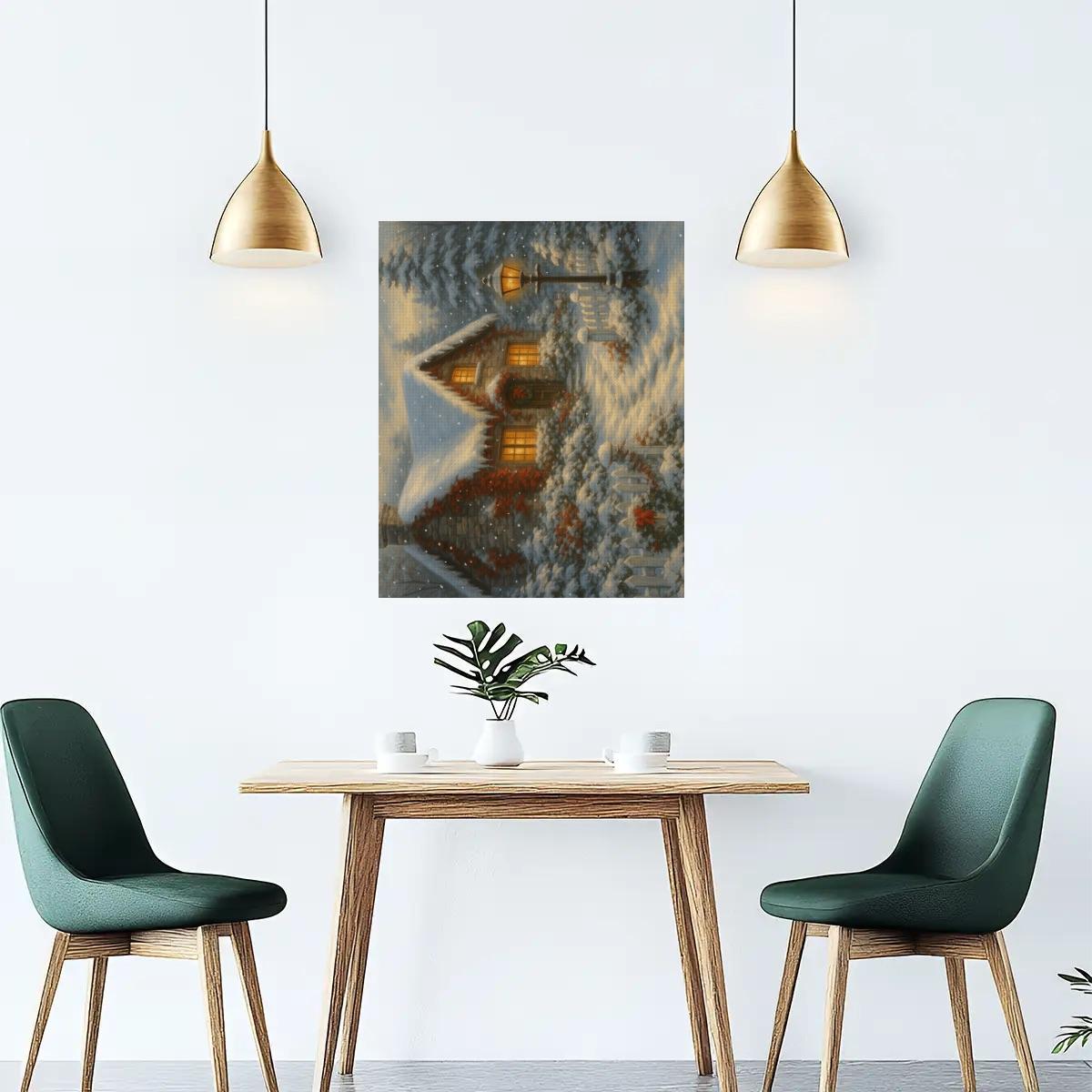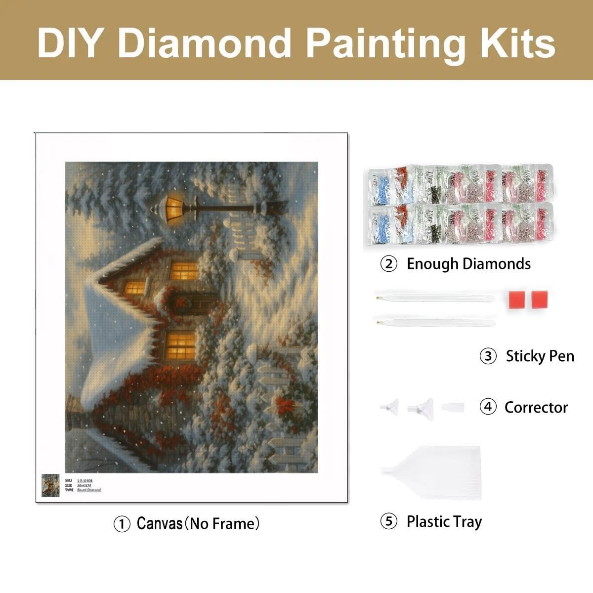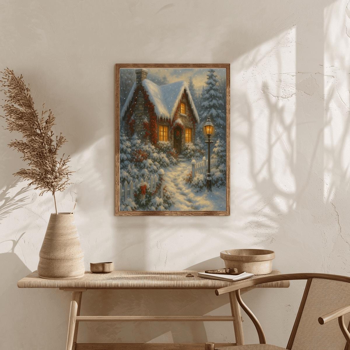 Beautiful Winter Cottage Diamond Painting Kit with warm glowing cabin, snowy trees, and cozy Christmas details. Full round drill, easy and relaxing DIY craft.