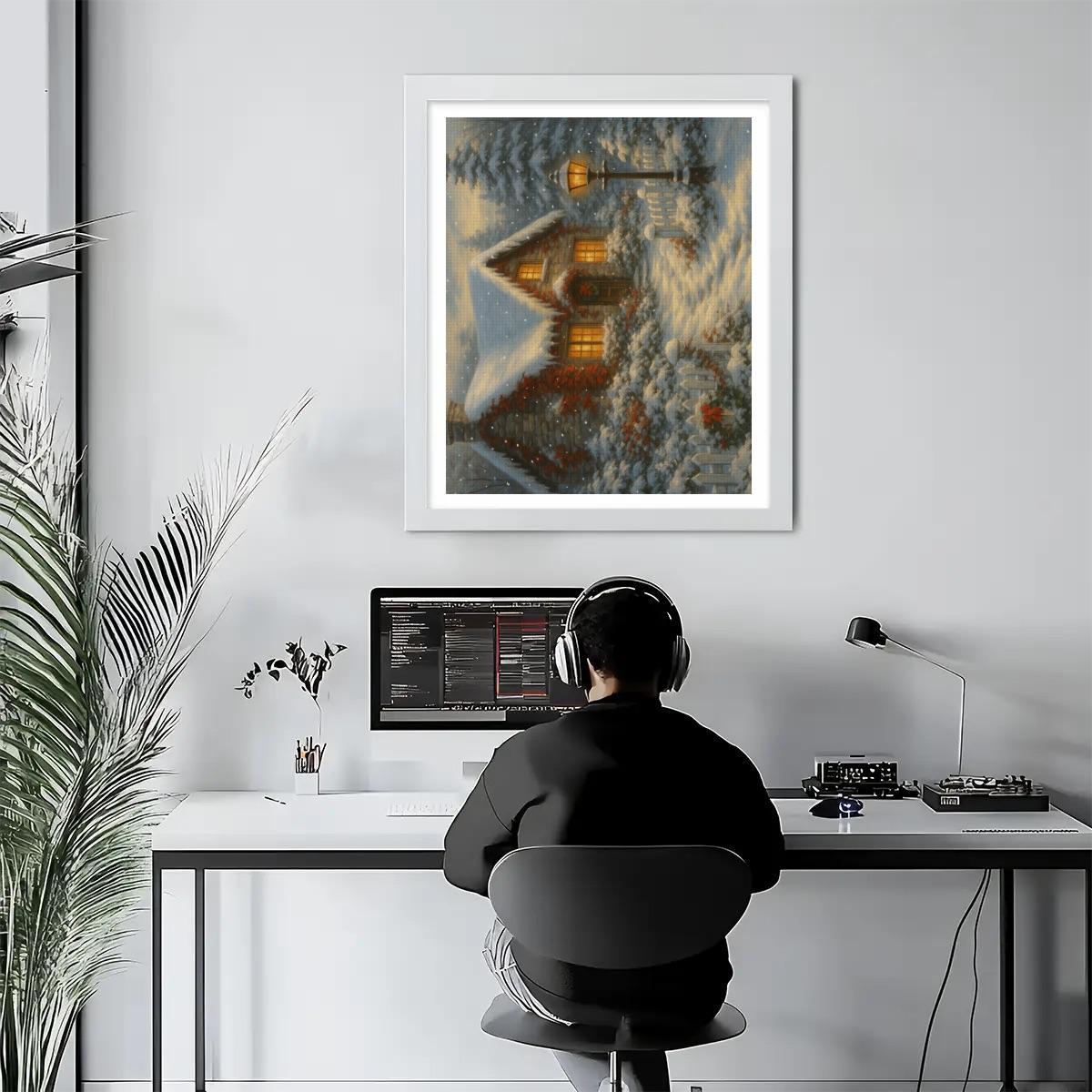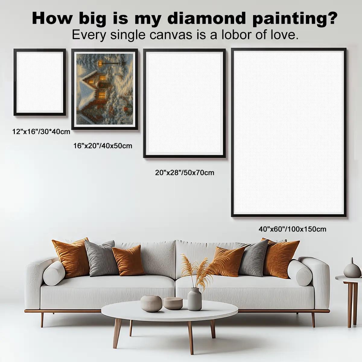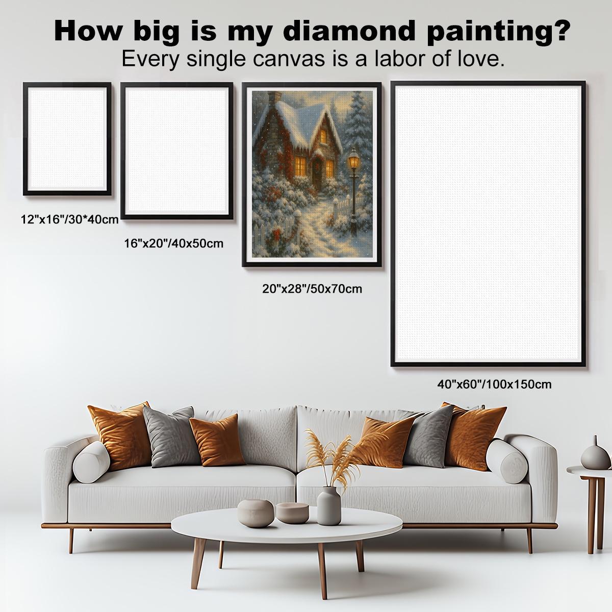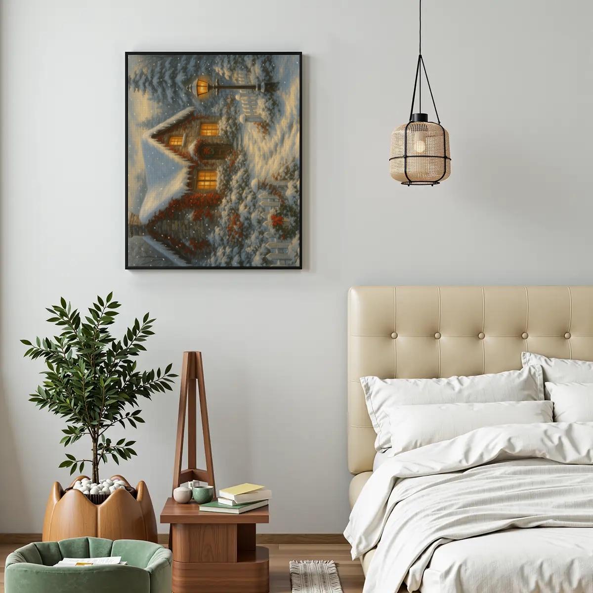Beautiful Winter Cottage Diamond Painting Kit with warm glowing cabin, snowy trees, and cozy Christmas details. Full round drill, easy and relaxing DIY craft.
