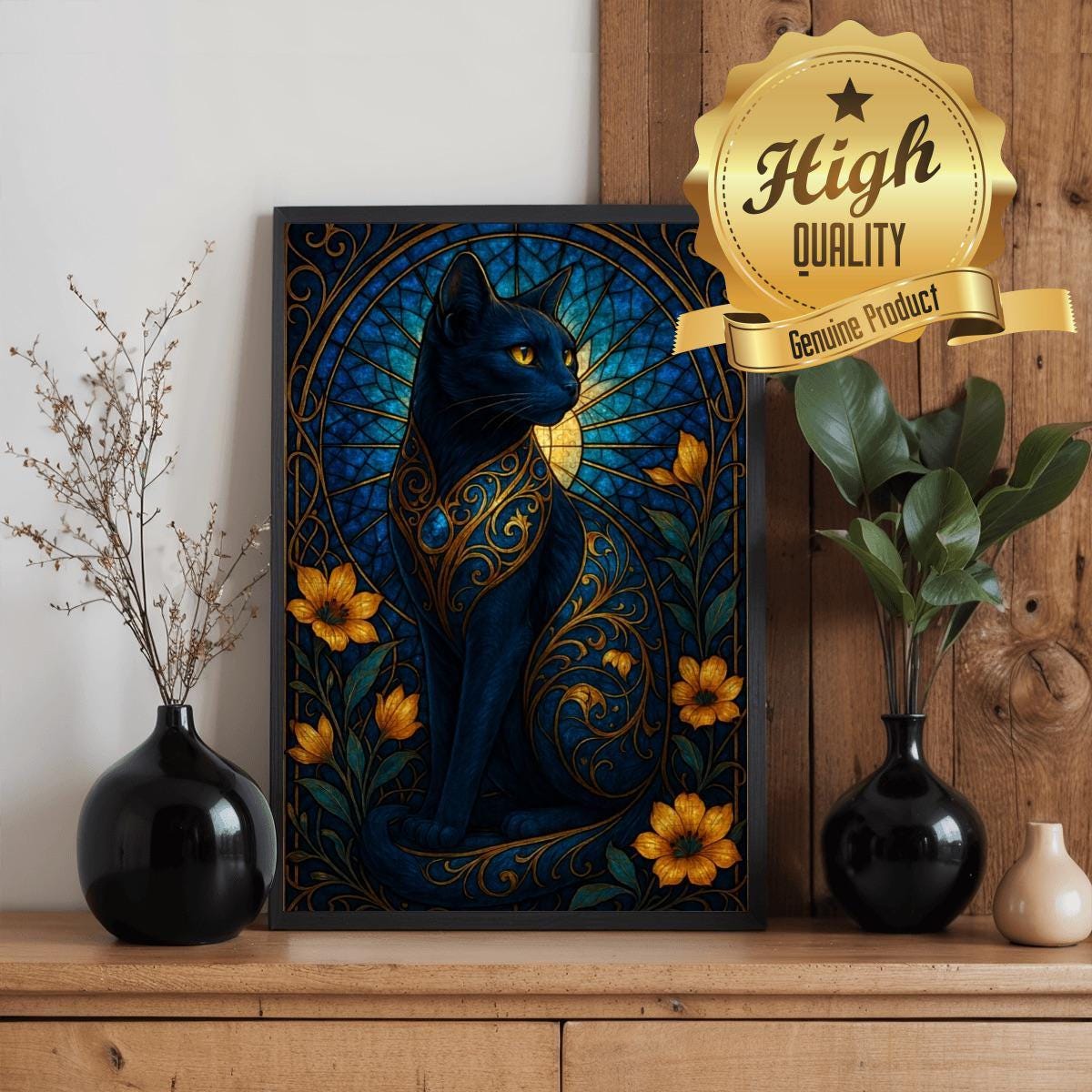 • Stained-Glass Inspired Design – rich sapphire blues, shimmering gold lines, floral highlights