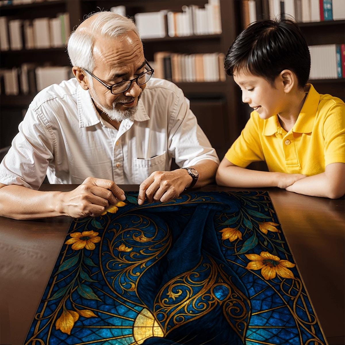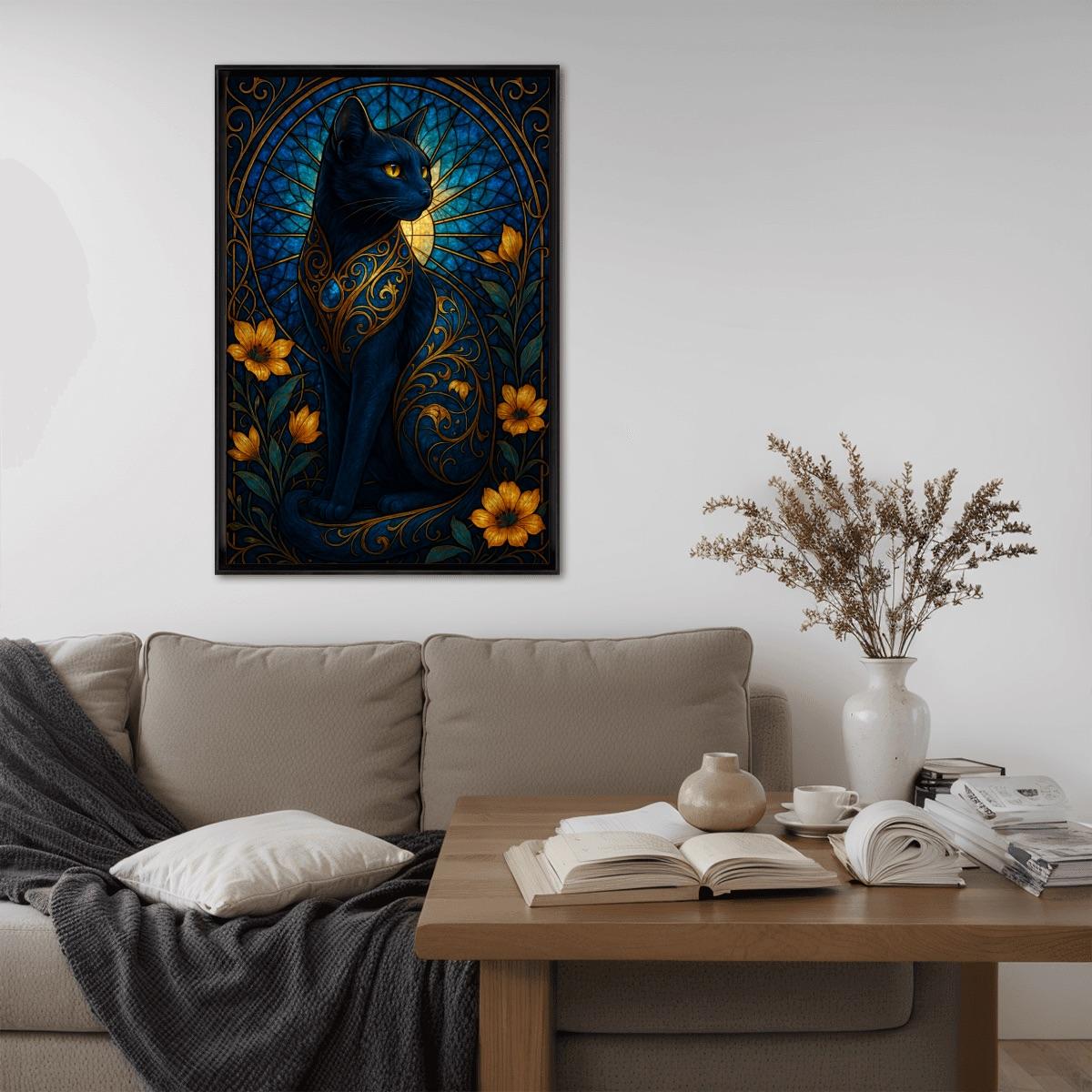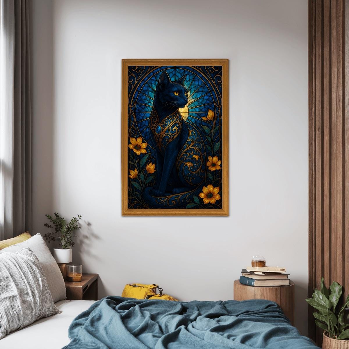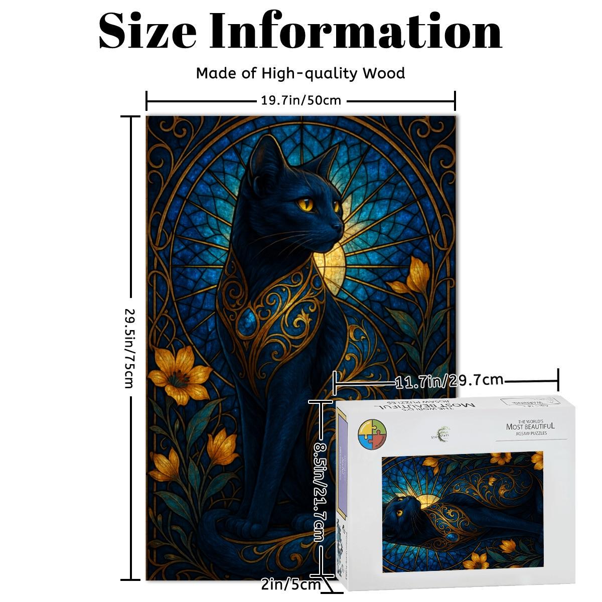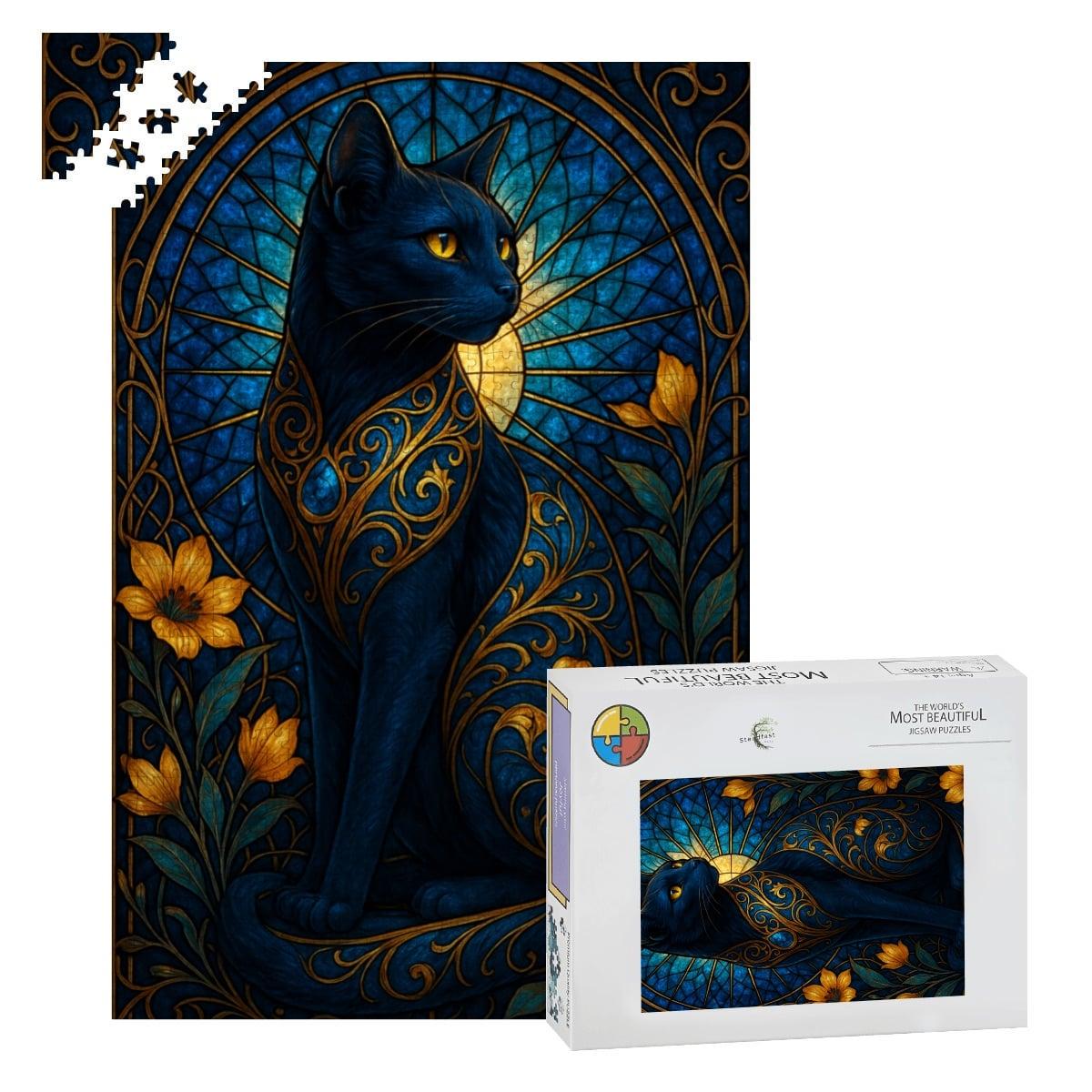 Experience the magic of deep sapphire blues, golden florals, and ornate stained-glass detailing with this Blue Art Nouveau Cat Puzzle.