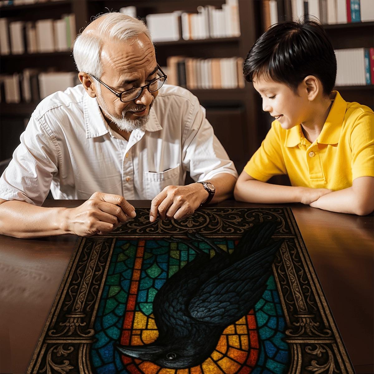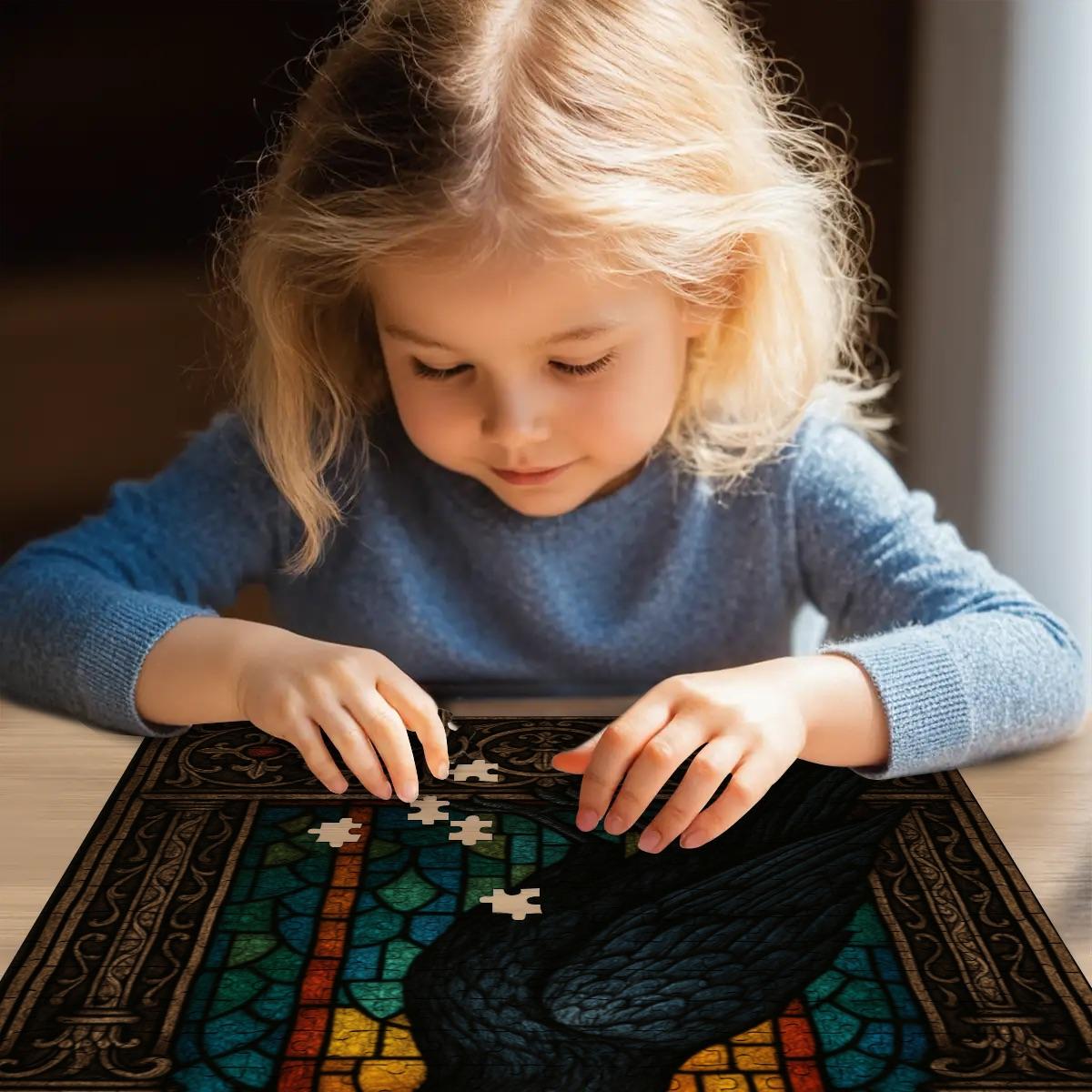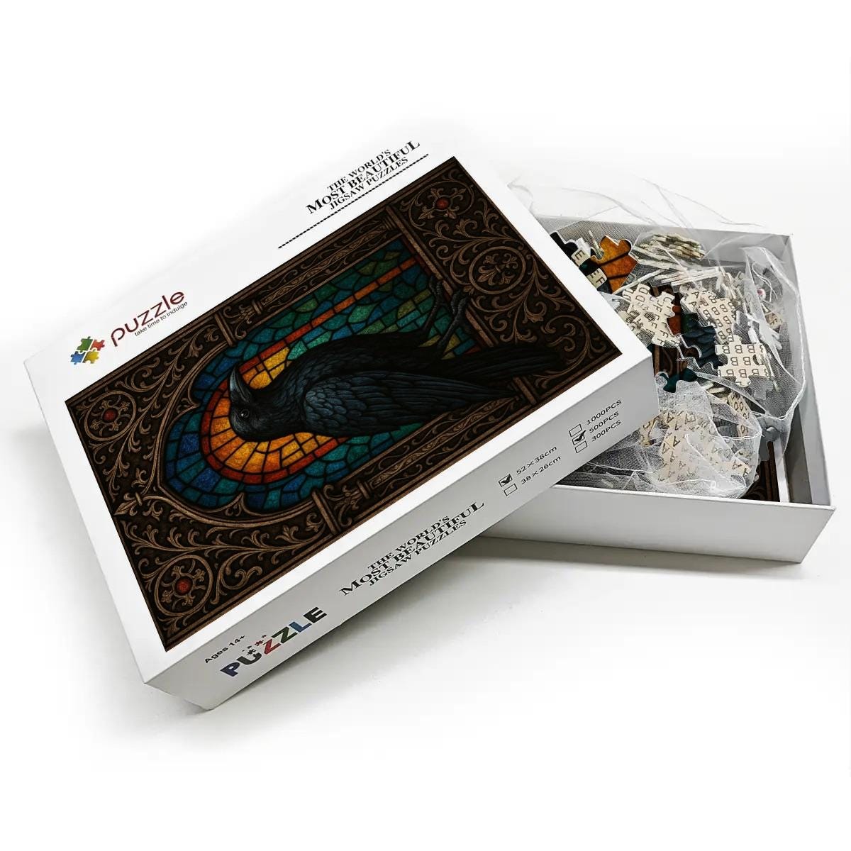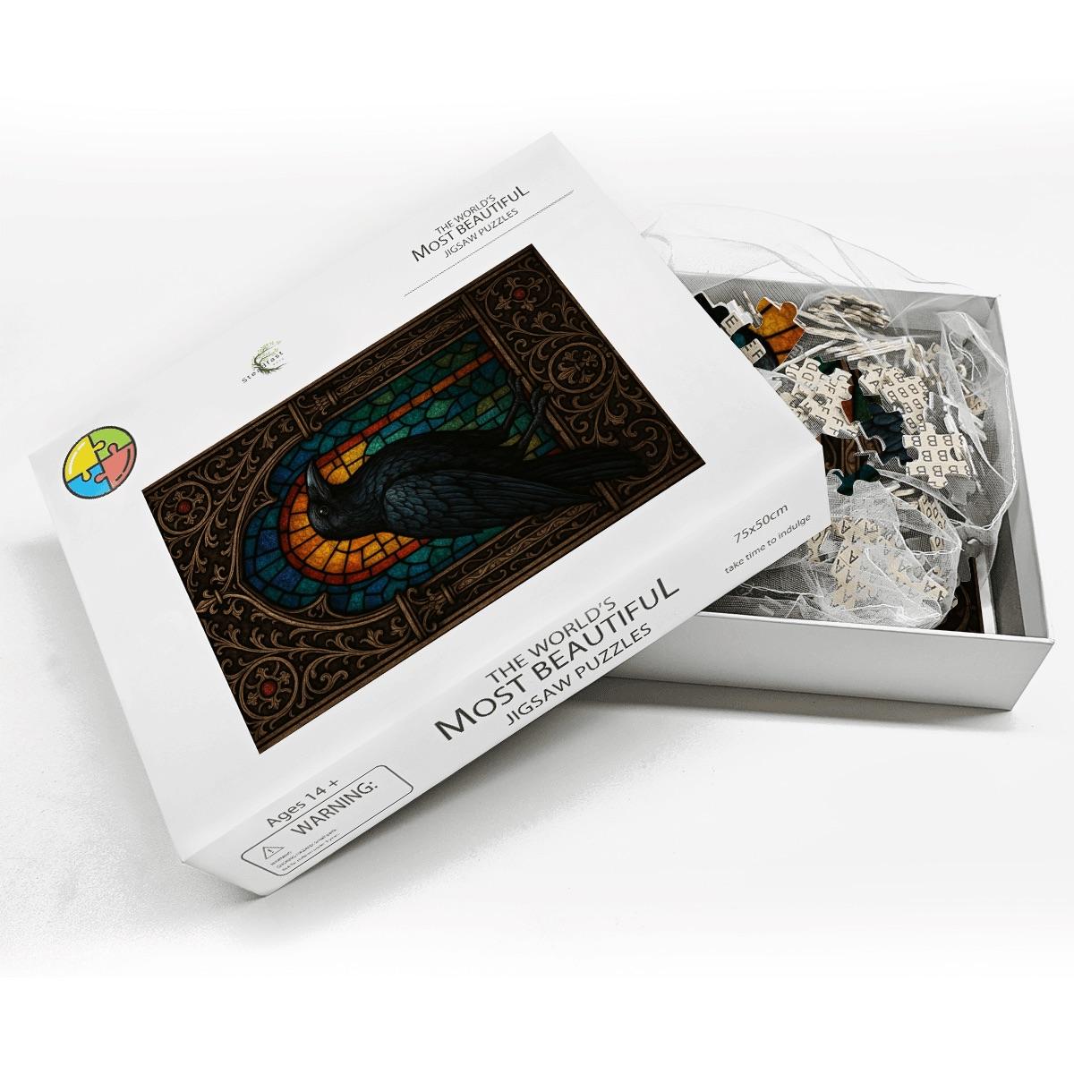 Enjoy a premium puzzle experience with this UV-printed oak wood jigsaw puzzle, featuring a dramatic stained-glass raven design. Crafted for adults who love art, focus, and challenge, this puzzle is as beautiful to assemble as it is to display.