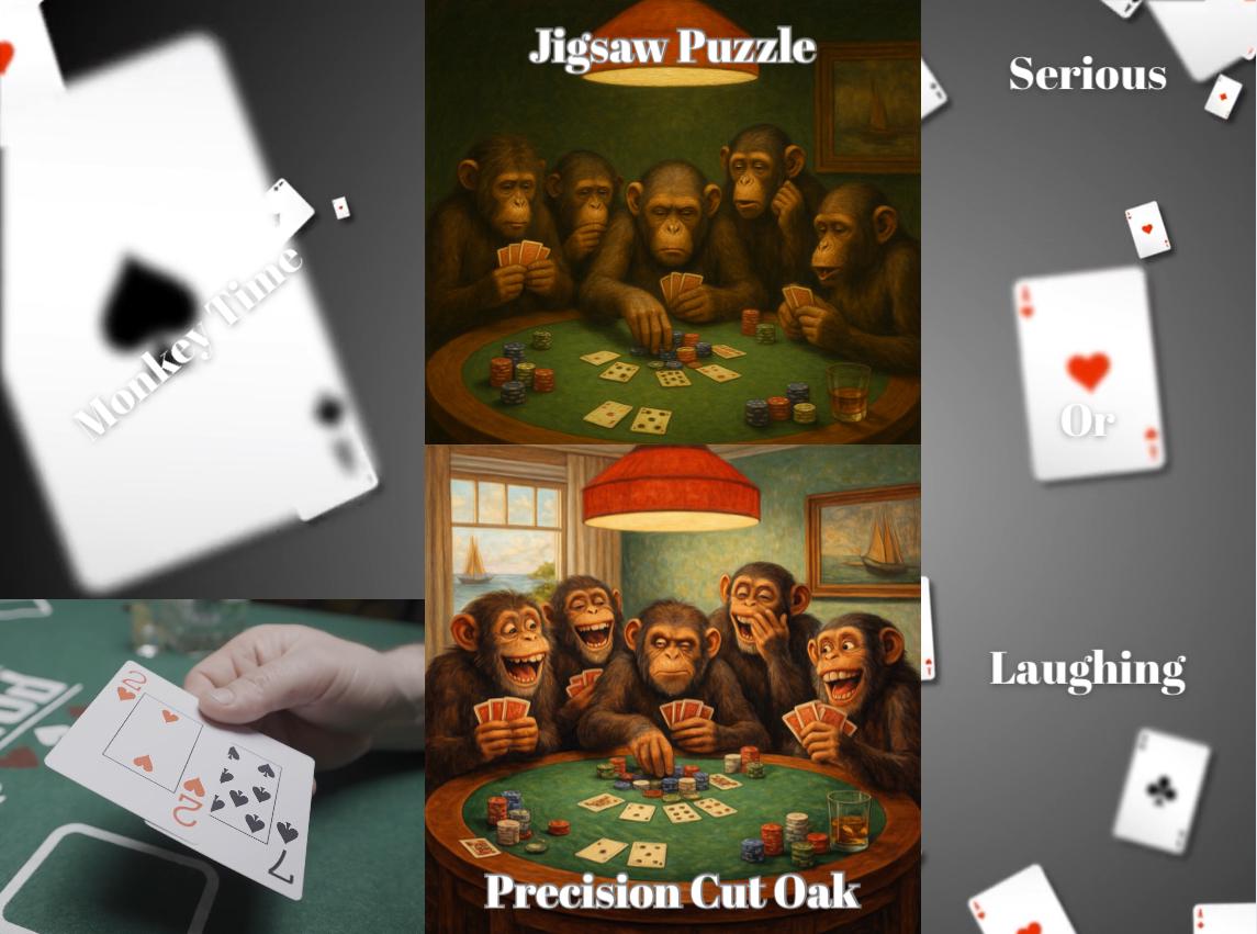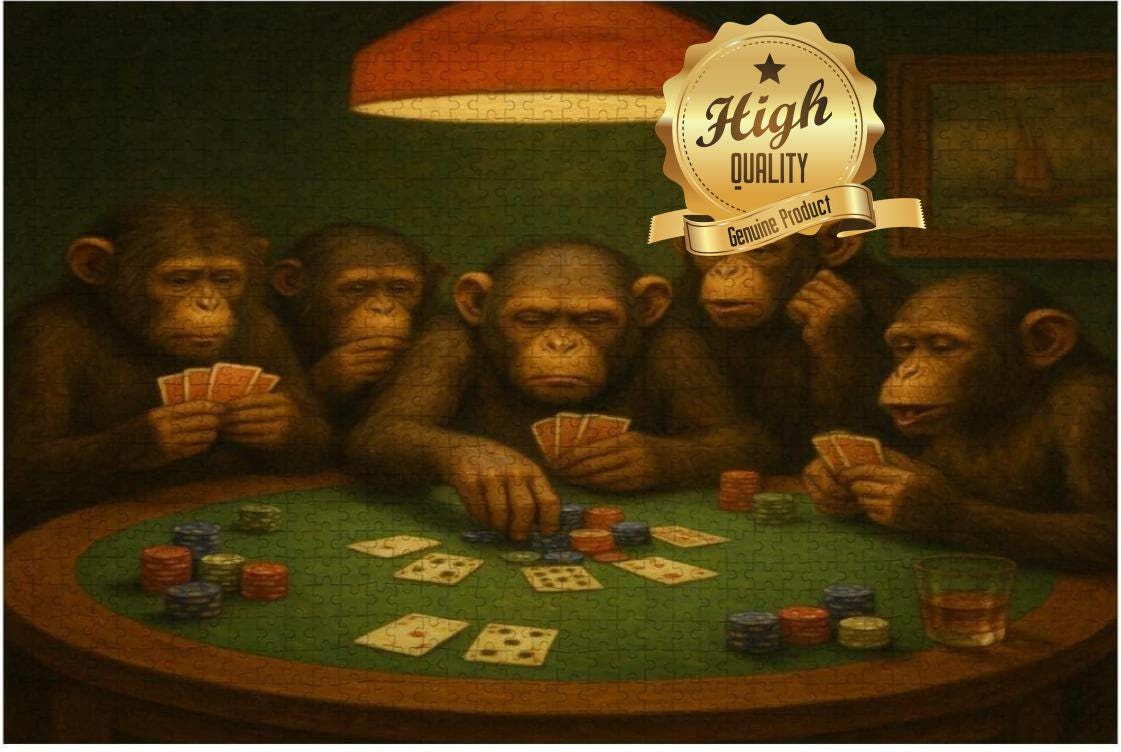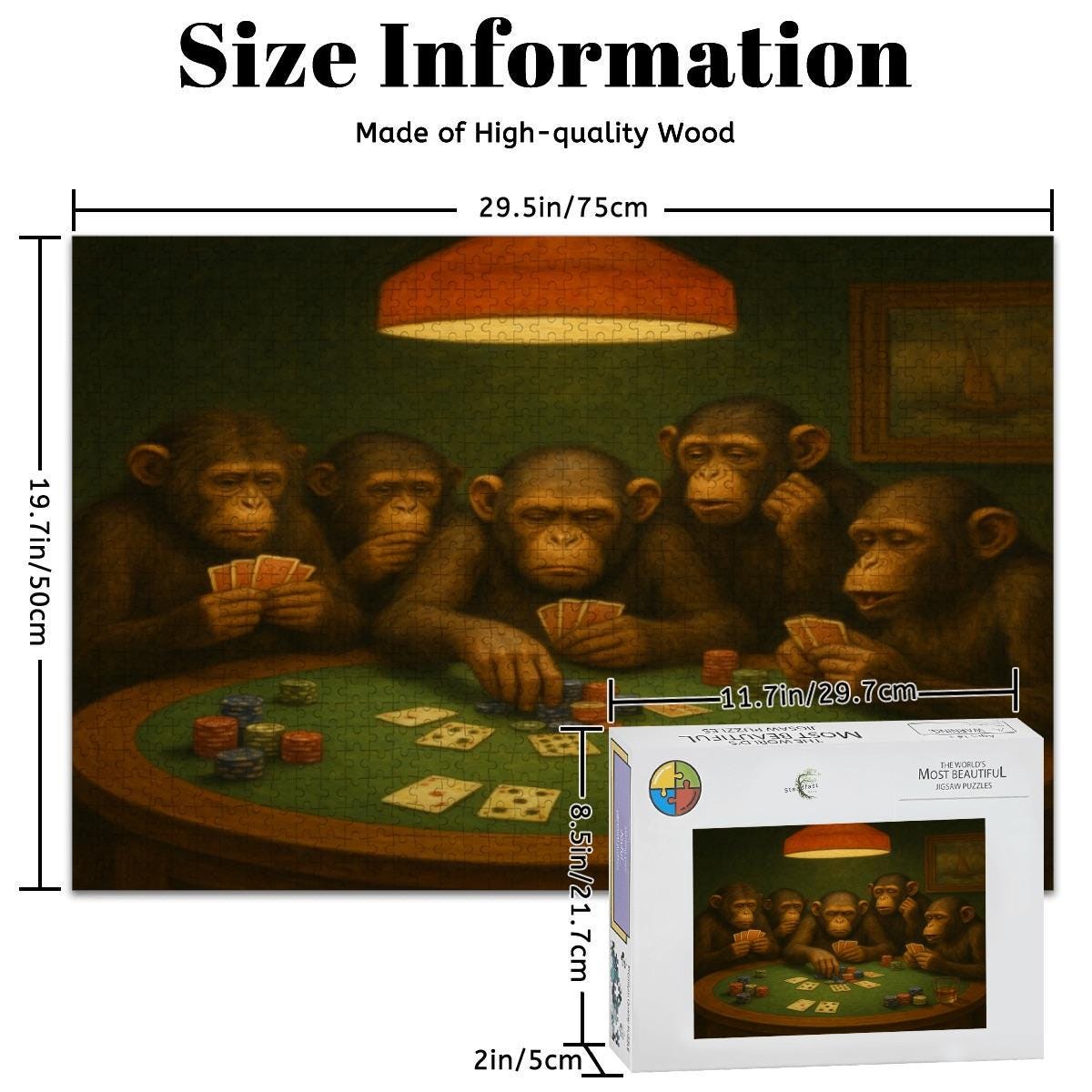 Available in 500 or 1000 pieces, this premium puzzle features sharp details, rich vintage colors, and precision-cut wooden pieces that feel amazing in the hands. Perfect for game rooms, man caves, family nights, or anyone who loves poker humor. Laughing or Serious Monkey Design.