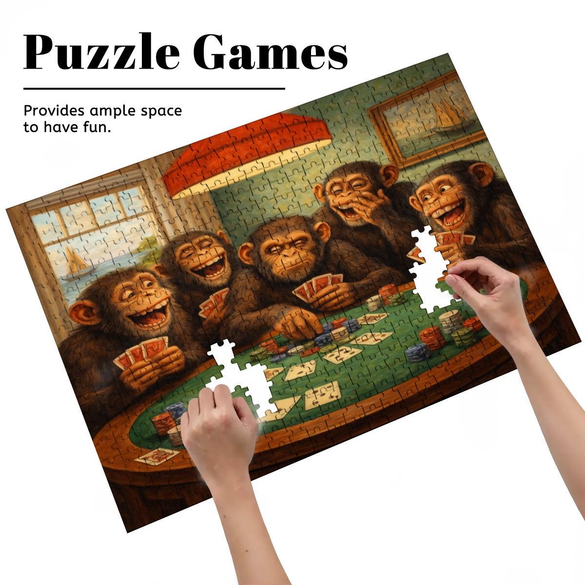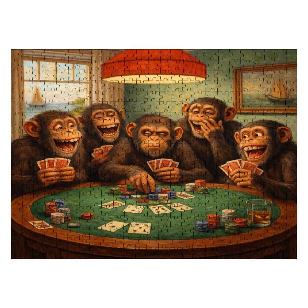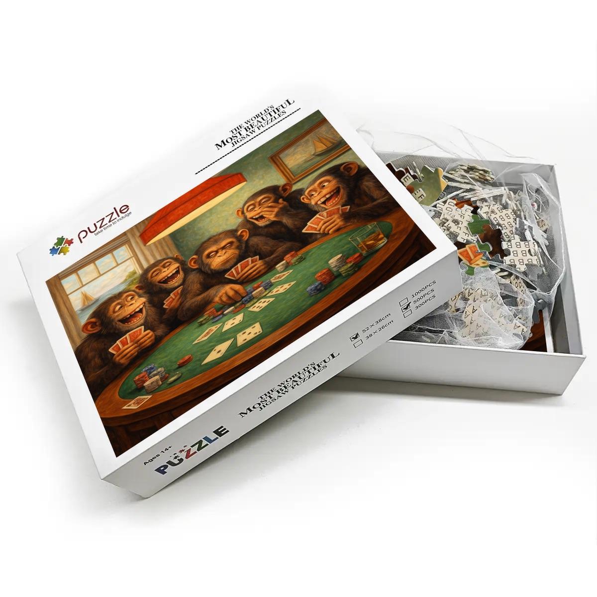 Available in 500 or 1000 pieces, this premium puzzle features sharp details, rich vintage colors, and precision-cut wooden pieces that feel amazing in the hands. Perfect for game rooms, man caves, family nights, or anyone who loves poker humor. Laughing or Serious Monkey Design.