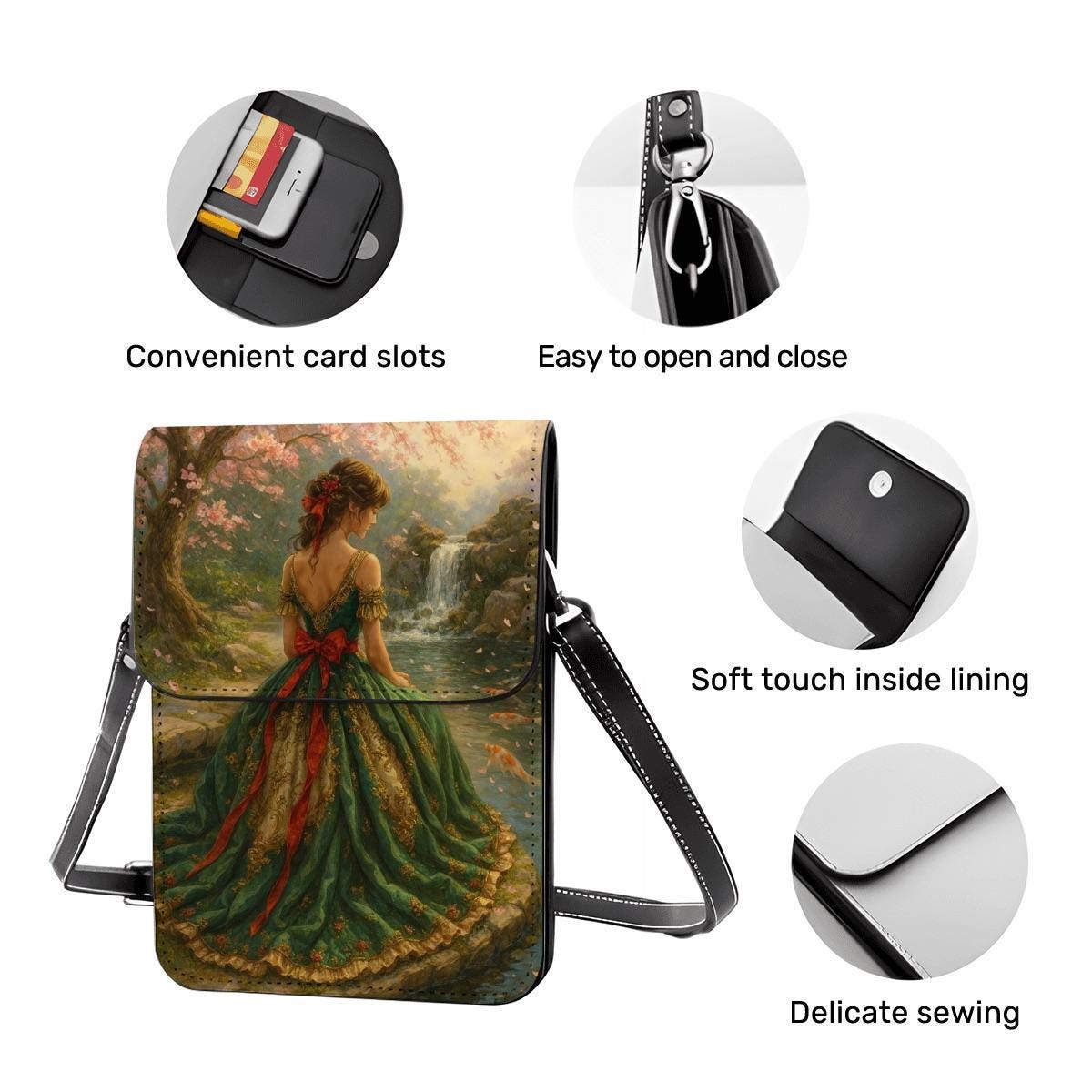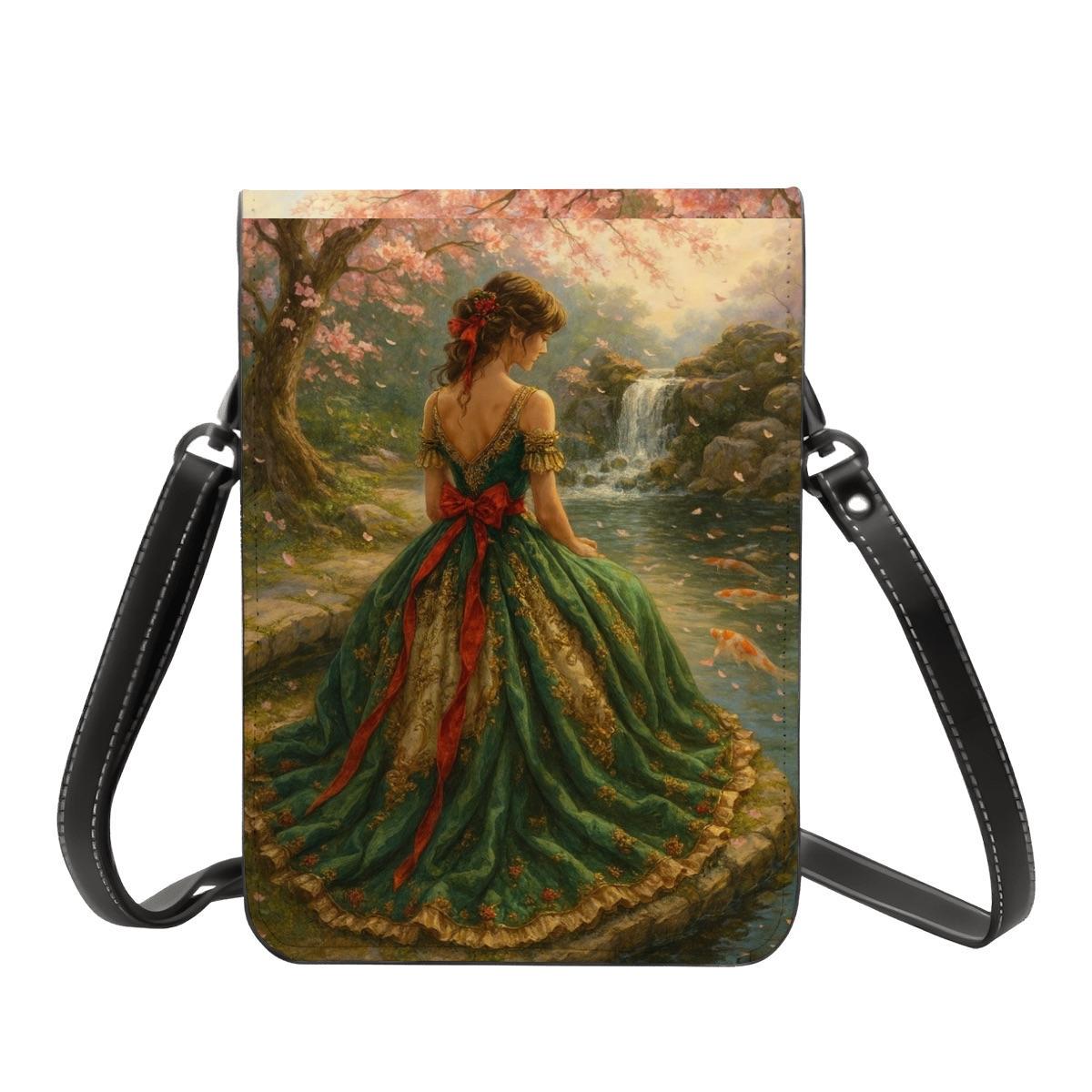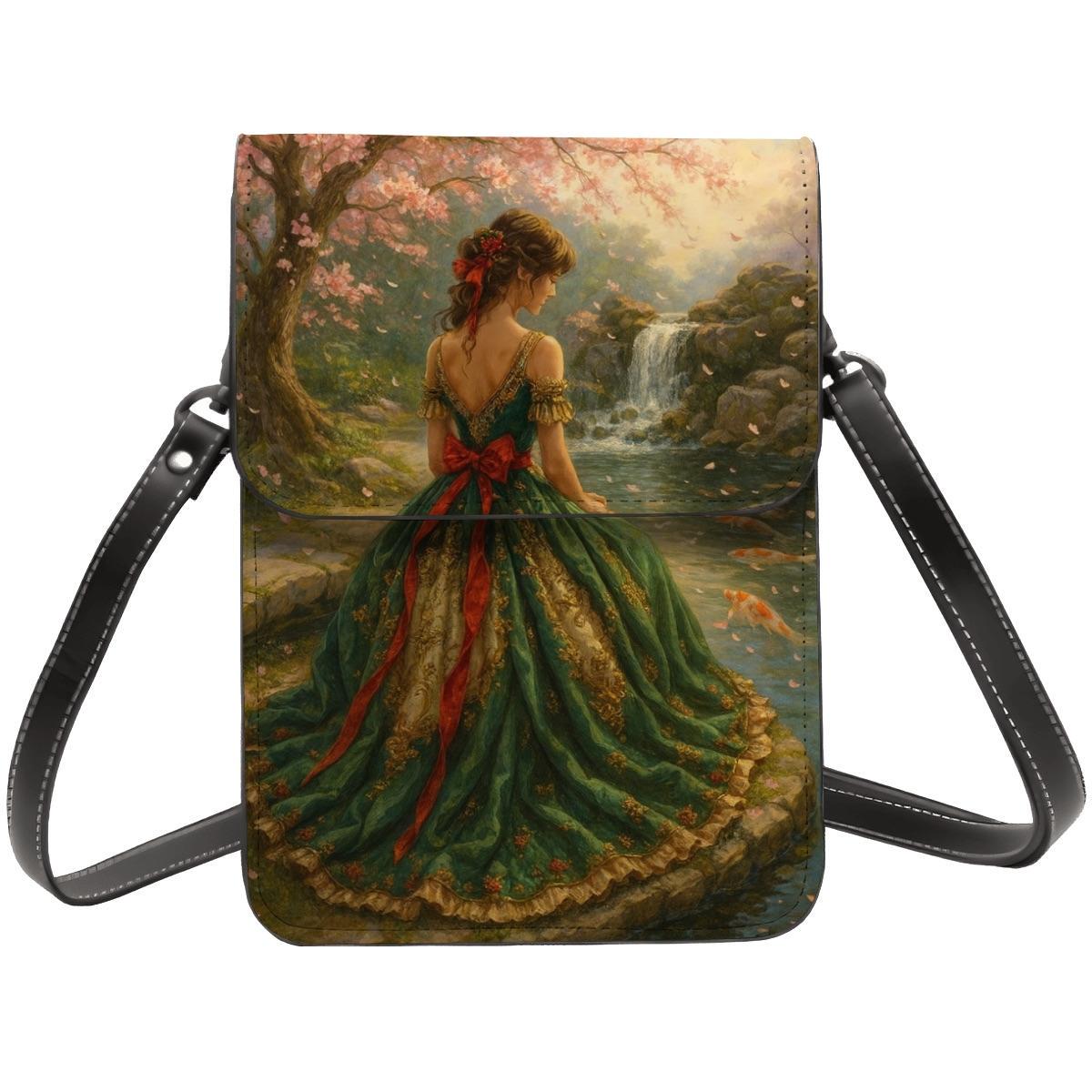 Add timeless elegance to your everyday look with this Victorian lady cell phone purse, featuring a graceful woman in a flowing gown standing in a peaceful koi pond, cherry blossoms, garden landscape. This romantic, vintage-inspired design blends classic beauty with modern functionality, making it a stunning accessory for daily wear or special occasions.