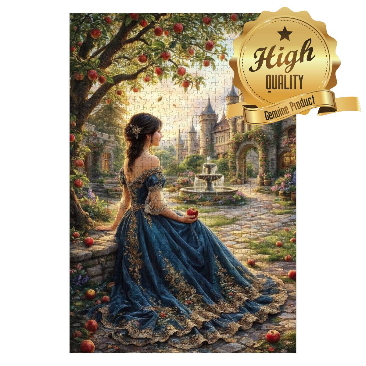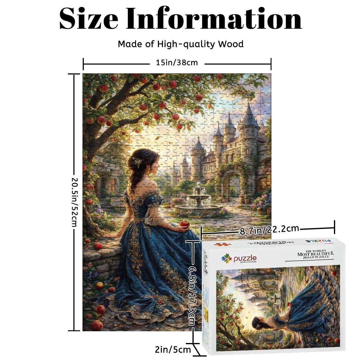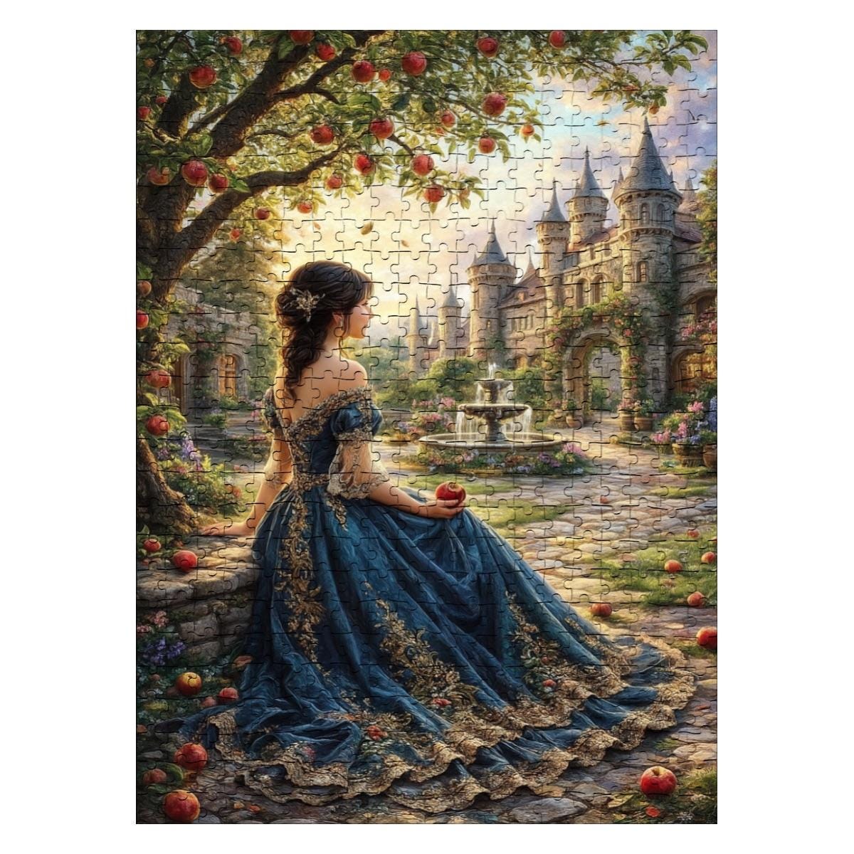 Step into a fairytale moment with this enchanting castle garden scene featuring a graceful woman in flowing blue surrounded by lush greenery and timeless architecture. This premium wooden jigsaw puzzle invites you into a peaceful, storybook escape where every piece feels magical.