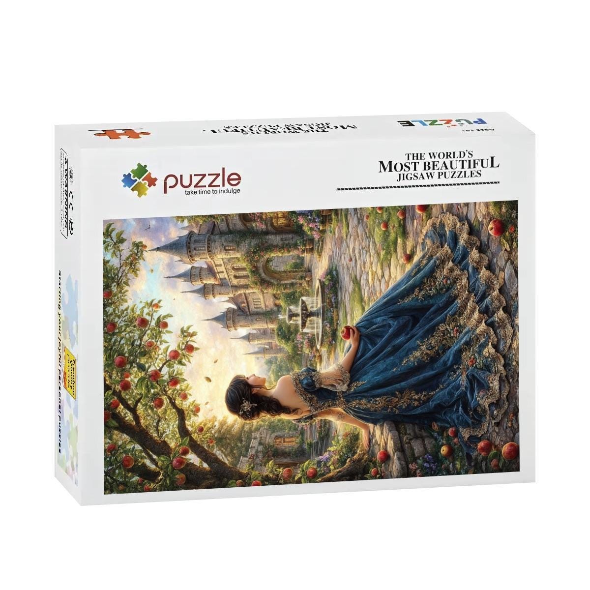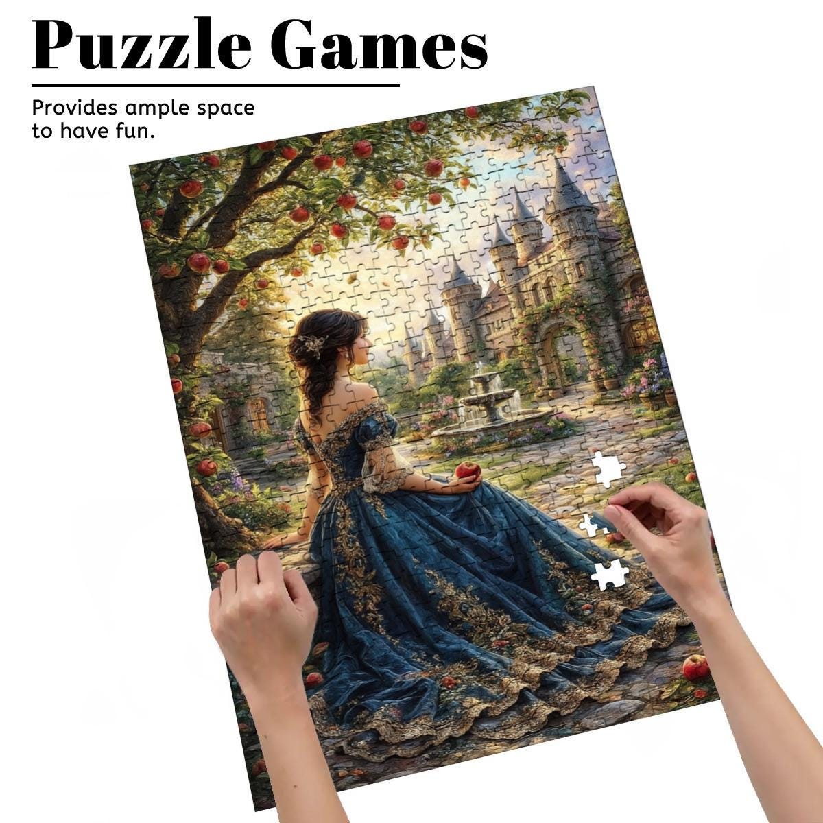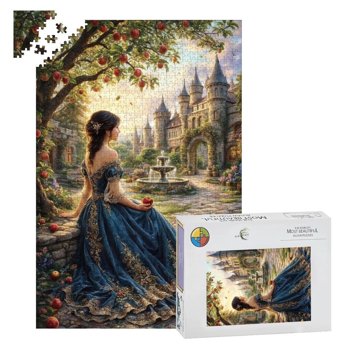 Step into a fairytale moment with this enchanting castle garden scene featuring a graceful woman in flowing blue surrounded by lush greenery and timeless architecture. This premium wooden jigsaw puzzle invites you into a peaceful, storybook escape where every piece feels magical.