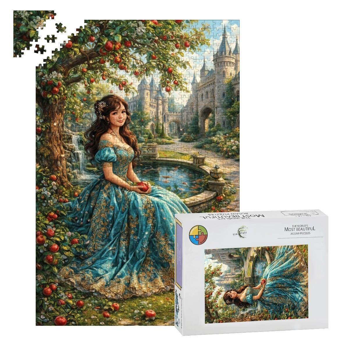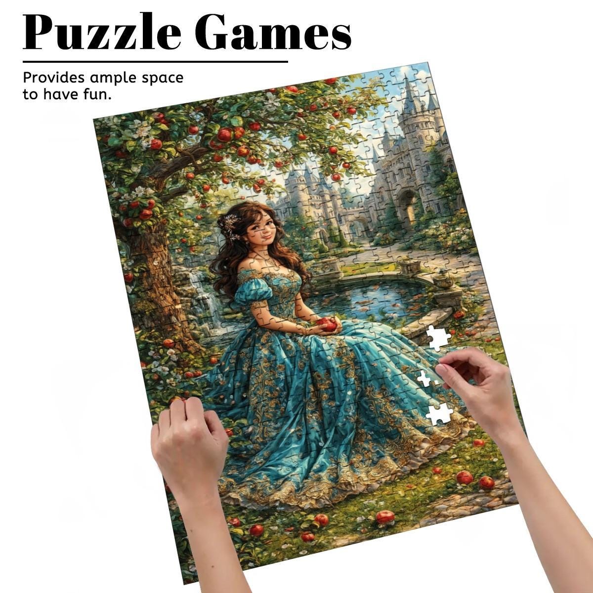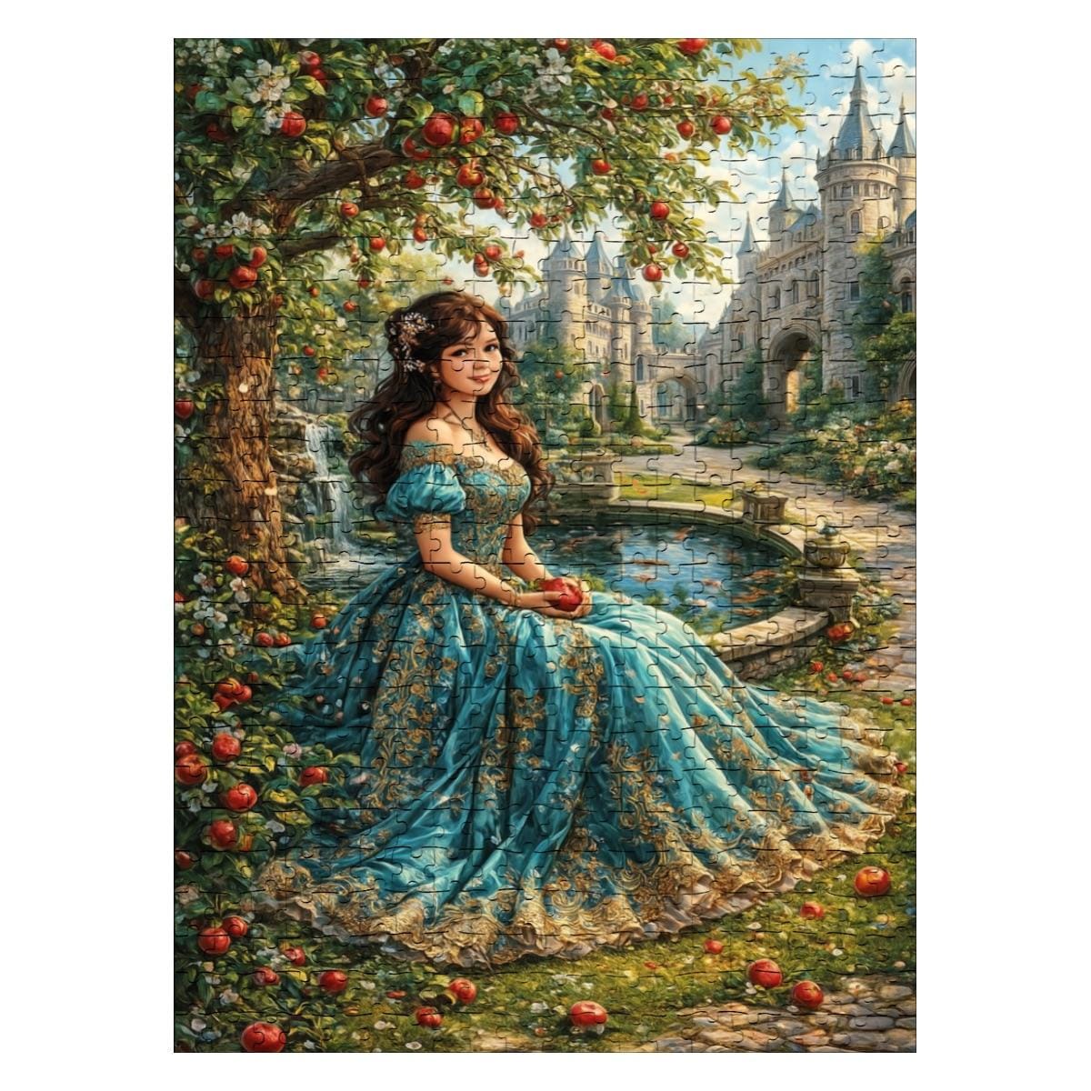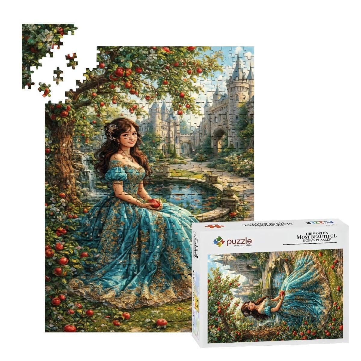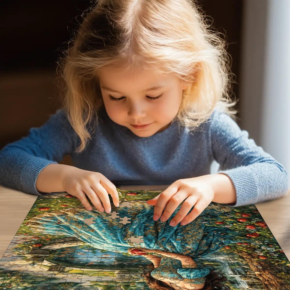 Step into a tranquil fantasy garden where soft light, lush greenery, and a graceful woman in flowing blue create a timeless, storybook scene. This premium wooden jigsaw puzzle offers a calming, immersive experience that feels like assembling a painting piece by piece.