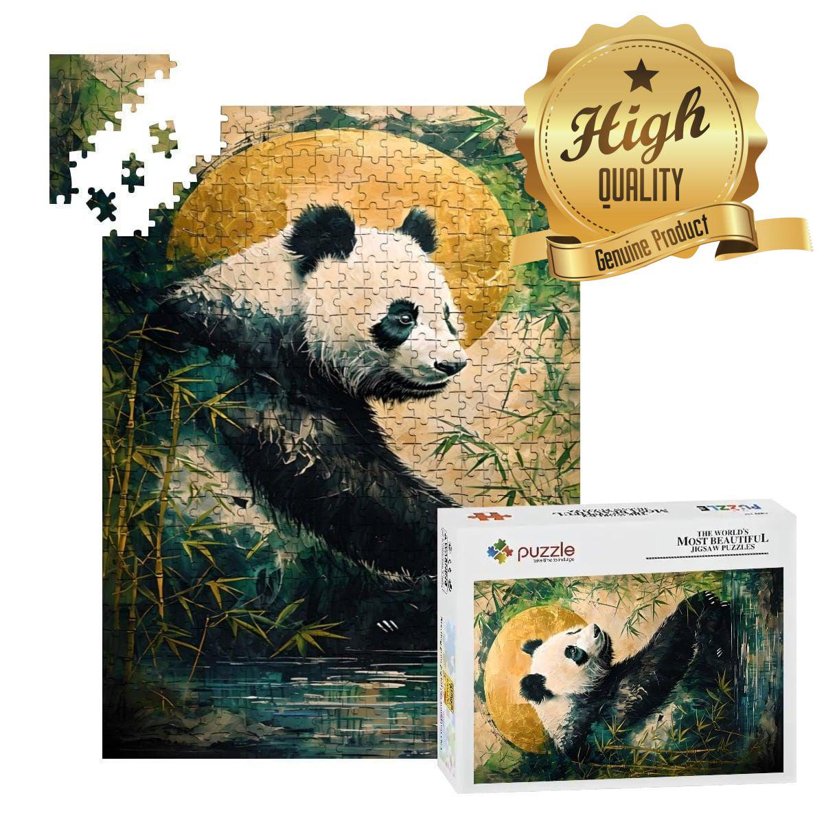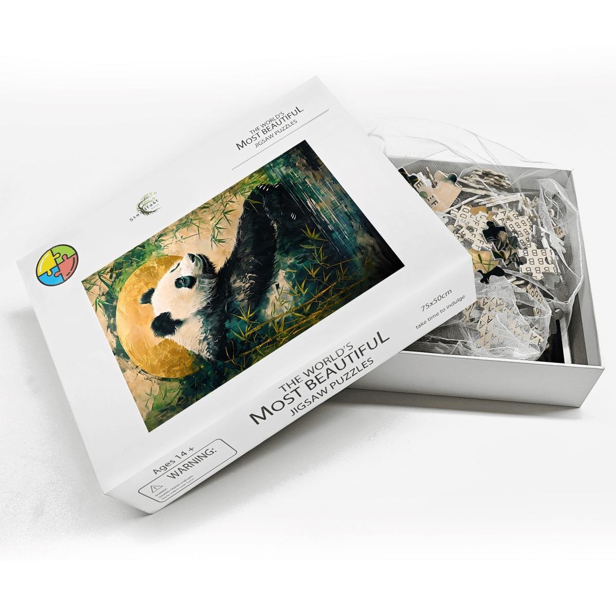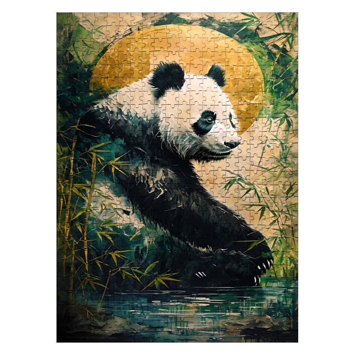 Relax into a peaceful, nature-inspired scene featuring a gentle panda resting among bamboo beneath a glowing golden moon. This calming artwork blends soft textures, earthy tones, and a tranquil mood — making it the perfect escape for mindful puzzling.