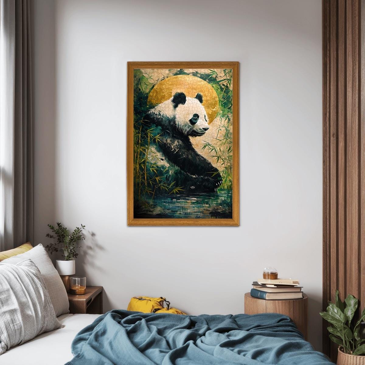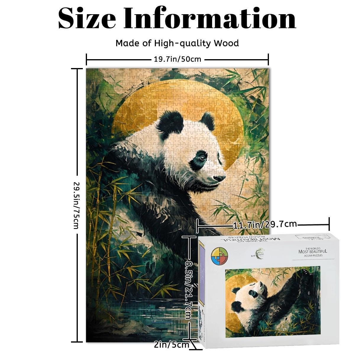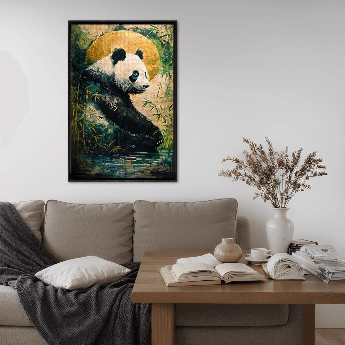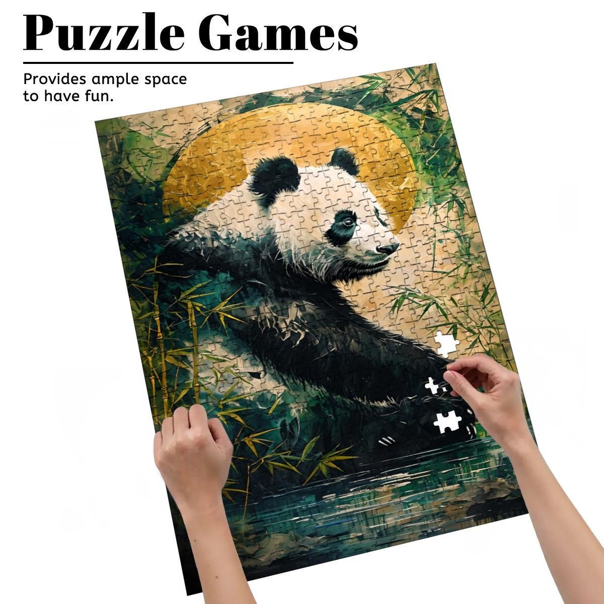 Relax into a peaceful, nature-inspired scene featuring a gentle panda resting among bamboo beneath a glowing golden moon. This calming artwork blends soft textures, earthy tones, and a tranquil mood — making it the perfect escape for mindful puzzling.