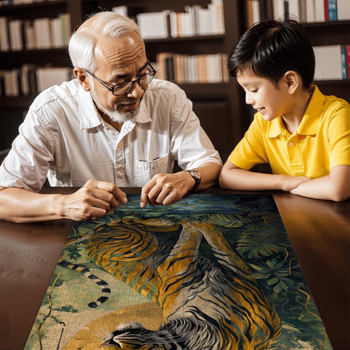 Bring strength, calm, and mystery to your puzzle time with this striking majestic tiger artwork set beneath a glowing golden moon. Rich textures, deep jungle tones, and expressive detail make this wooden jigsaw puzzle both a rewarding challenge and a stunning piece of art.