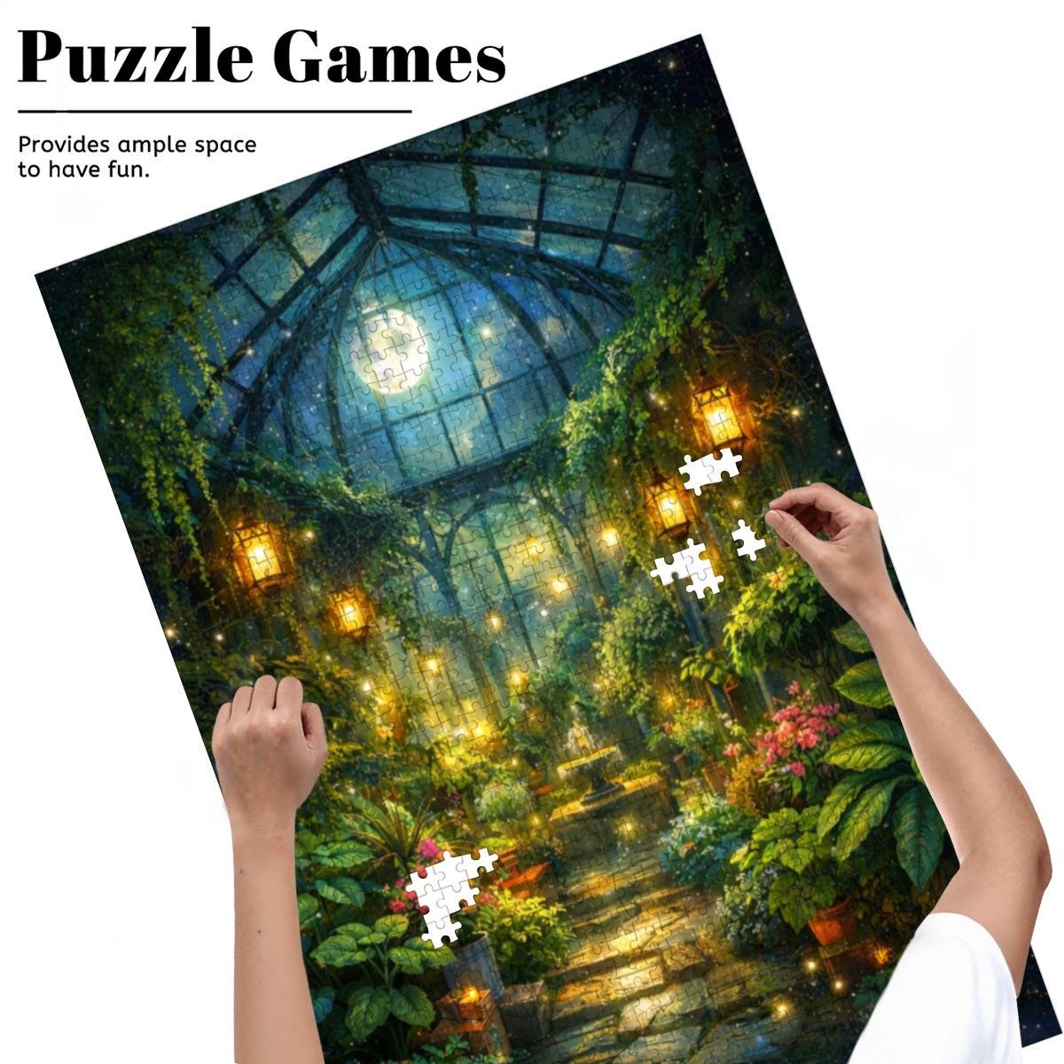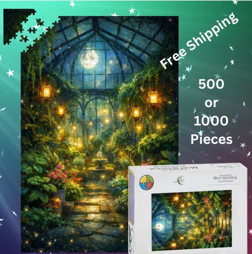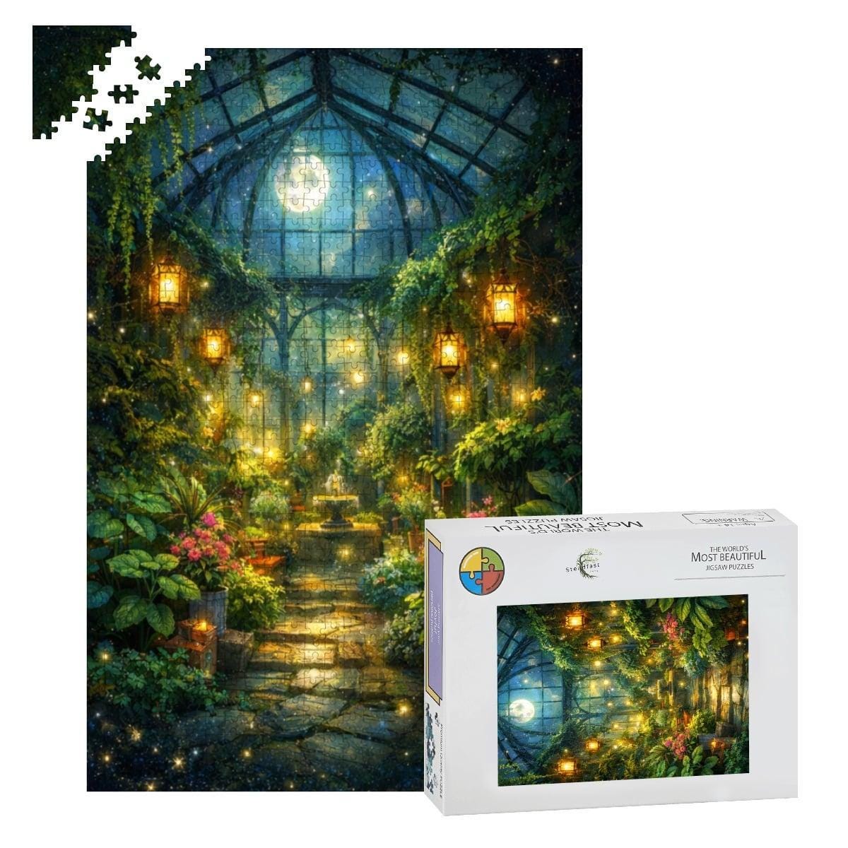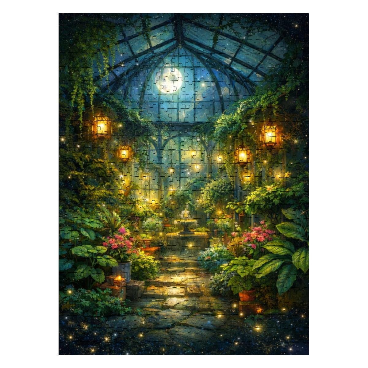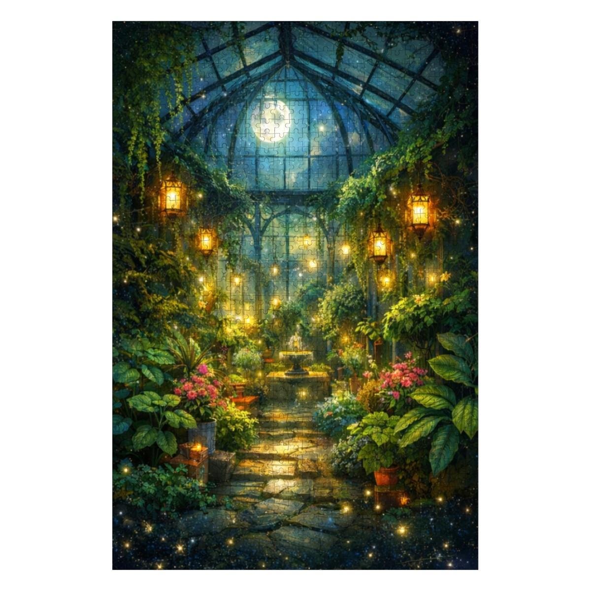 This dreamy artwork features a moonlit greenhouse filled with lush plants, glowing lanterns, and a tranquil garden pathway, creating a calming and immersive puzzle experience. Designed for adults and experienced puzzlers, it offers both a rewarding challenge and a breathtaking finished piece that can be framed as wall art.