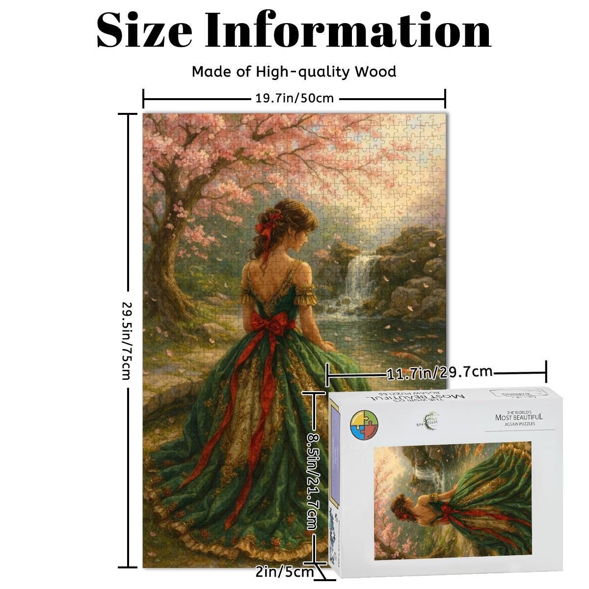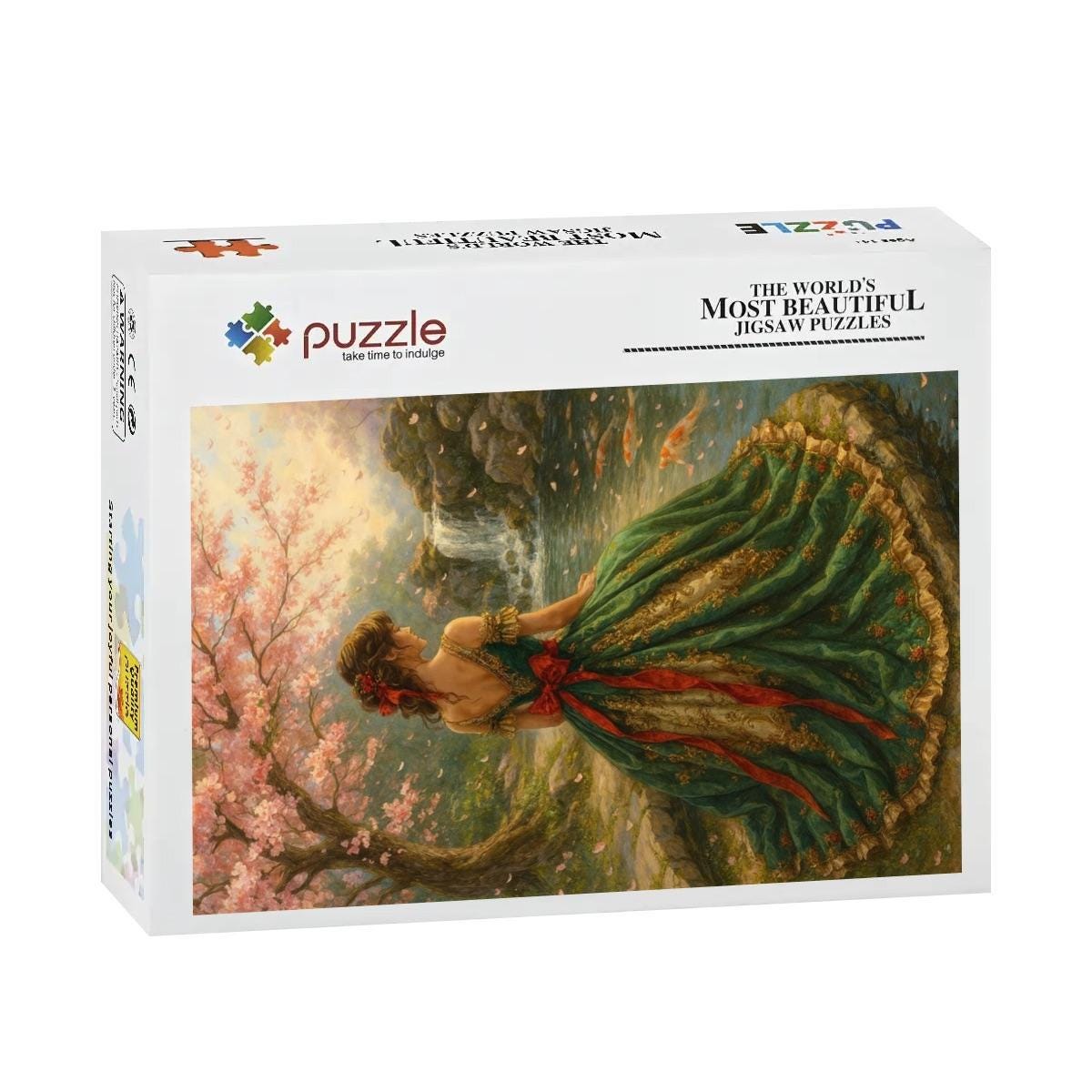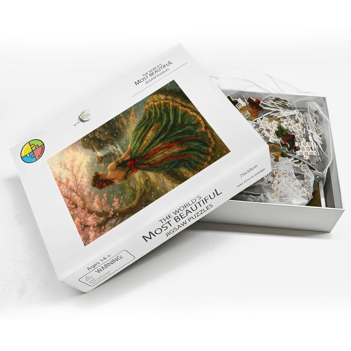 Step into a soft, romantic springtime scene featuring a graceful woman in a flowing green gown surrounded by blooming trees, gentle light, and a peaceful stream. Painterly details and lush florals create a timeless artwork that feels calming, elegant, and immersive as you assemble it piece by piece.