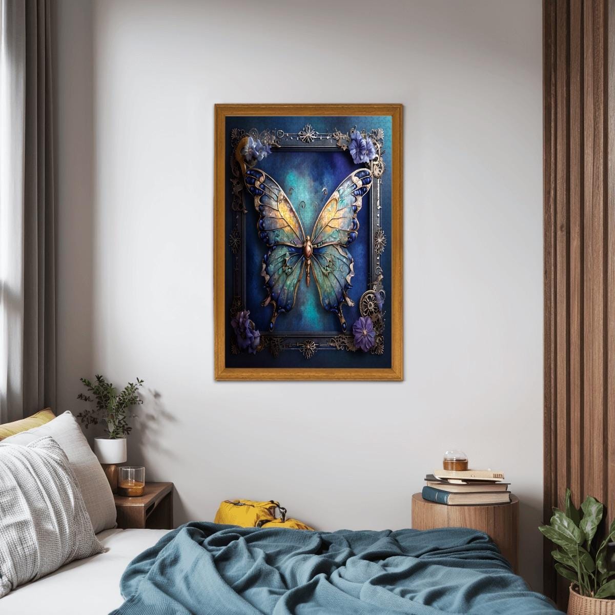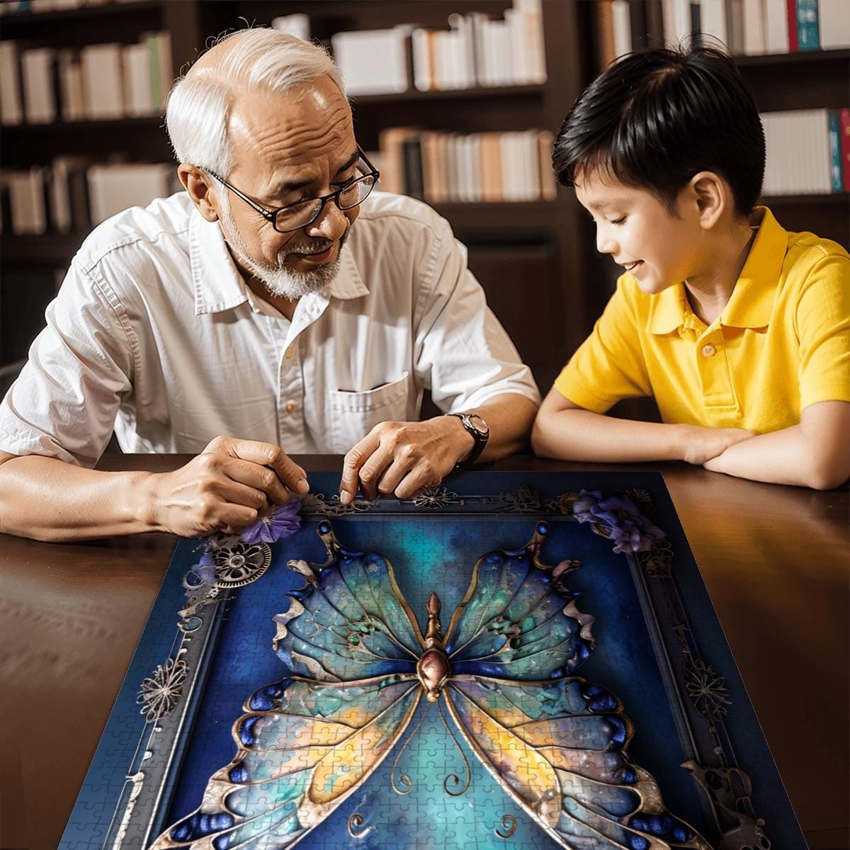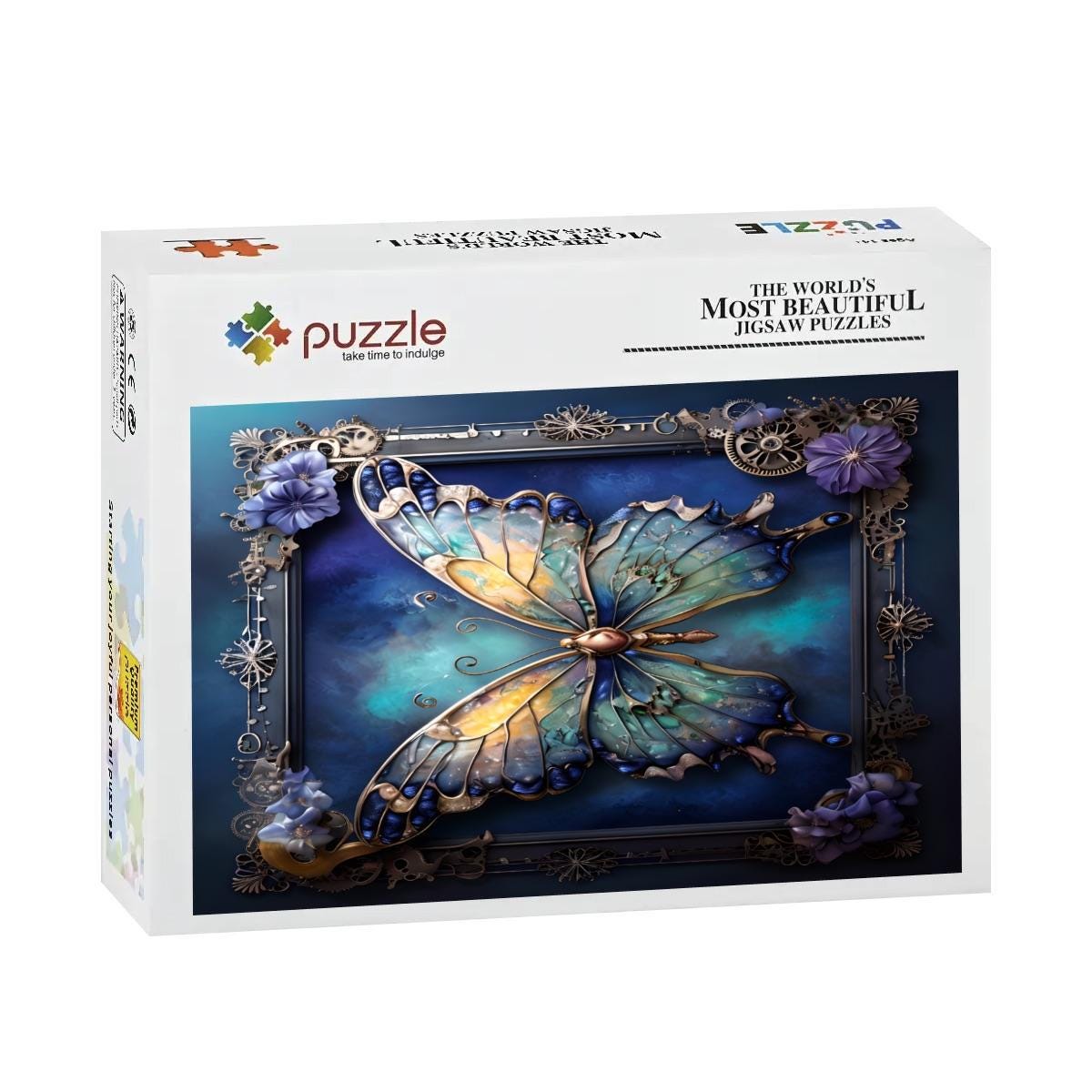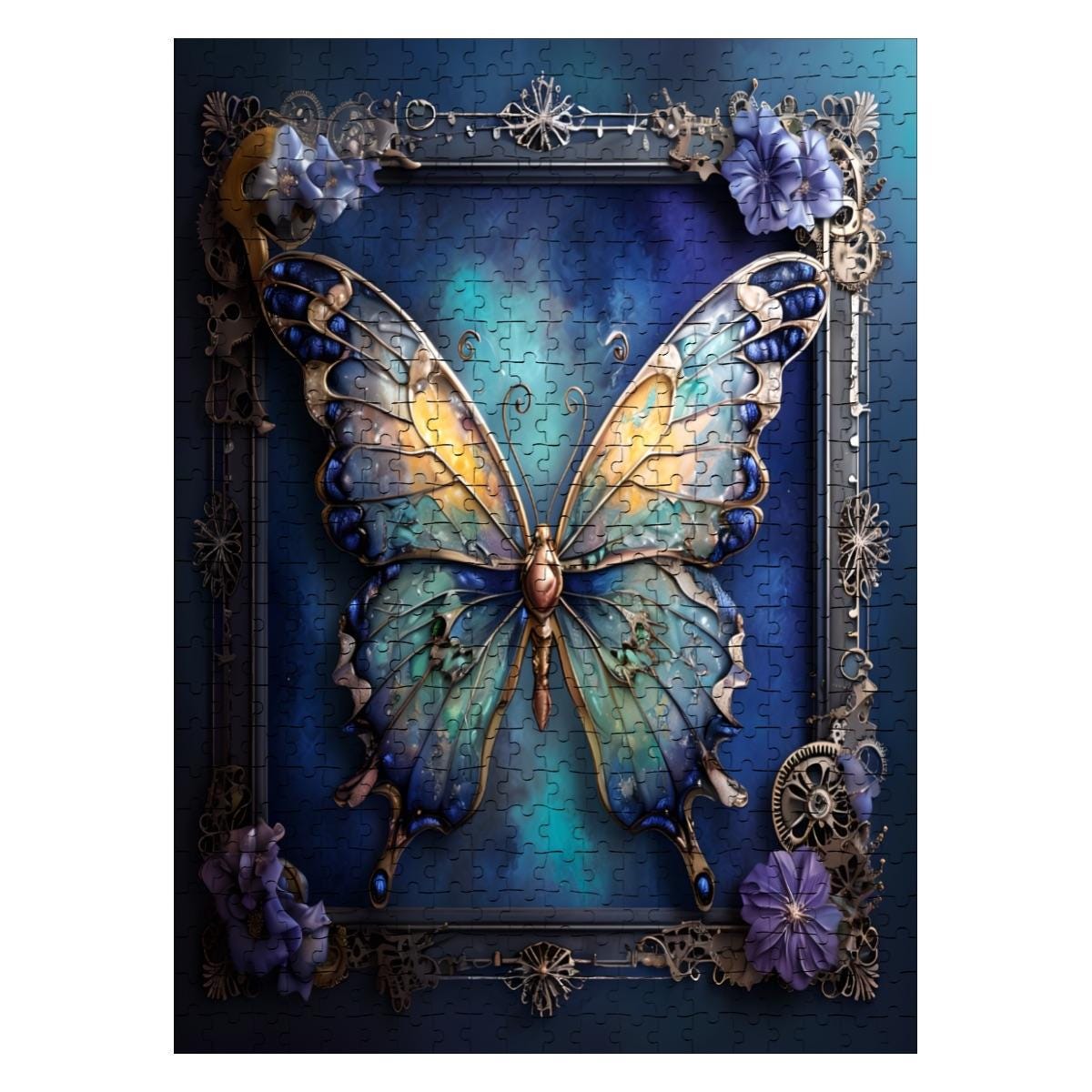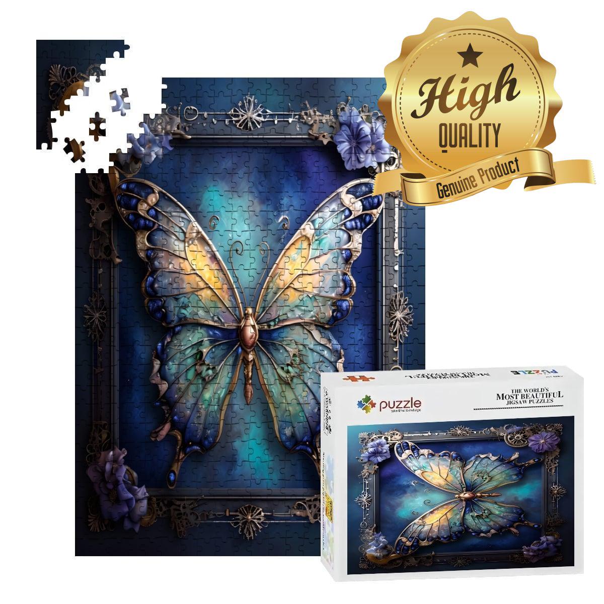 Escape into a deep, magical blue with this stunning mystical butterfly artwork, framed by ornate details and glowing jewel tones. Elegant, calming, and richly detailed, this puzzle creates a soothing yet captivating experience as each piece brings the butterfly to life.