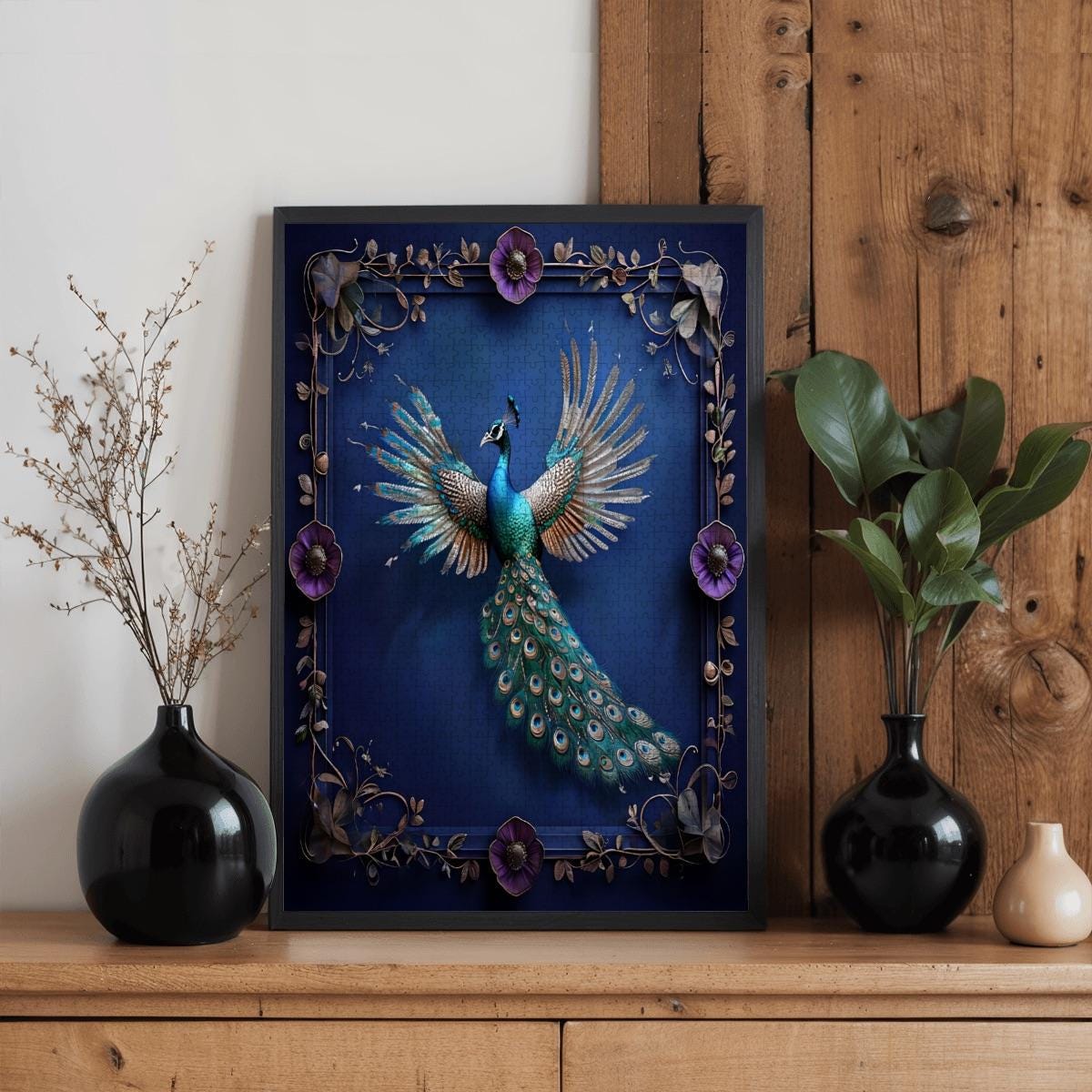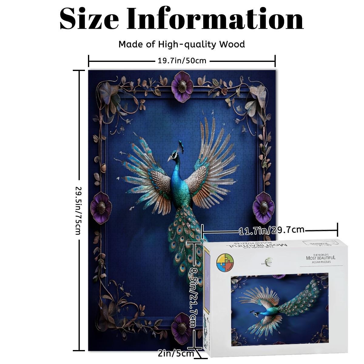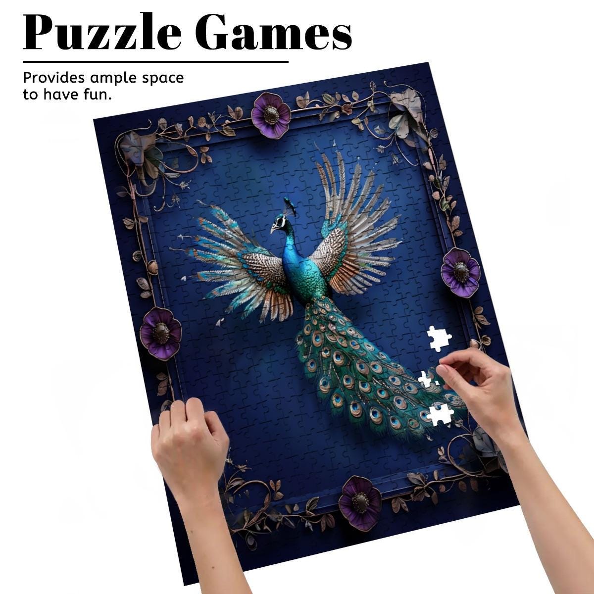 Unfold a breathtaking fantasy scene featuring a radiant peacock with outstretched wings, glowing jewel tones, and ornate detailing set against a deep midnight blue background. Elegant, powerful, and calming, this artwork transforms puzzling into a truly immersive experience.
