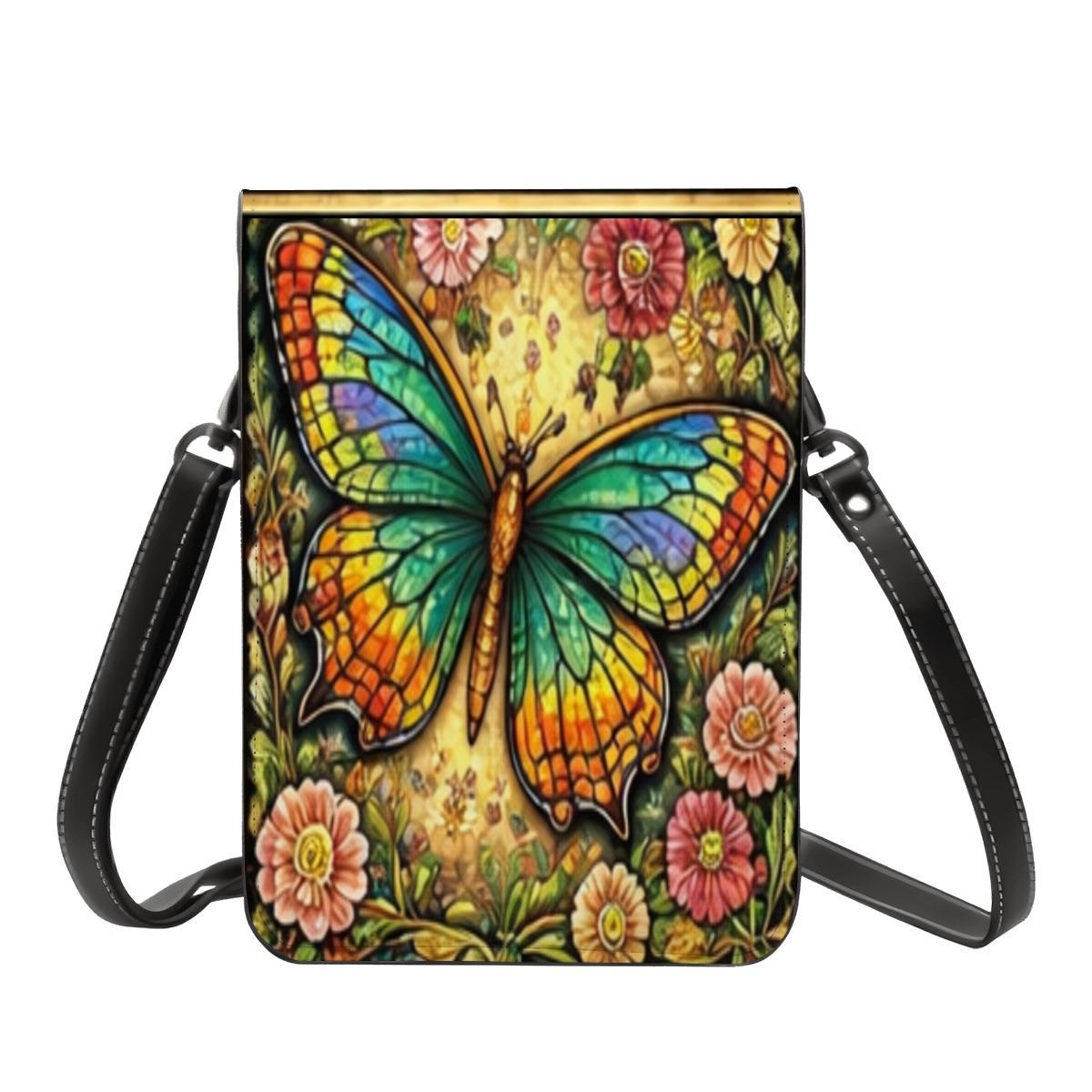 Add color and elegance to your everyday look with this stained-glass butterfly cell phone purse. Featuring a vibrant butterfly set against a warm floral background, this compact crossbody bag blends nature-inspired art with practical everyday function.