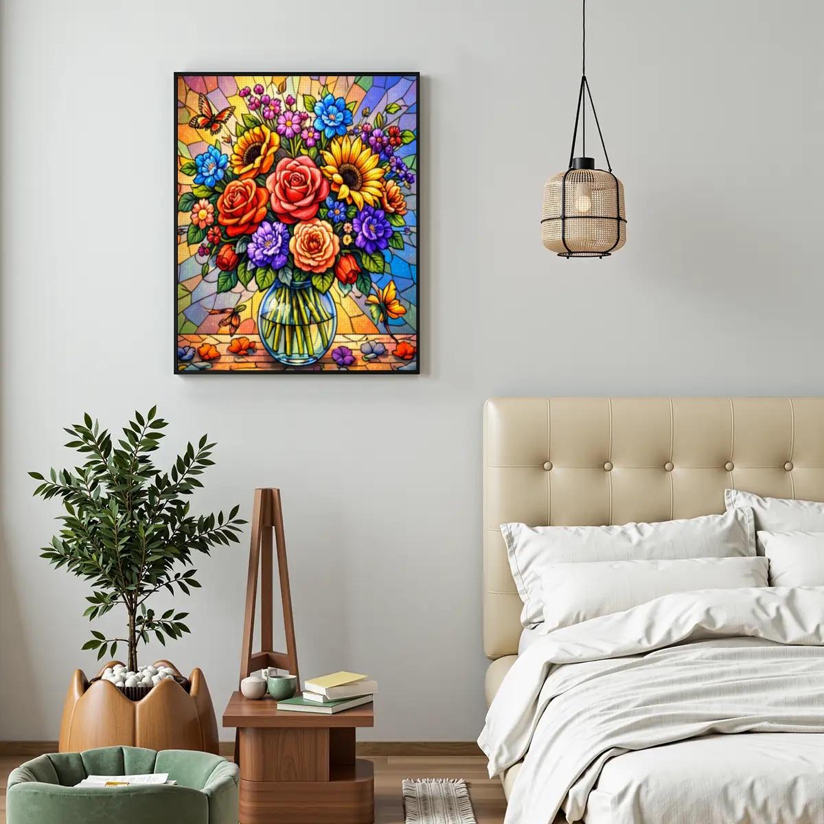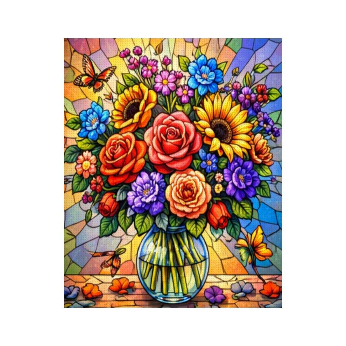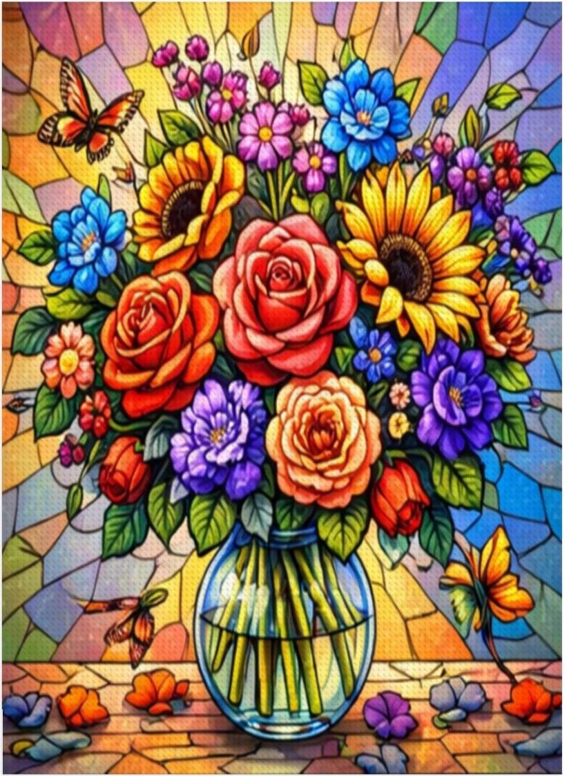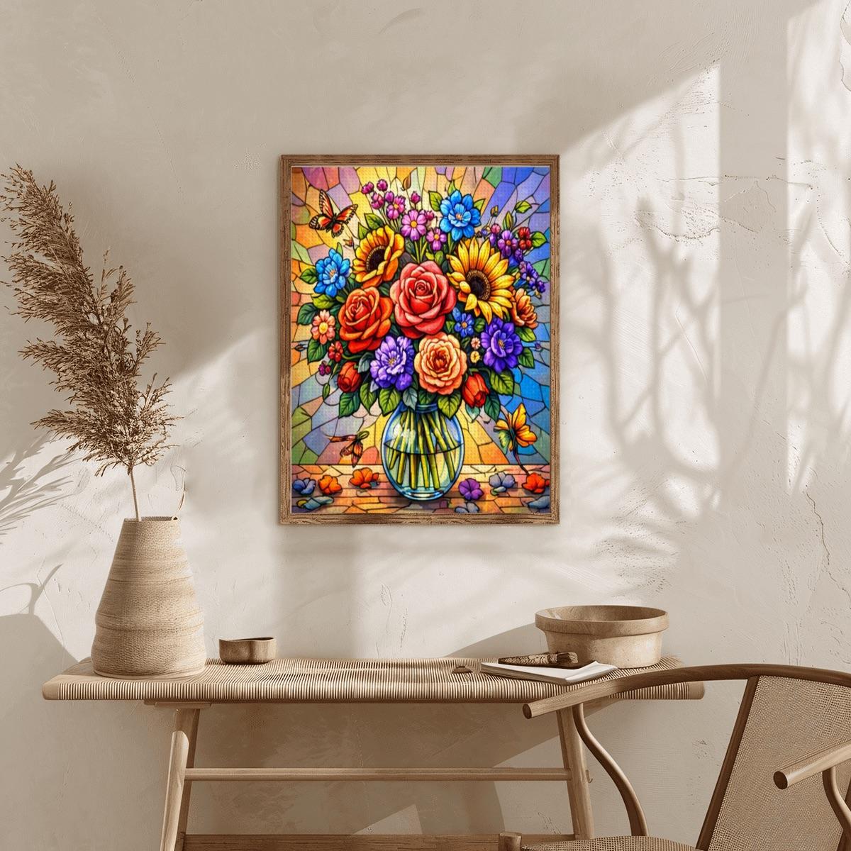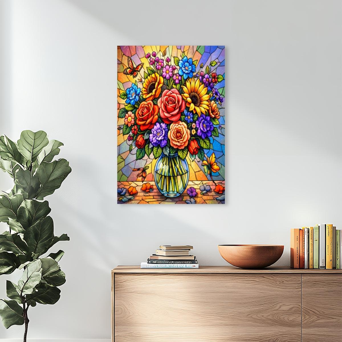 Create a bold and colorful piece of wall art with this Stained Glass Floral Diamond Painting Kit, featuring a vibrant bouquet of flowers arranged in a clear vase with a stained-glass style background. The rich colors and detailed design make this full-drill canvas an enjoyable and rewarding craft project.