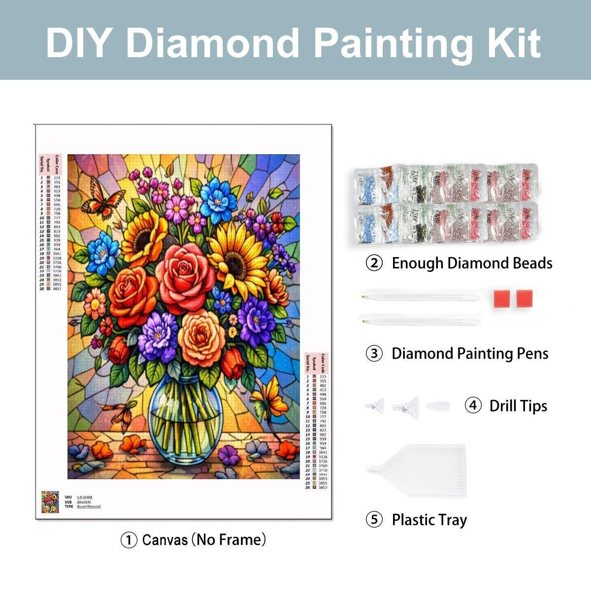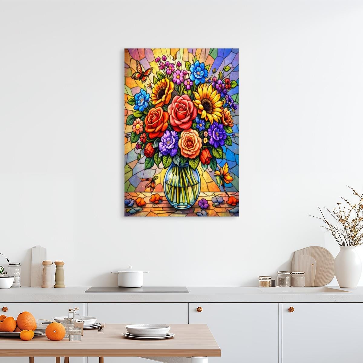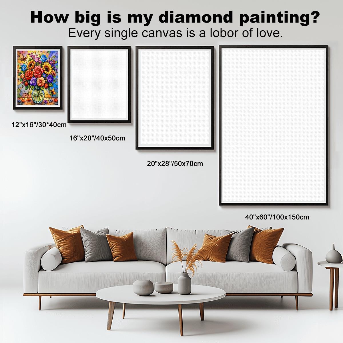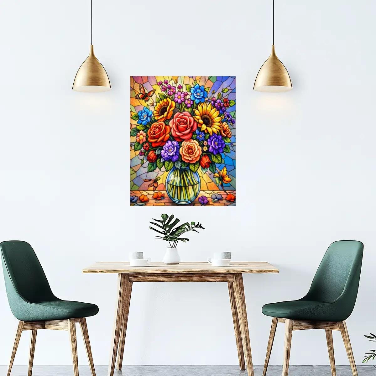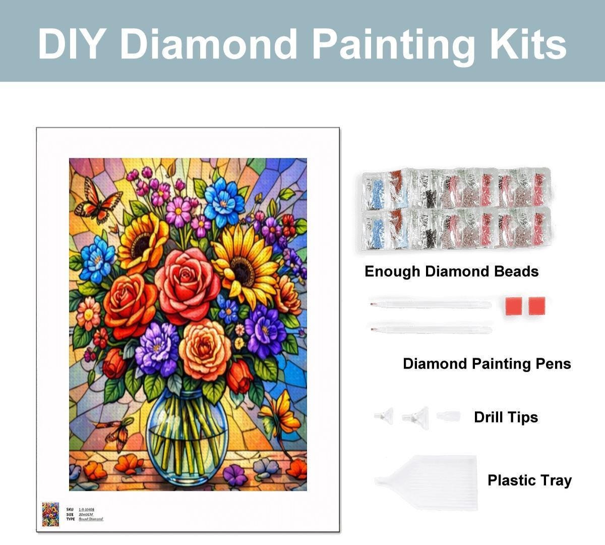 Create a bold and colorful piece of wall art with this Stained Glass Floral Diamond Painting Kit, featuring a vibrant bouquet of flowers arranged in a clear vase with a stained-glass style background. The rich colors and detailed design make this full-drill canvas an enjoyable and rewarding craft project.