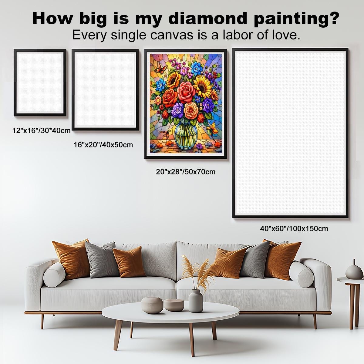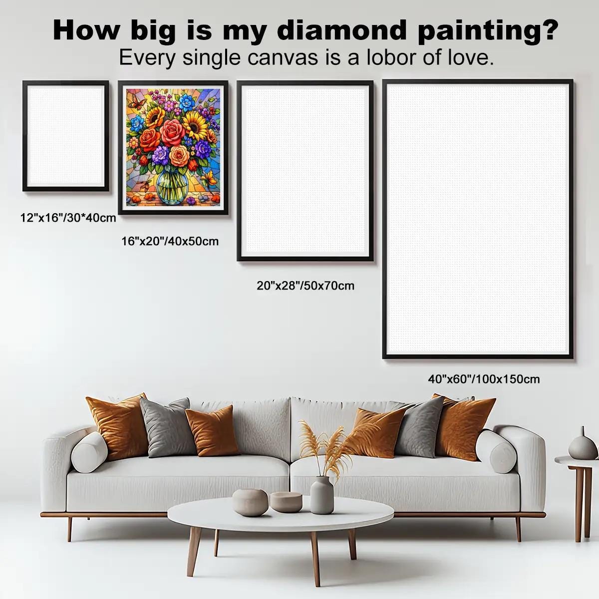 Finished artwork can be framed and displayed in living rooms, bedrooms, offices, or craft spaces.