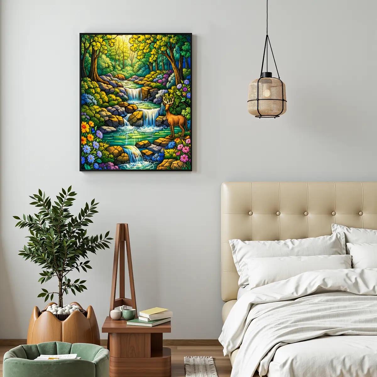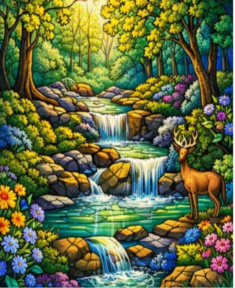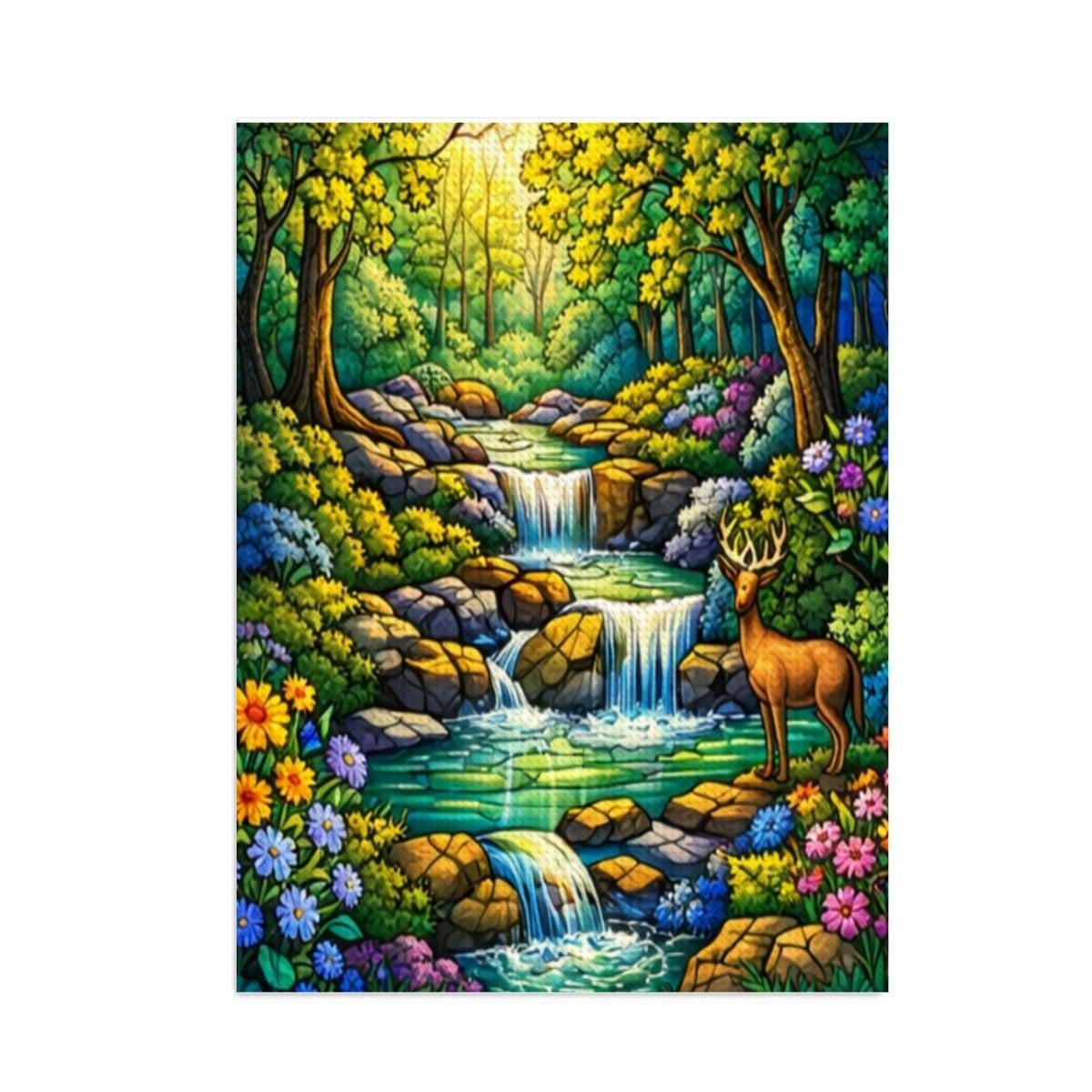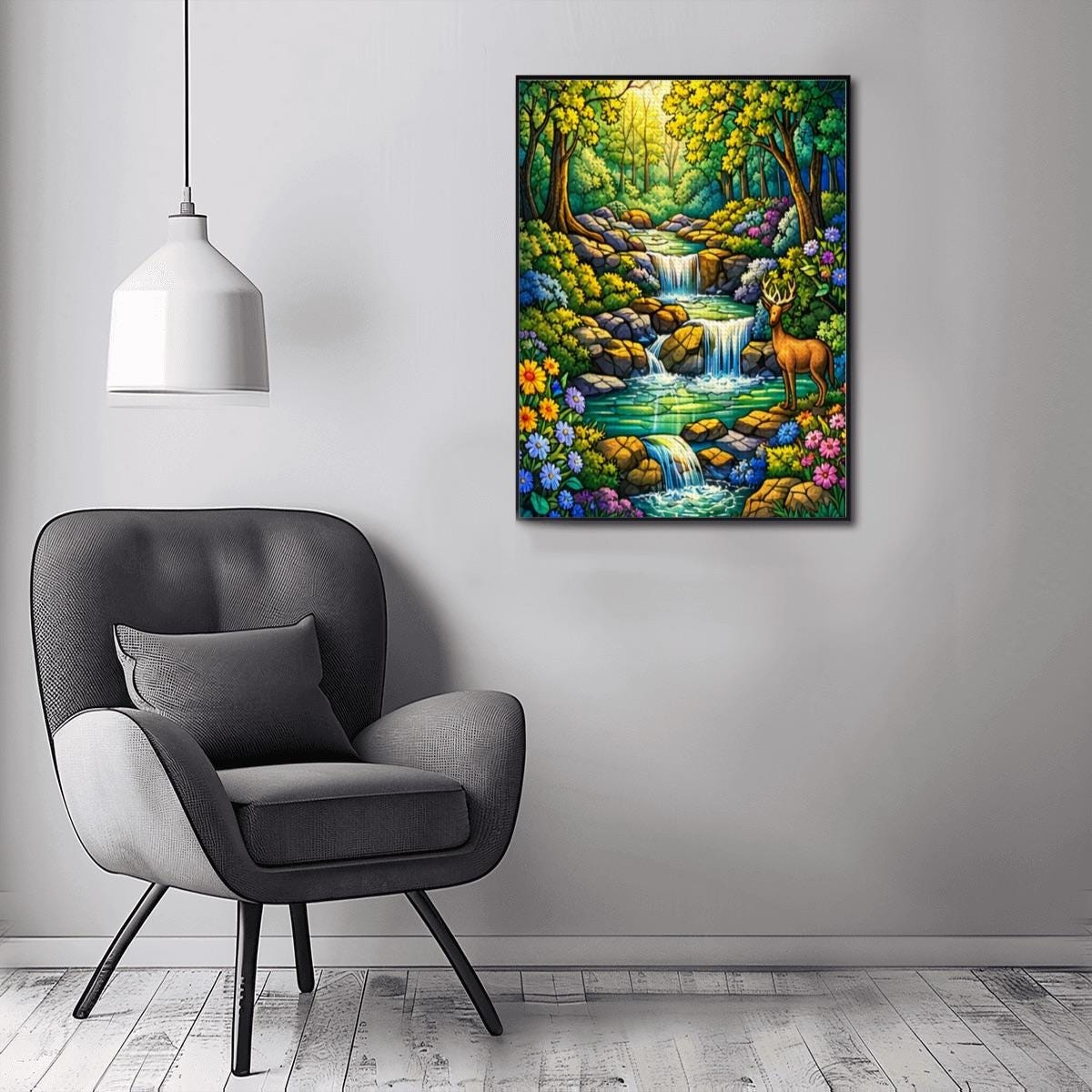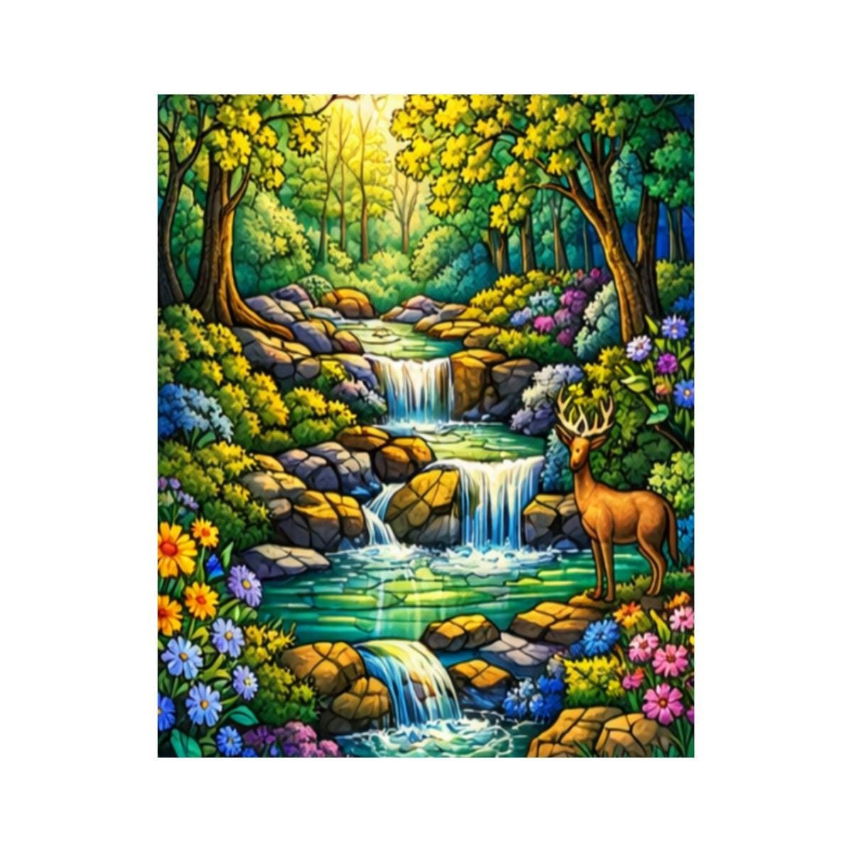 Create a detailed nature scene with this Stained Glass Forest Diamond Painting Kit, featuring a peaceful woodland stream with cascading waterfalls, vibrant wildflowers, and a graceful deer standing among the trees. Designed in a stained-glass style, this full-drill canvas offers bold color sections and clear detail for an enjoyable crafting experience.