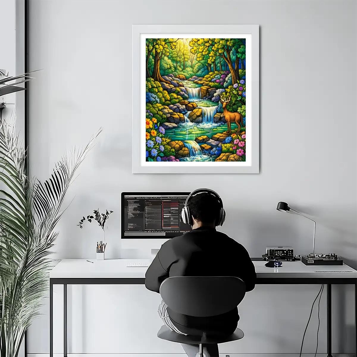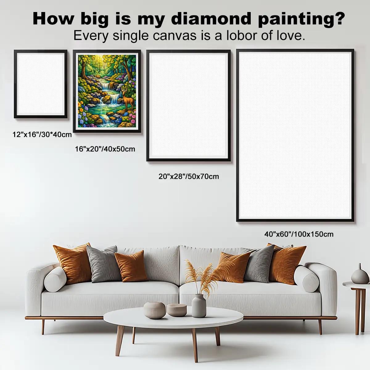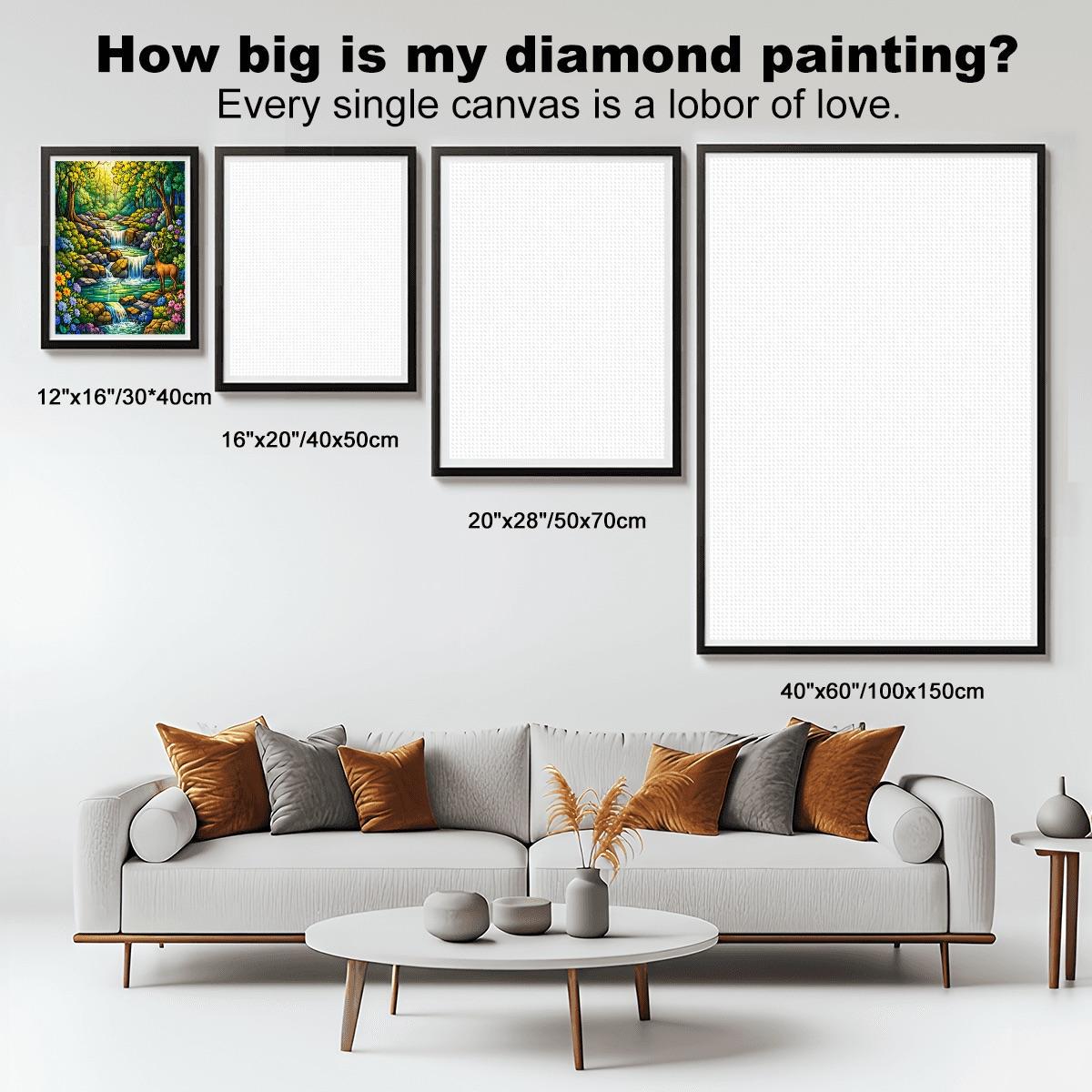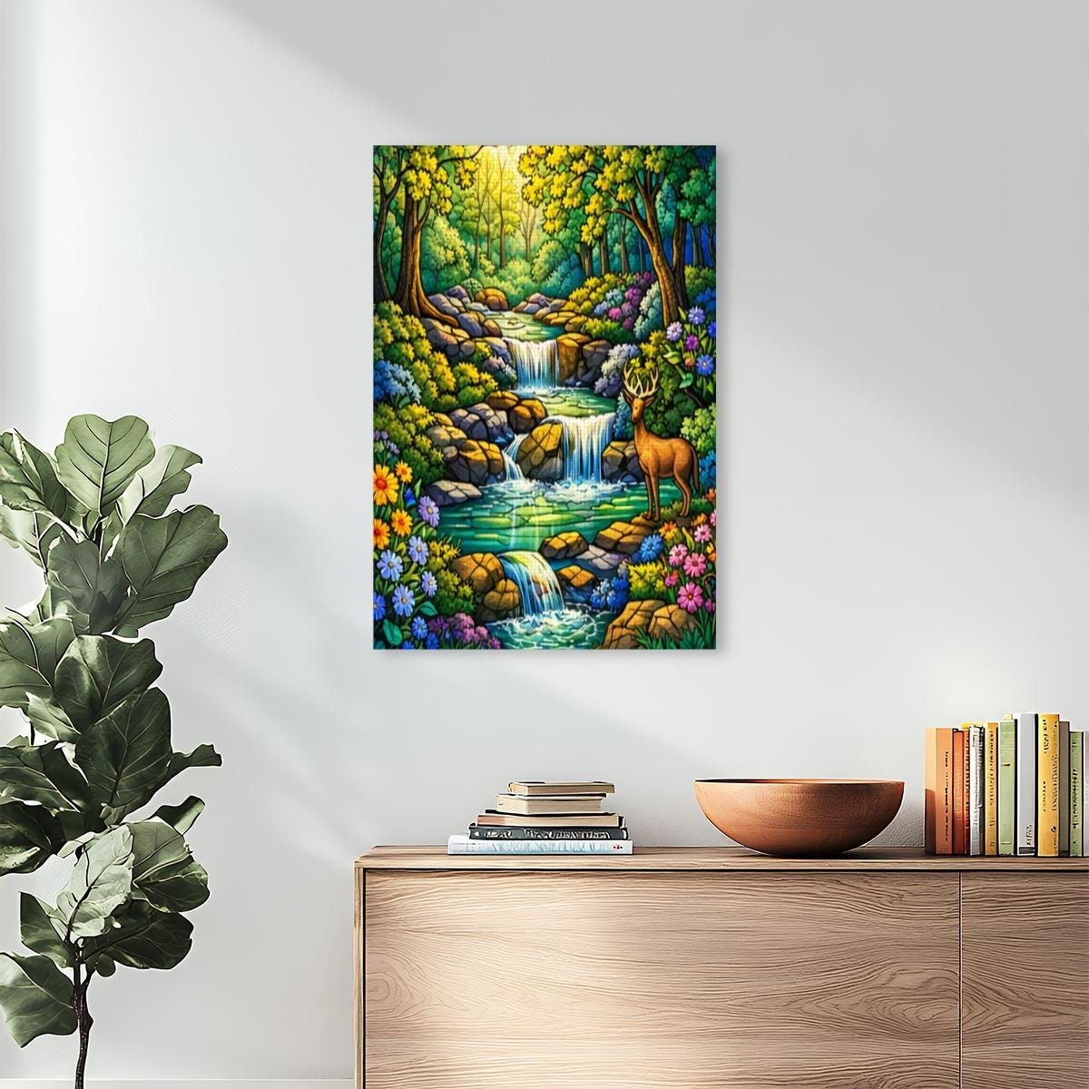 Create a detailed nature scene with this Stained Glass Forest Diamond Painting Kit, featuring a peaceful woodland stream with cascading waterfalls, vibrant wildflowers, and a graceful deer standing among the trees. Designed in a stained-glass style, this full-drill canvas offers bold color sections and clear detail for an enjoyable crafting experience.