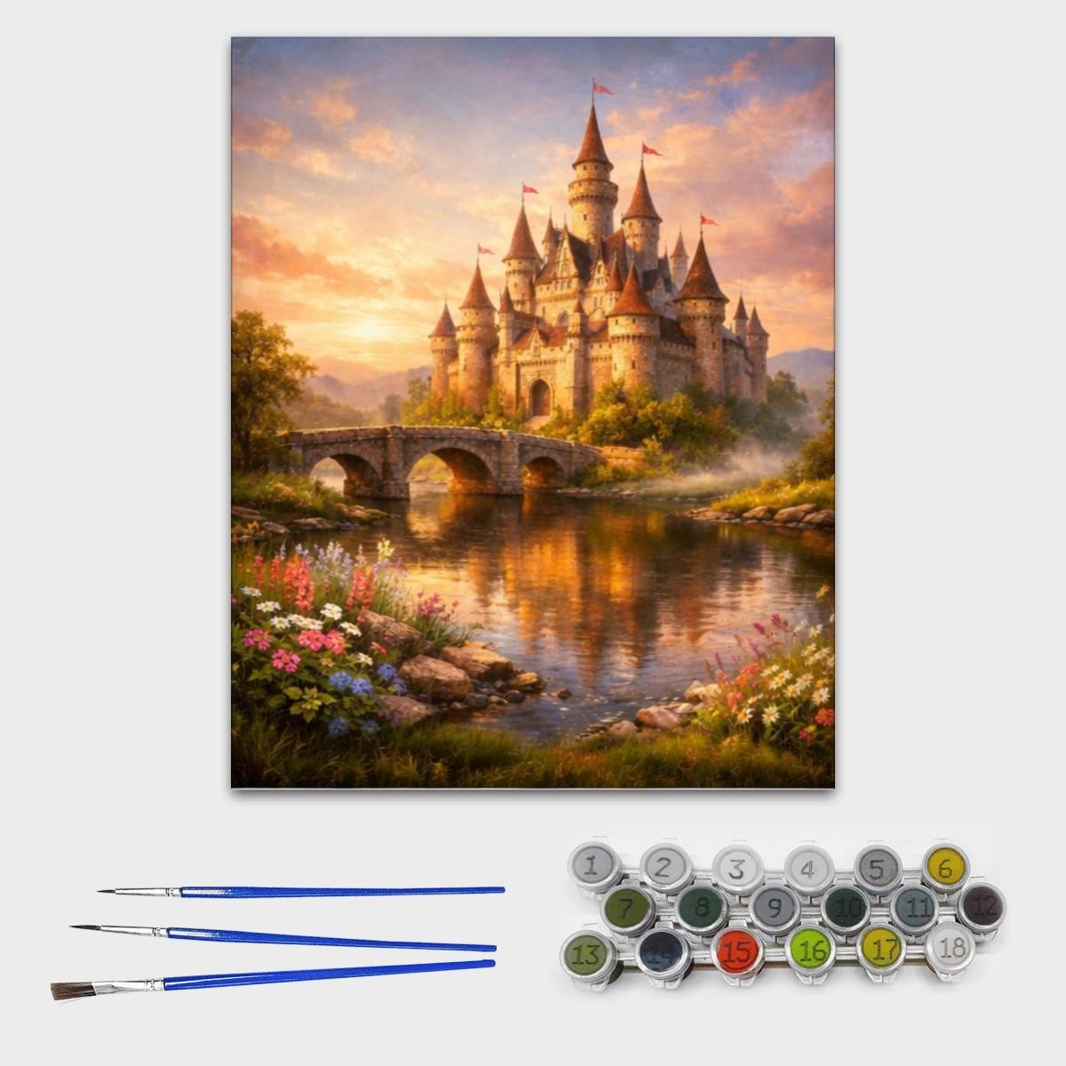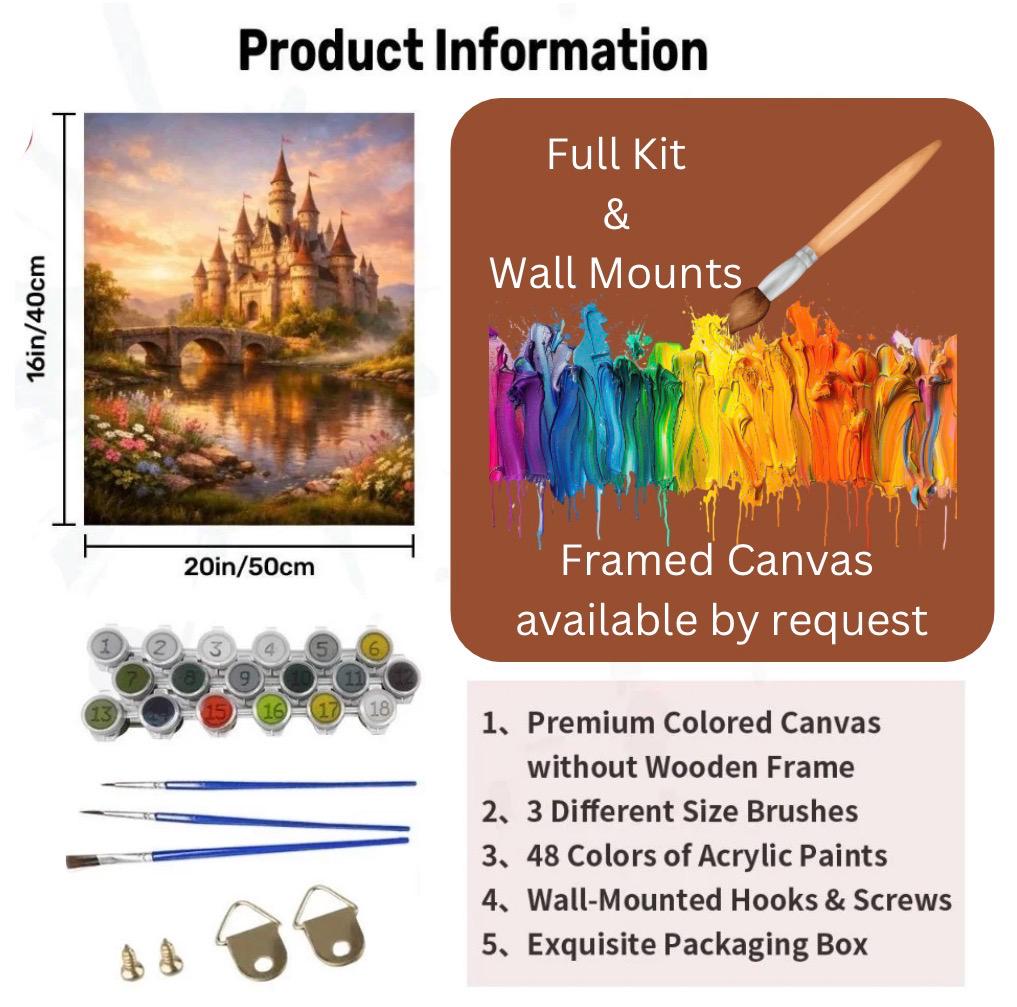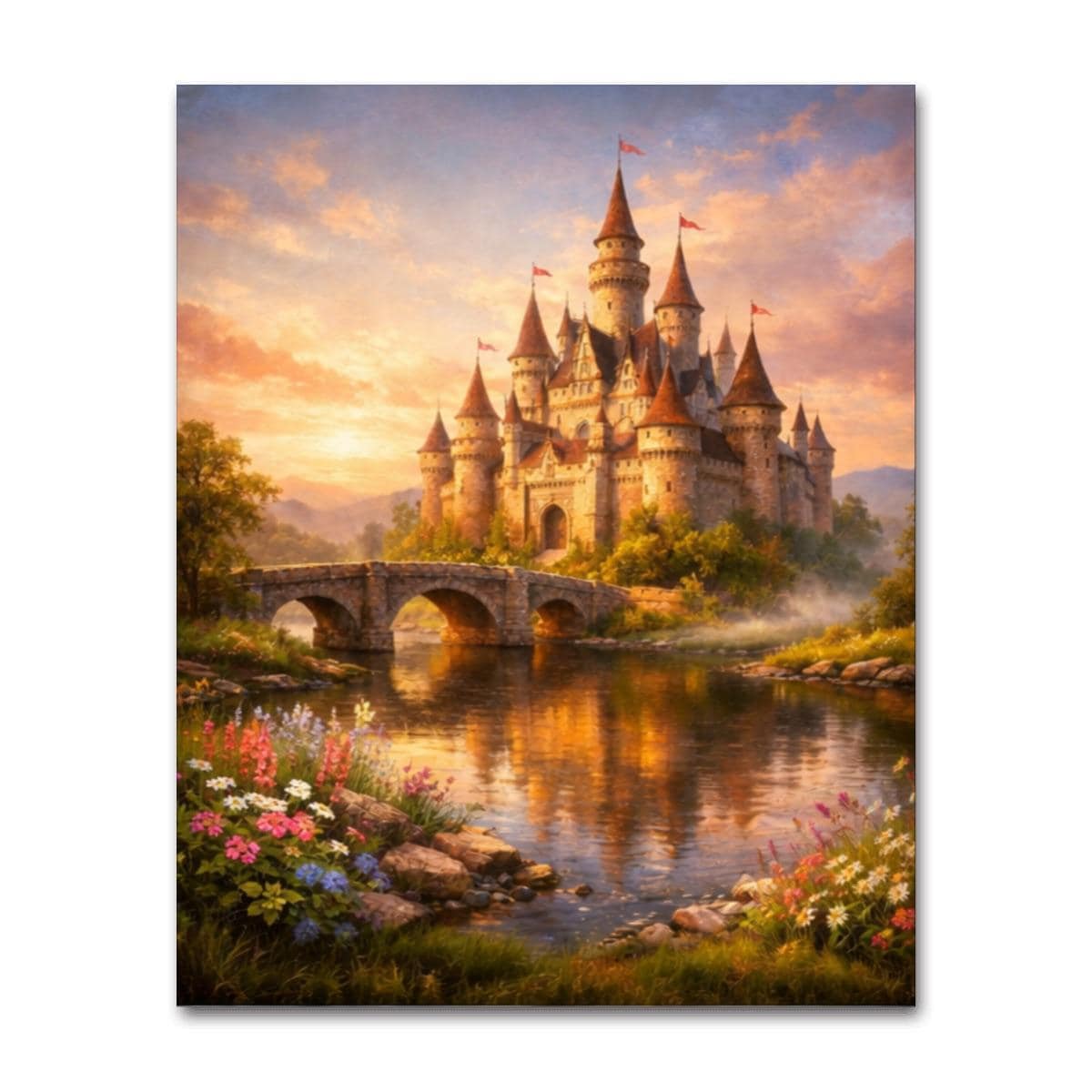 Create your own fairytale masterpiece with this Fantasy Castle Paint by Number Canvas Kit. Featuring a magical castle set beside a peaceful river and glowing sunset sky, this enchanting design is professionally printed in high definition on premium canvas for rich texture and beautiful detail.