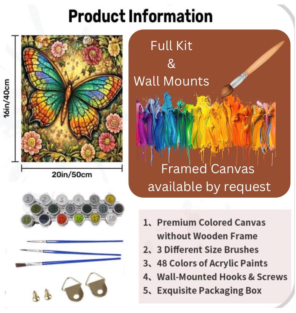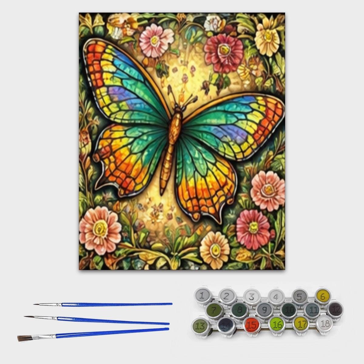 Bring calm, creativity, and vibrant color into your space with this Butterfly Paint by Number Canvas Kit. This relaxing DIY art project features a detailed butterfly surrounded by floral elements, professionally printed in high definition on premium canvas for a rich, textured finish.