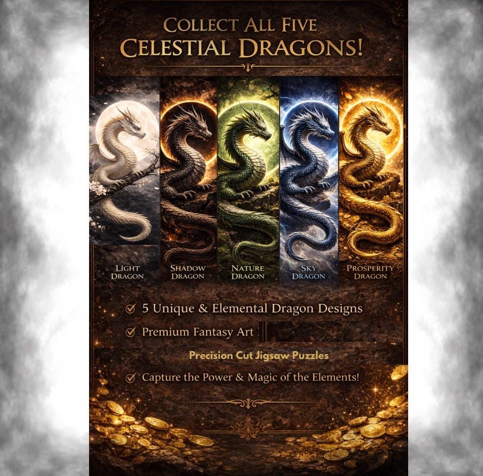 This fantasy puzzle collection features five uniquely themed celestial dragons, each representing a different elemental force. Designed for adults and fantasy art lovers, these puzzles offer a rewarding challenge and a stunning finished piece worthy of display.