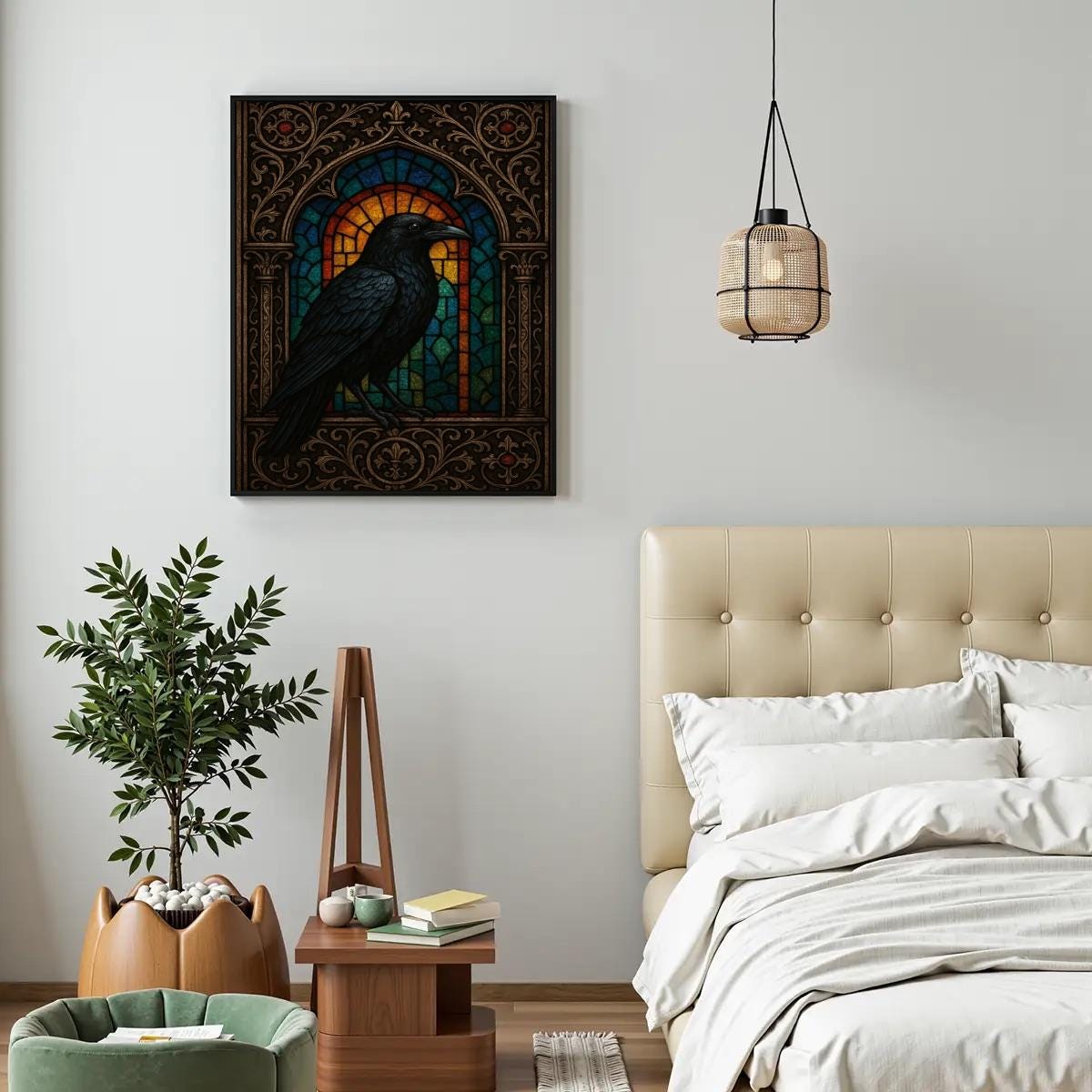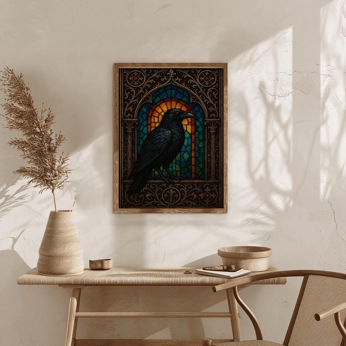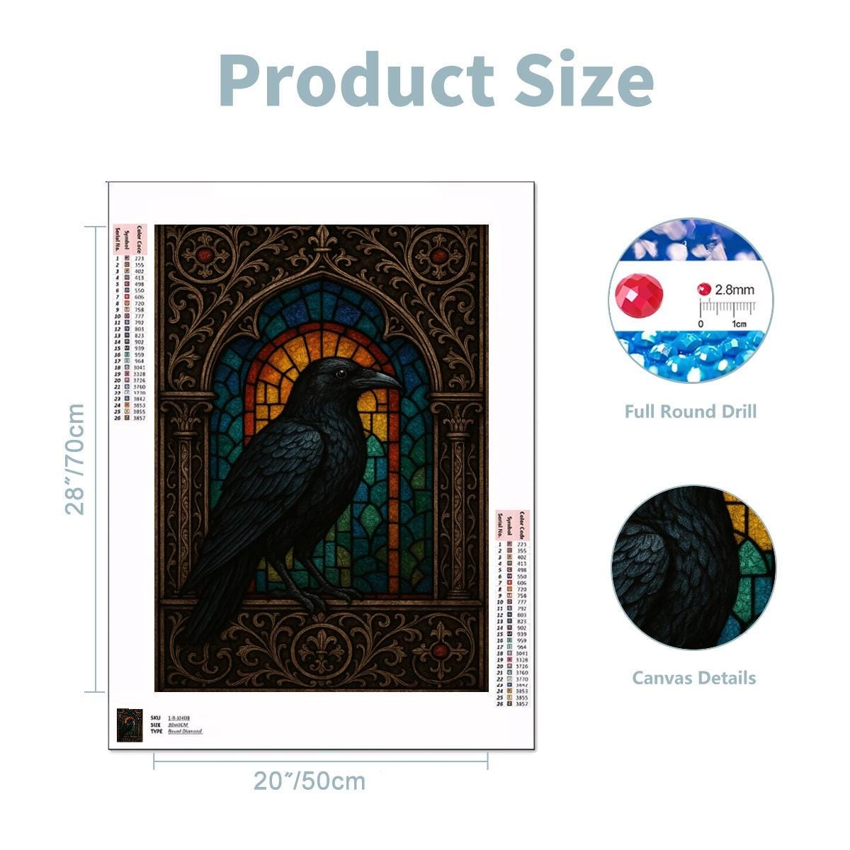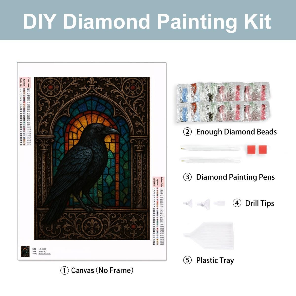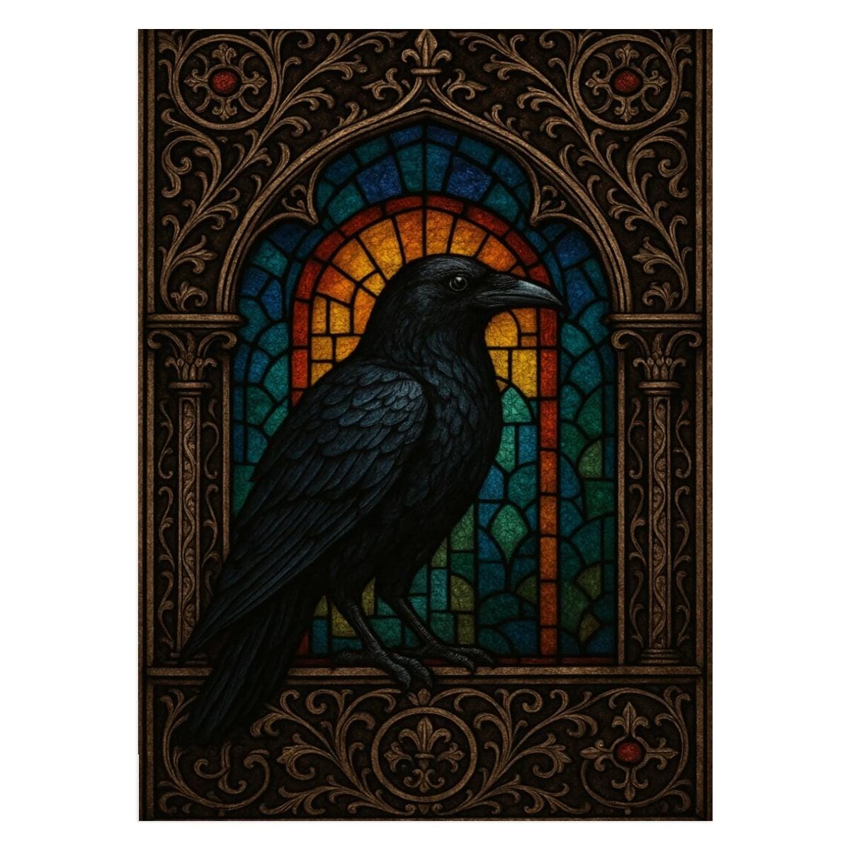 Create a bold and dramatic masterpiece with this Stained Glass Raven Diamond Painting Kit, featuring a detailed black raven set against an ornate stained-glass window design. With rich jewel tones and intricate framing, this piece is perfect for lovers of gothic décor, dark academia style, and dramatic wall art.