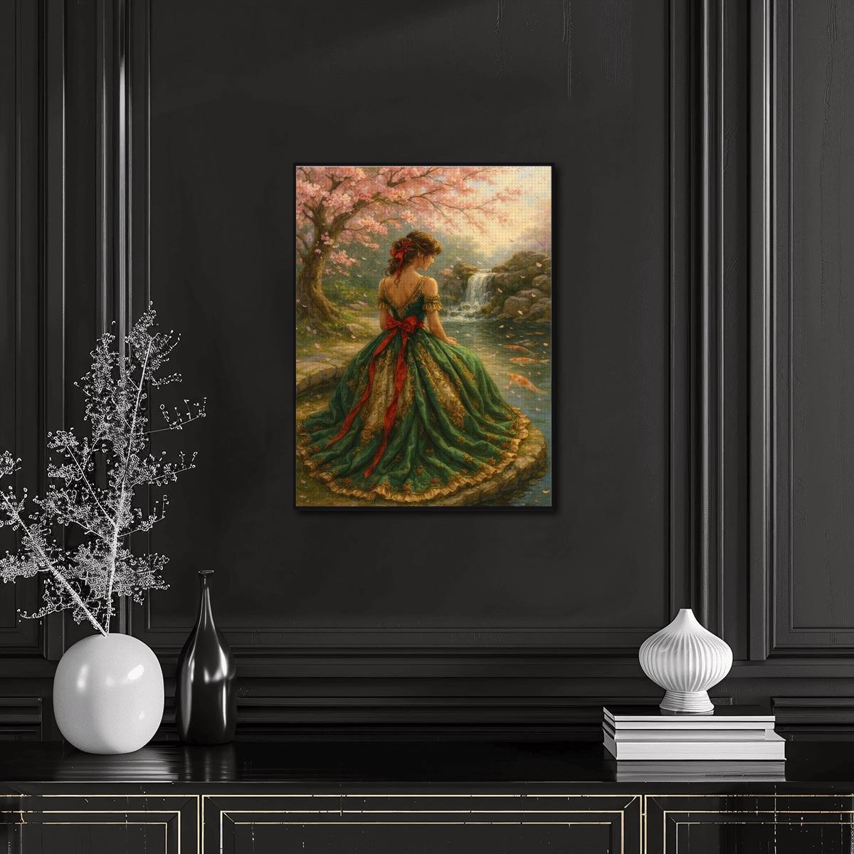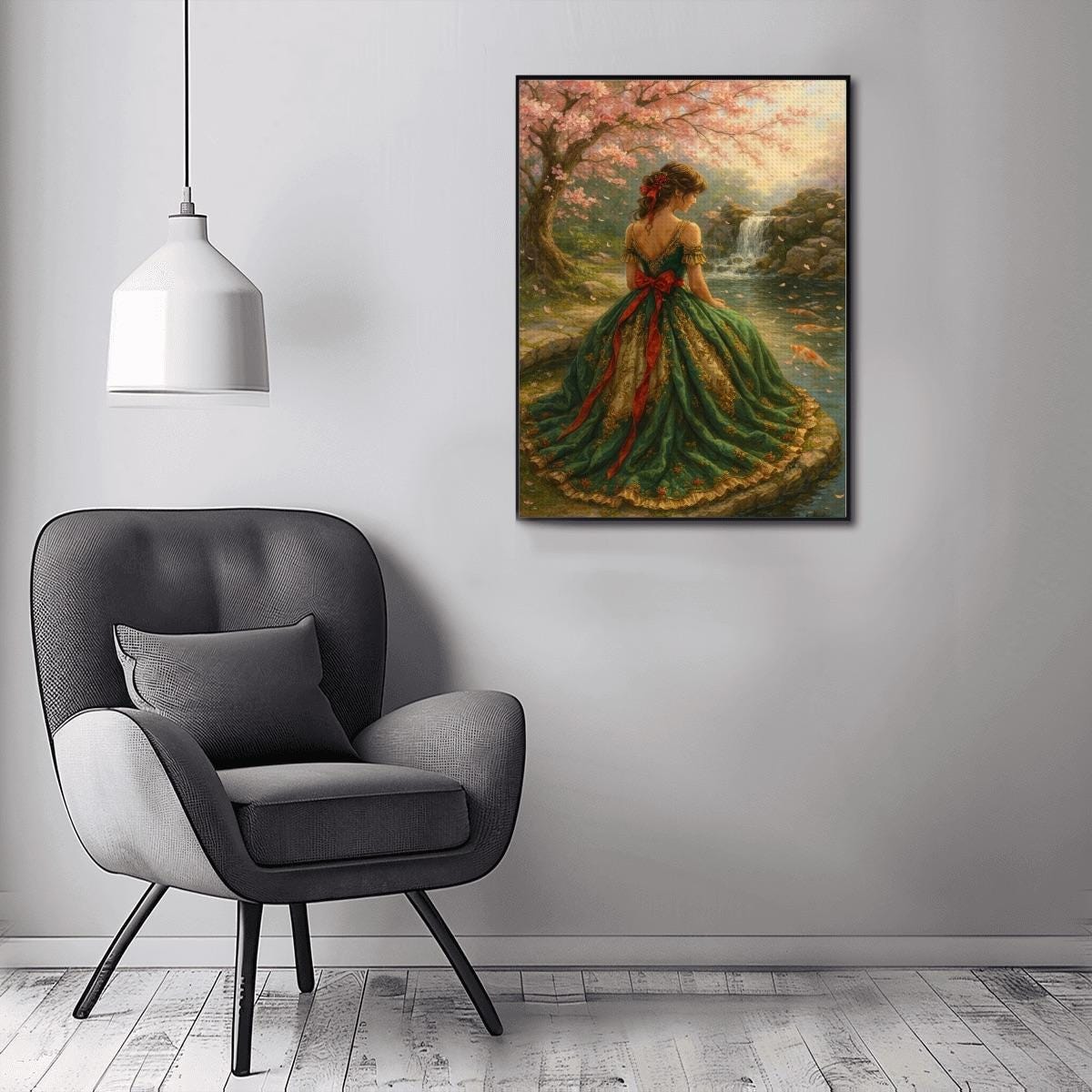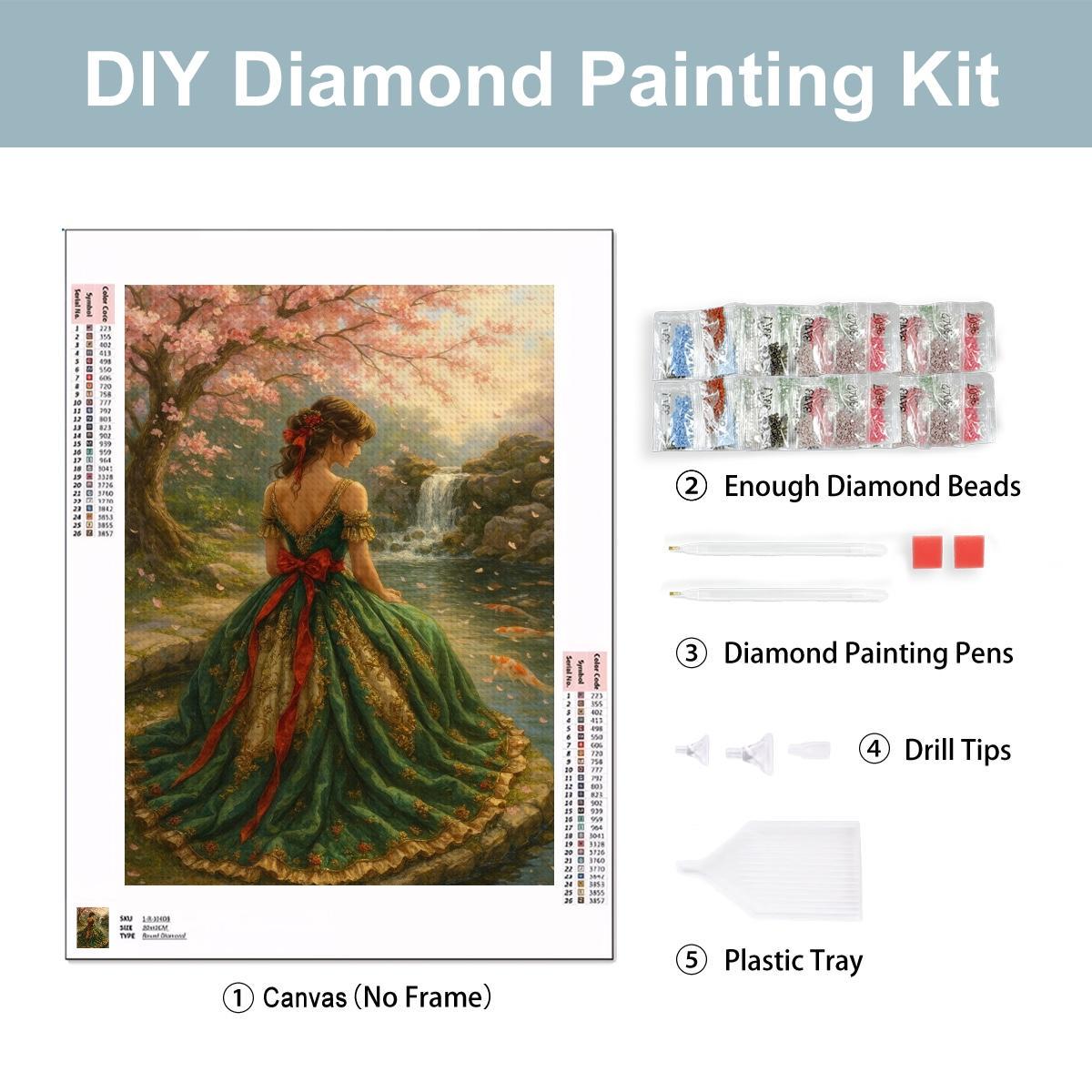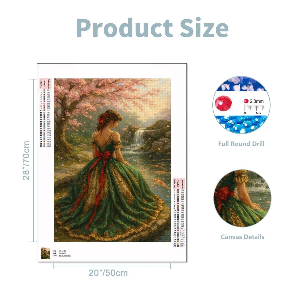 Create an elegant, storybook-inspired masterpiece with this Fairytale Princess Diamond Painting Kit, featuring a graceful woman in a flowing green gown standing beneath blooming trees in a romantic countryside waterfall garden scene.