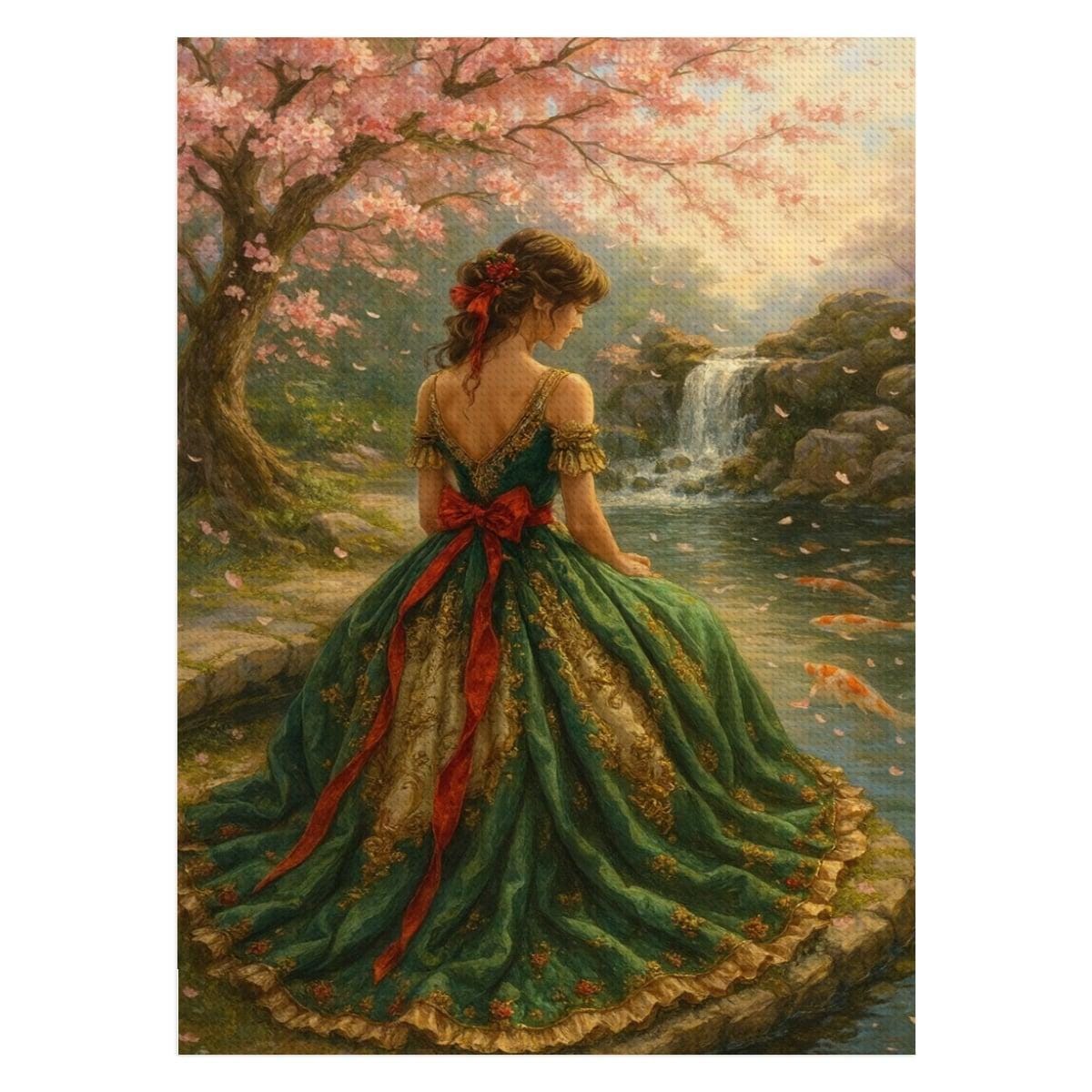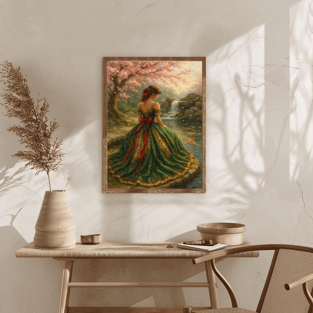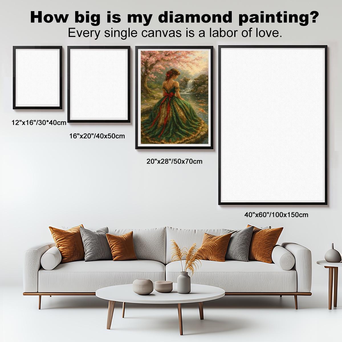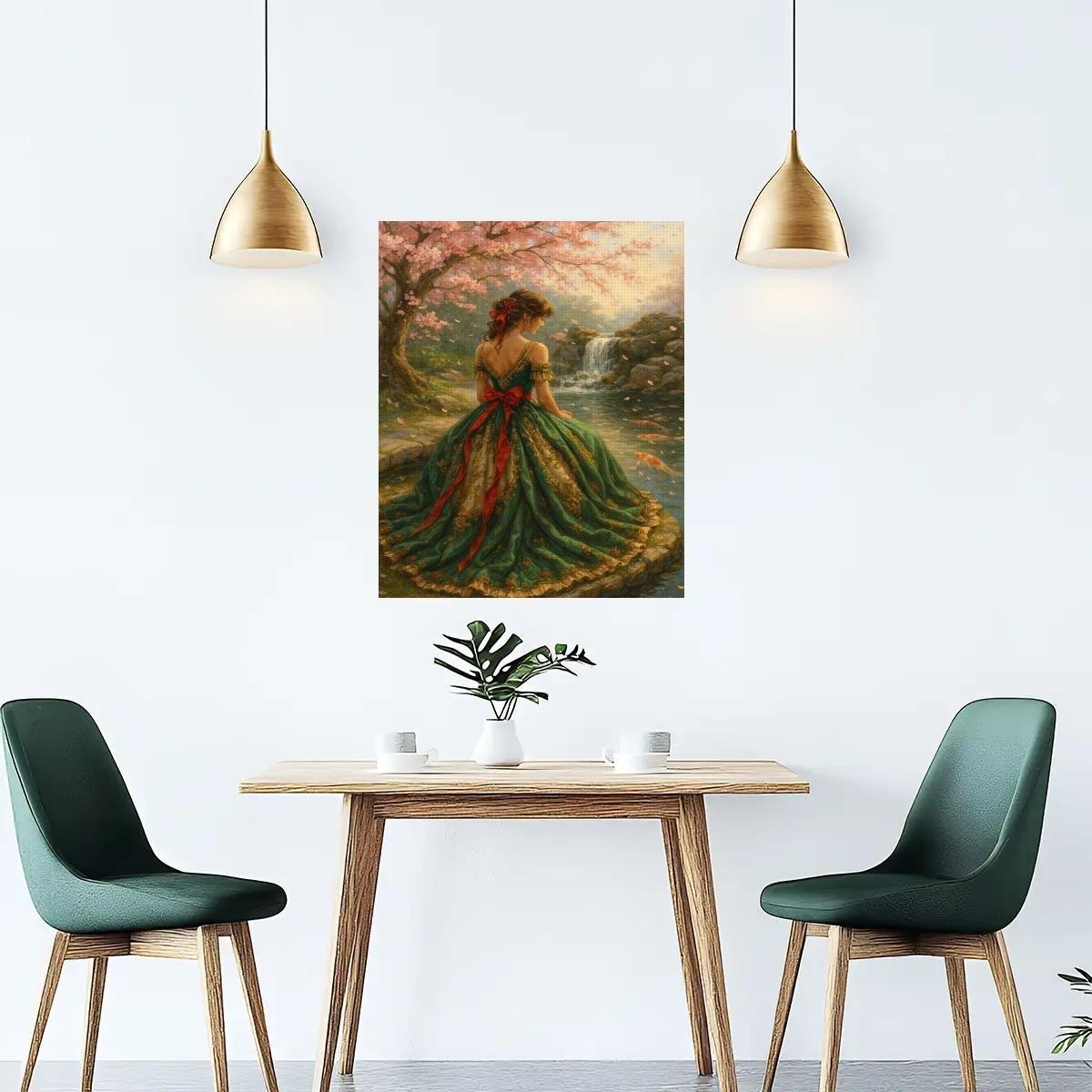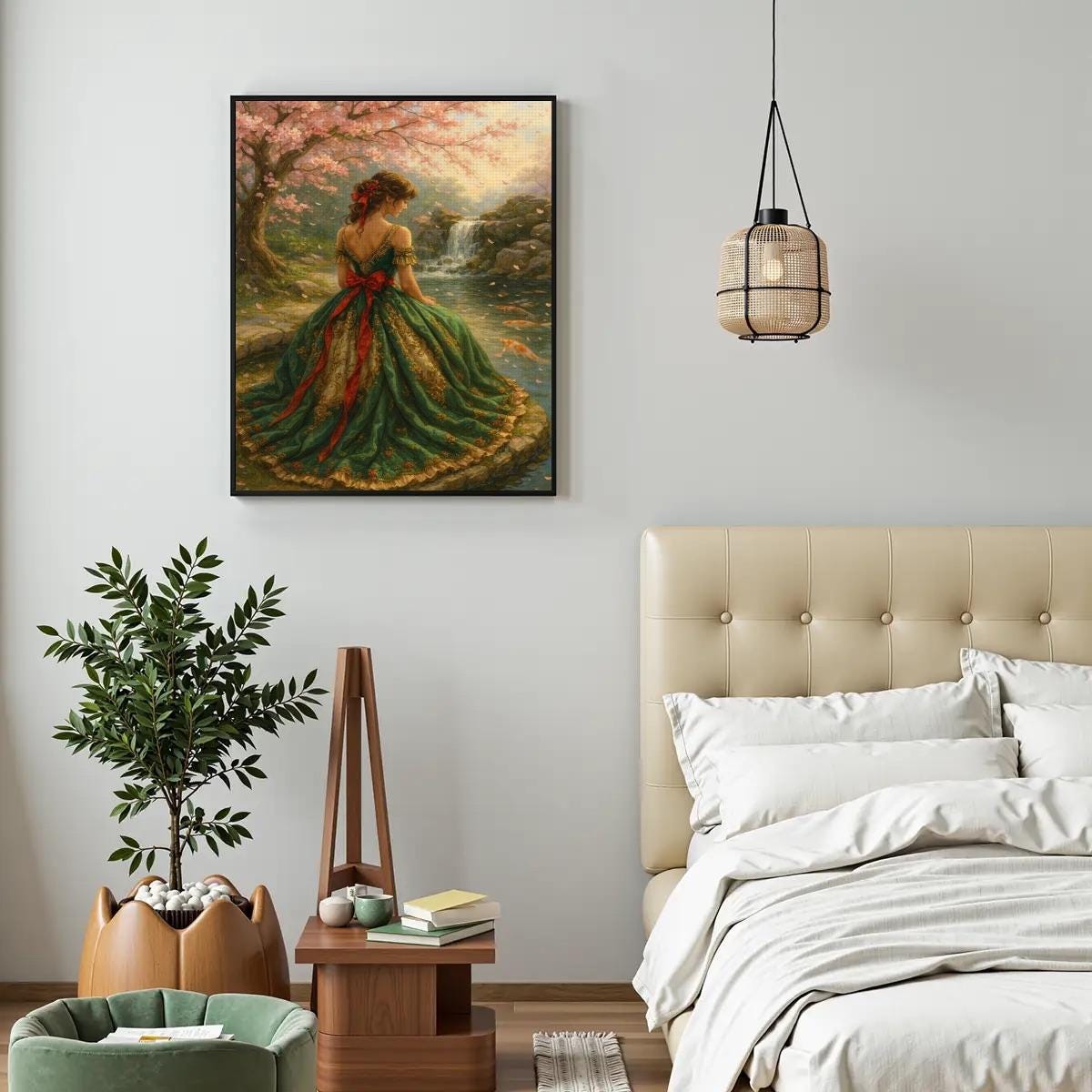 Create an elegant, storybook-inspired masterpiece with this Fairytale Princess Diamond Painting Kit, featuring a graceful woman in a flowing green gown standing beneath blooming trees in a romantic countryside waterfall garden scene.