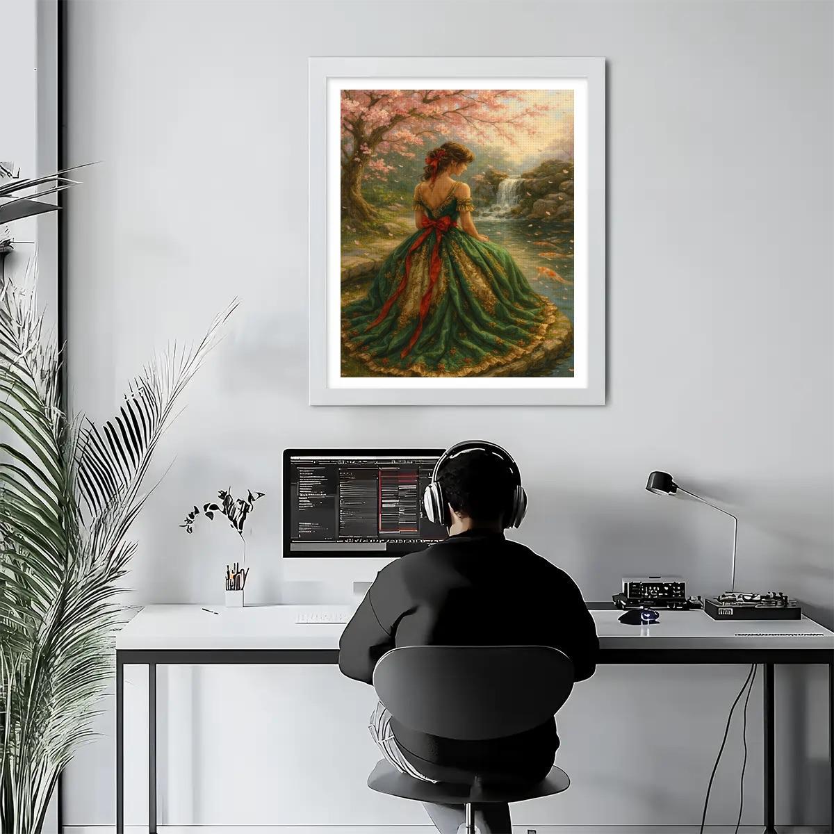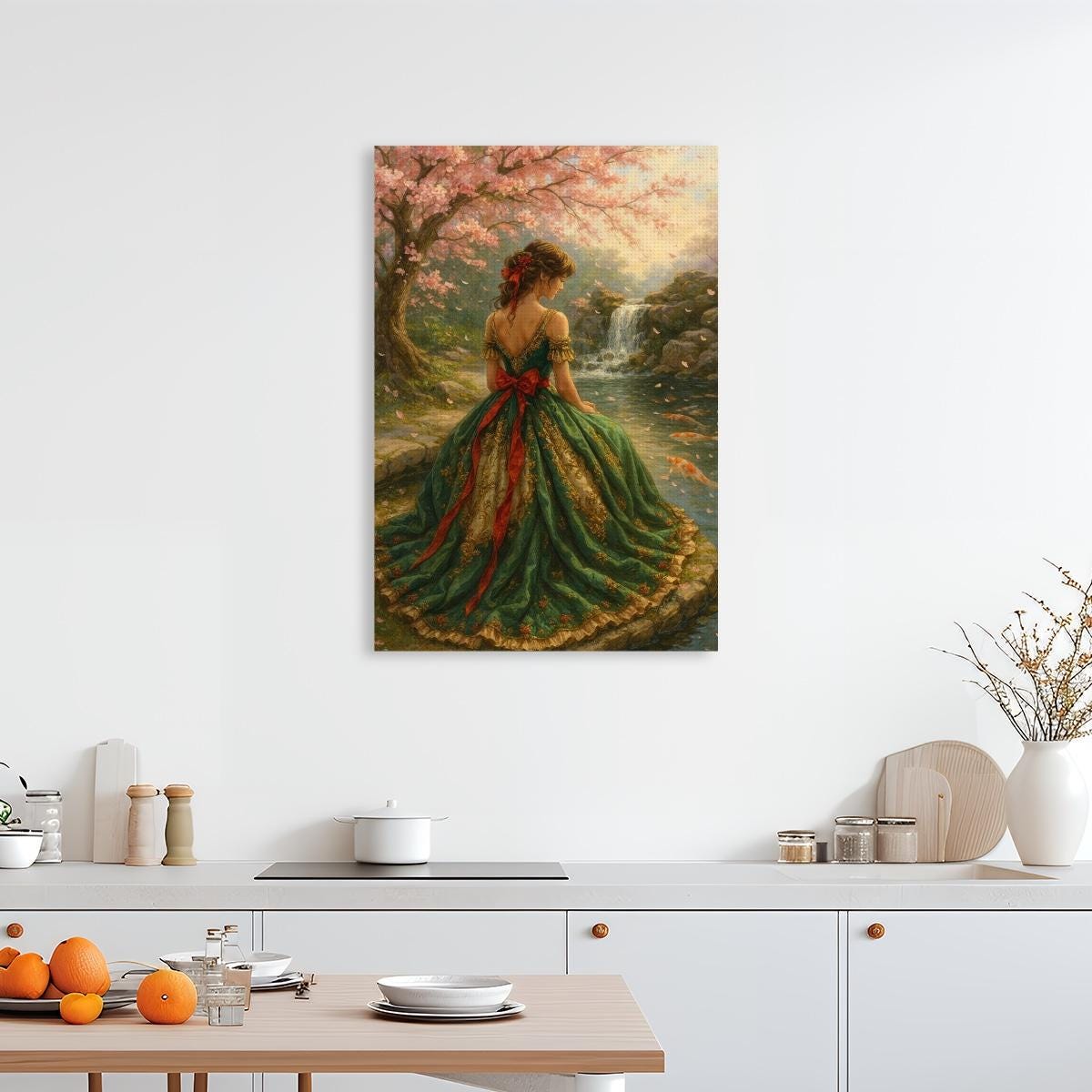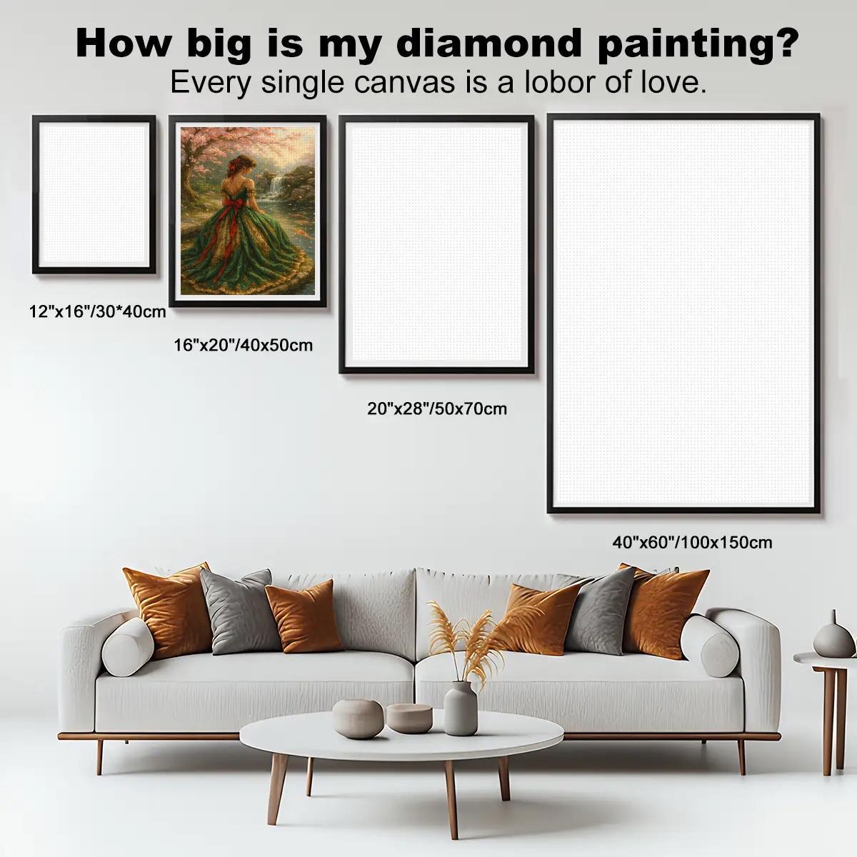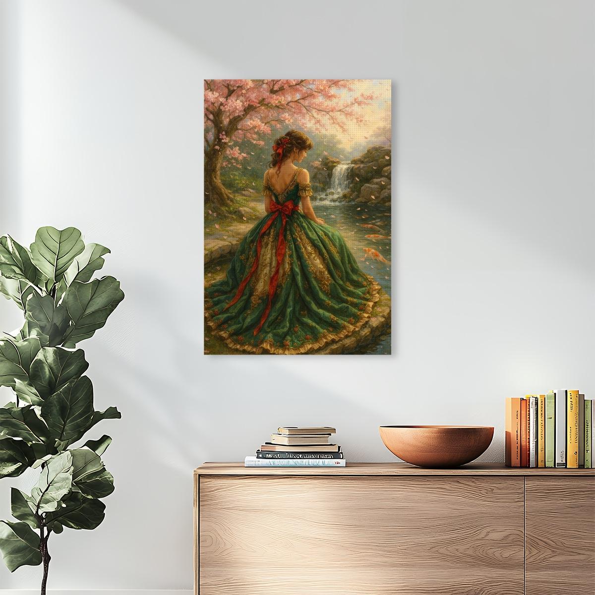 Create an elegant, storybook-inspired masterpiece with this Fairytale Princess Diamond Painting Kit, featuring a graceful woman in a flowing green gown standing beneath blooming trees in a romantic countryside waterfall garden scene.