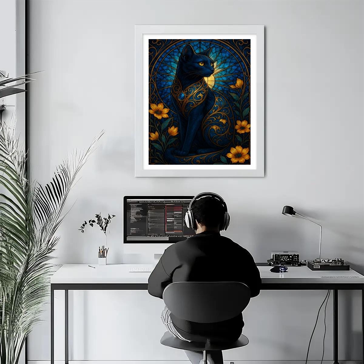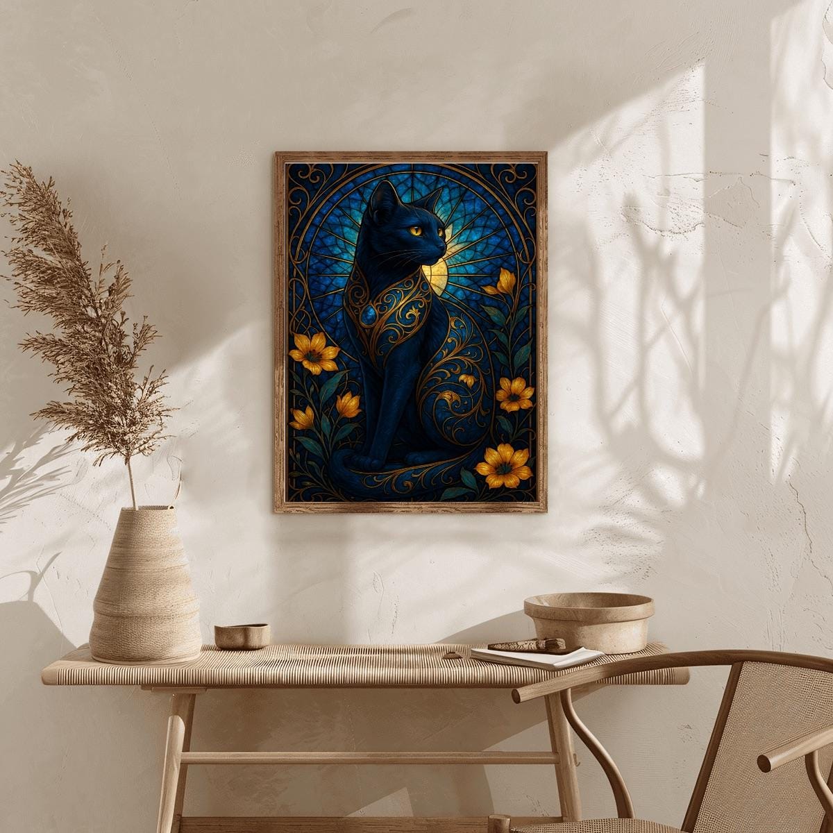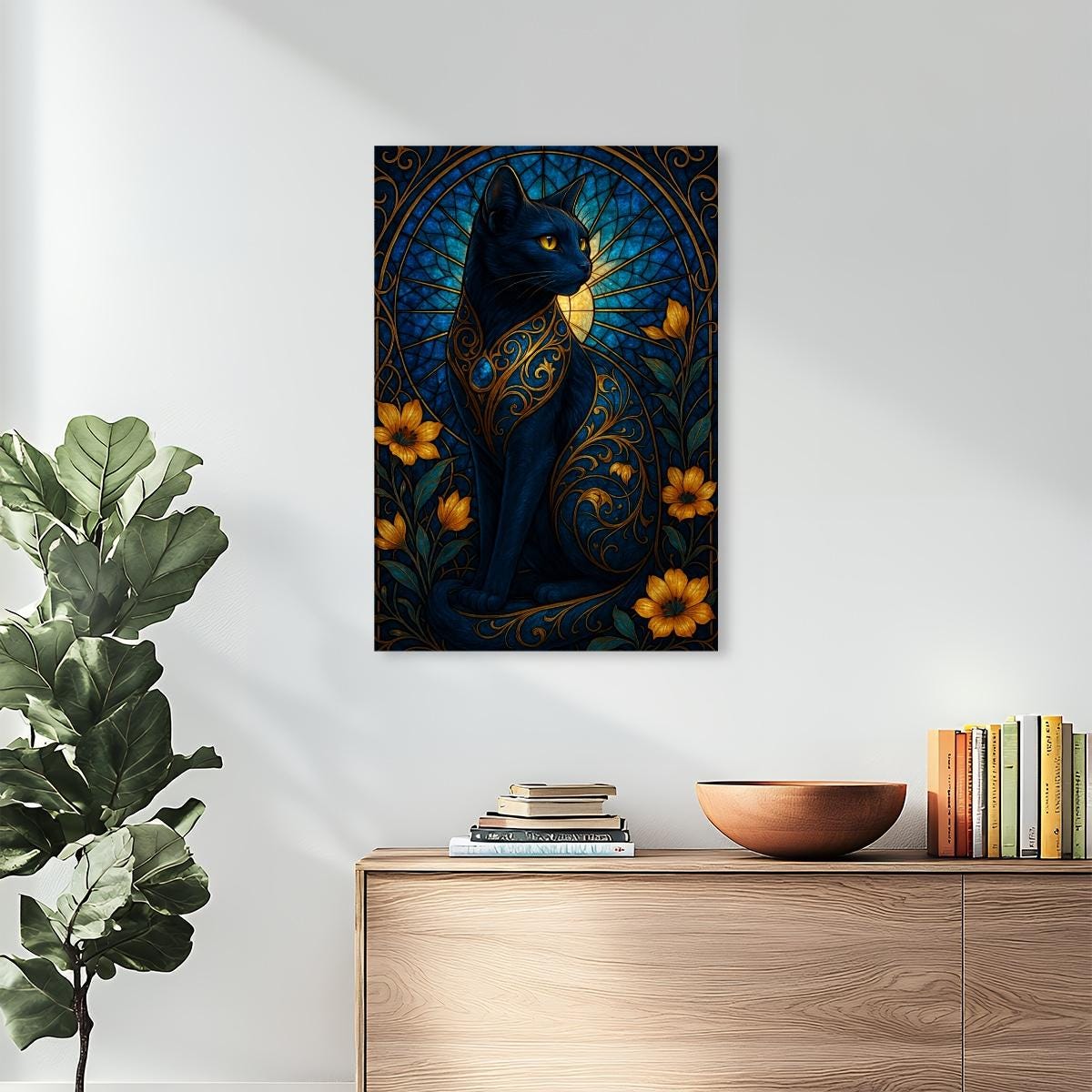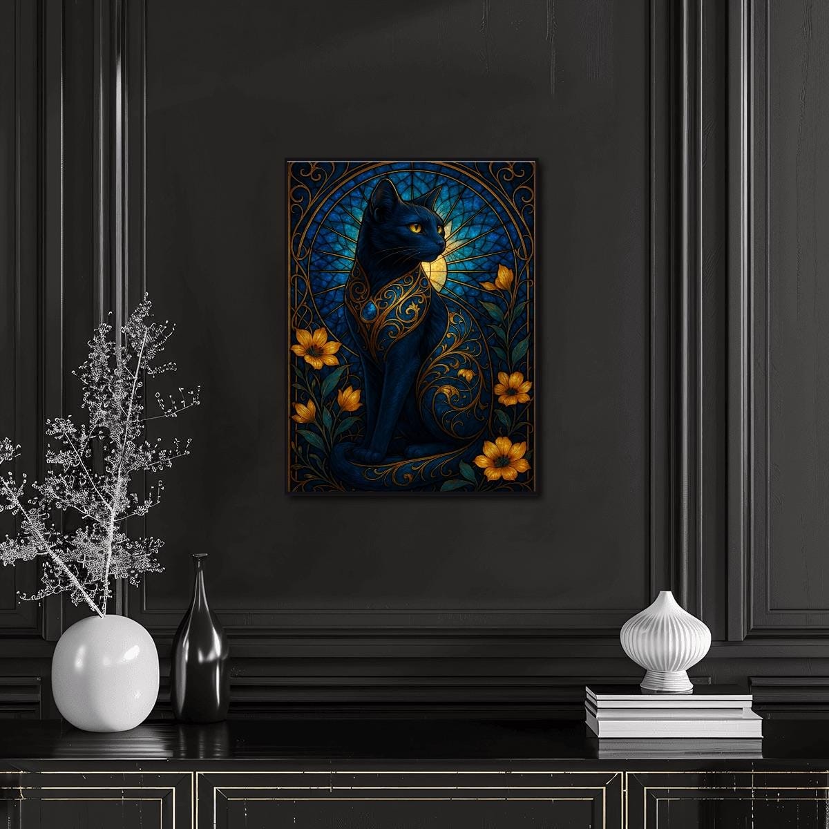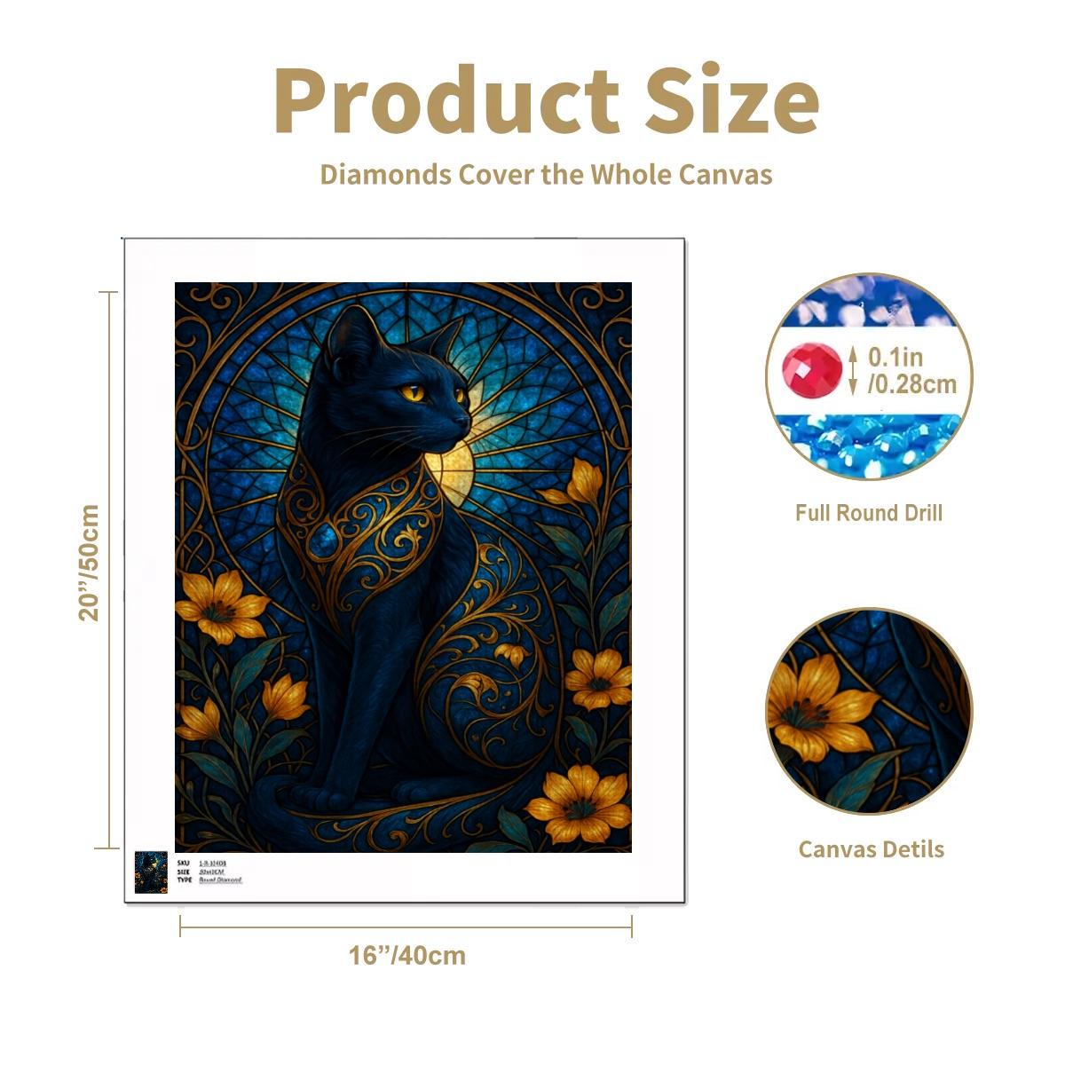 Stained Glass Black Cat Diamond Painting Kit – Gothic Floral Cat Art