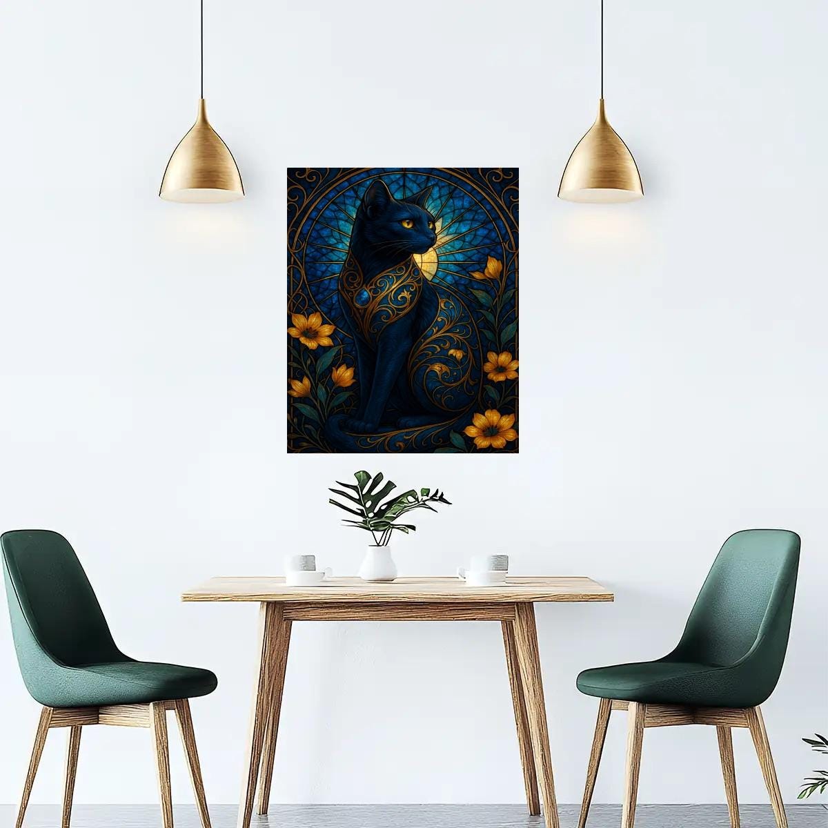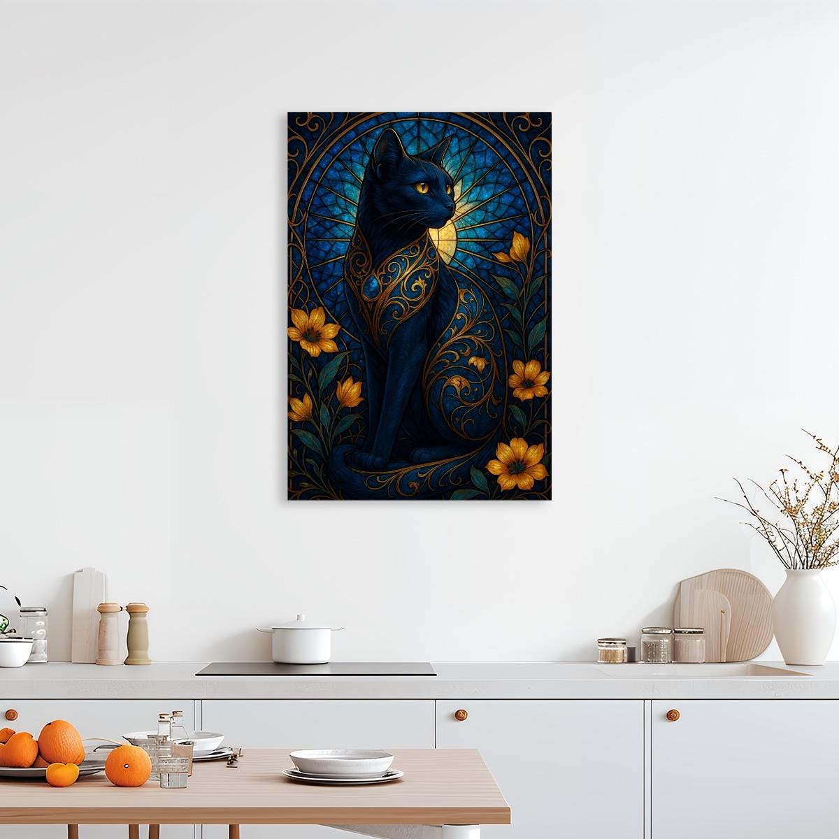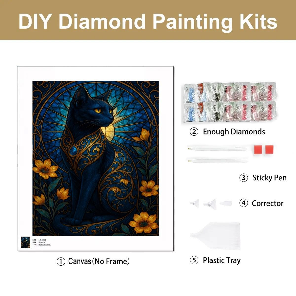 Create a striking piece of art with this Stained Glass Black Cat Diamond Painting Kit, featuring an elegant black cat surrounded by golden floral accents and decorative botanical details in a stained-glass–inspired design. This full-drill canvas offers bold color sections and clear details for a relaxing and enjoyable crafting experience.