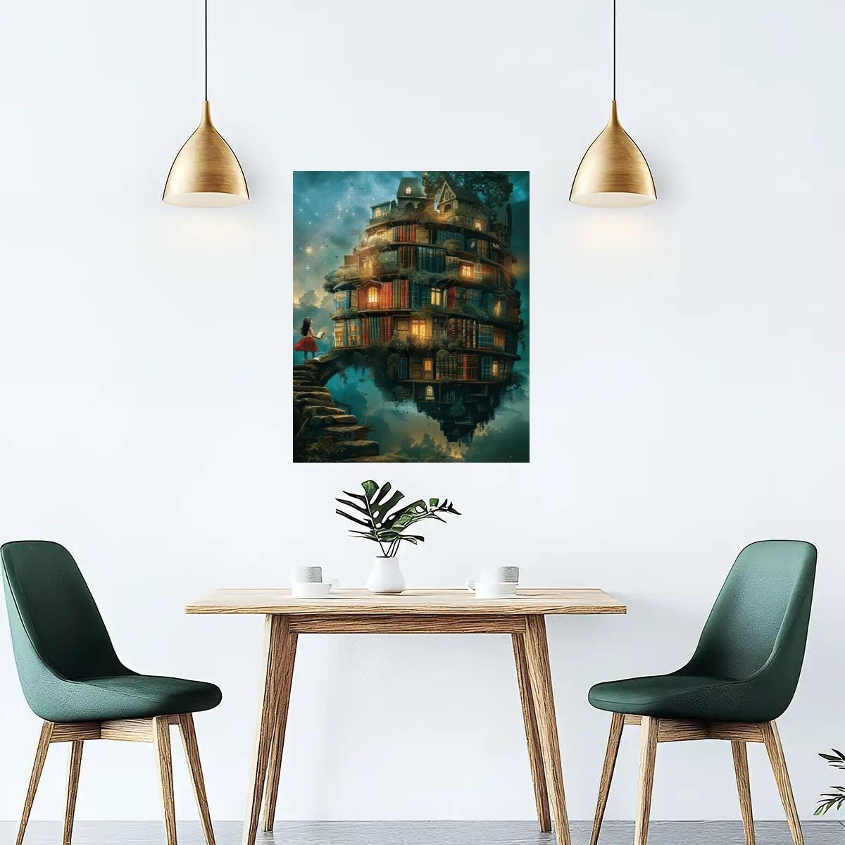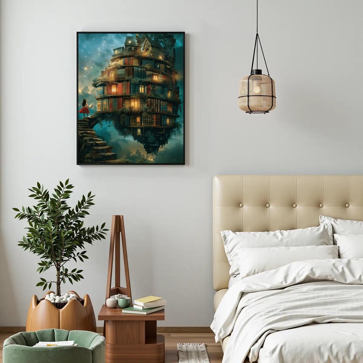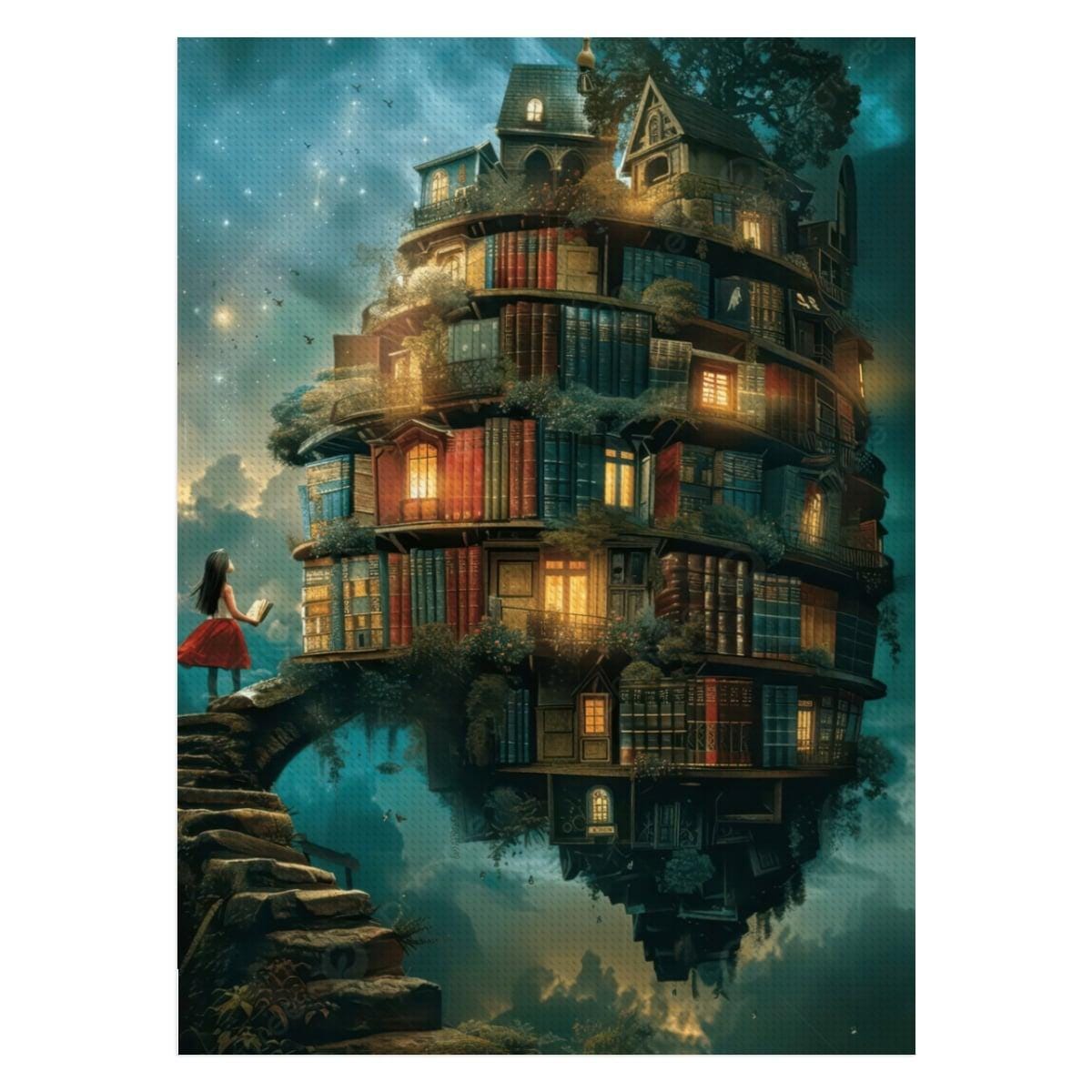 Create a breathtaking piece of fantasy wall art with this Floating Library Diamond Painting Kit, featuring a whimsical stacked book house glowing under a dreamy night sky. This enchanting design captures imagination, wonder, and storybook magic — perfect for book lovers and fantasy art fans.