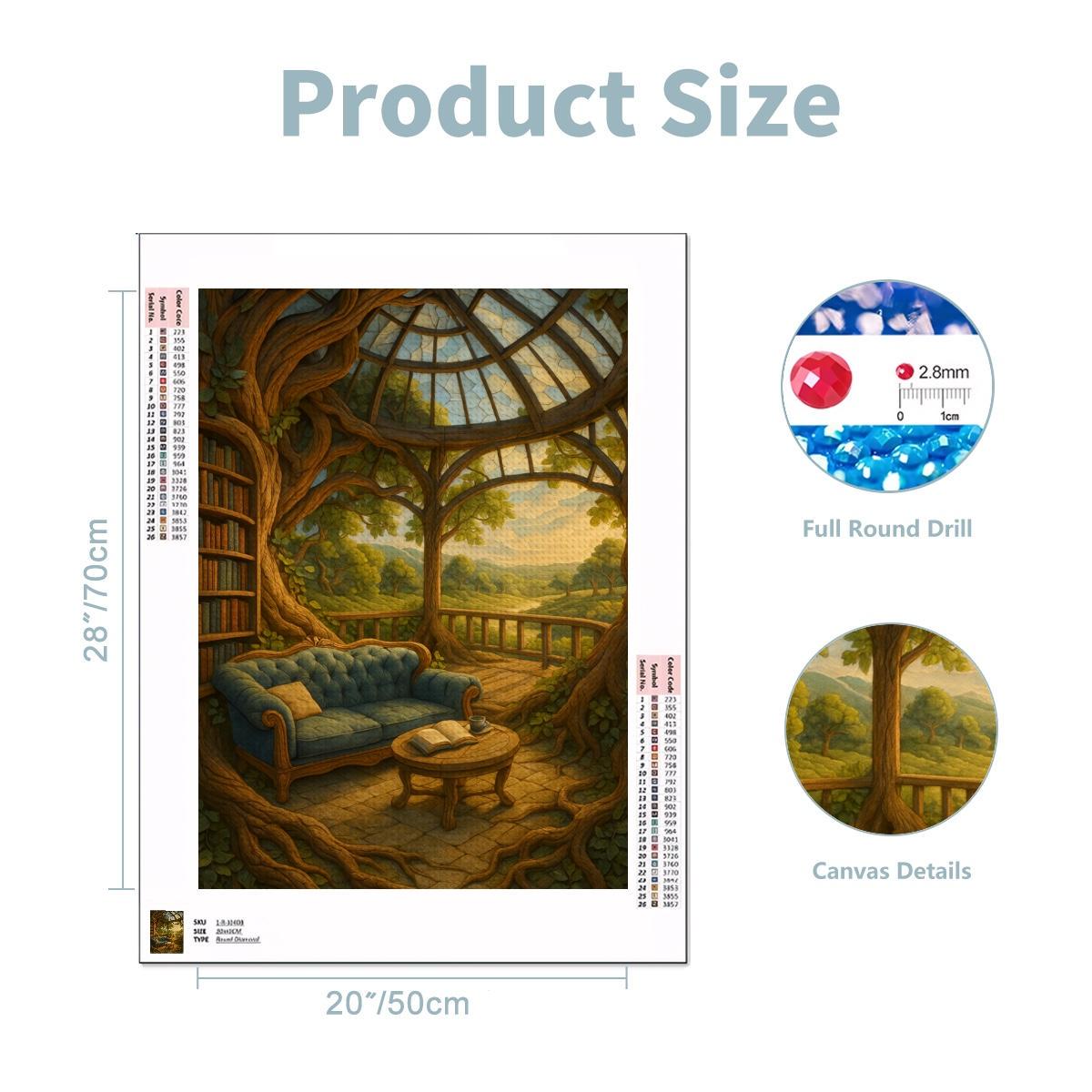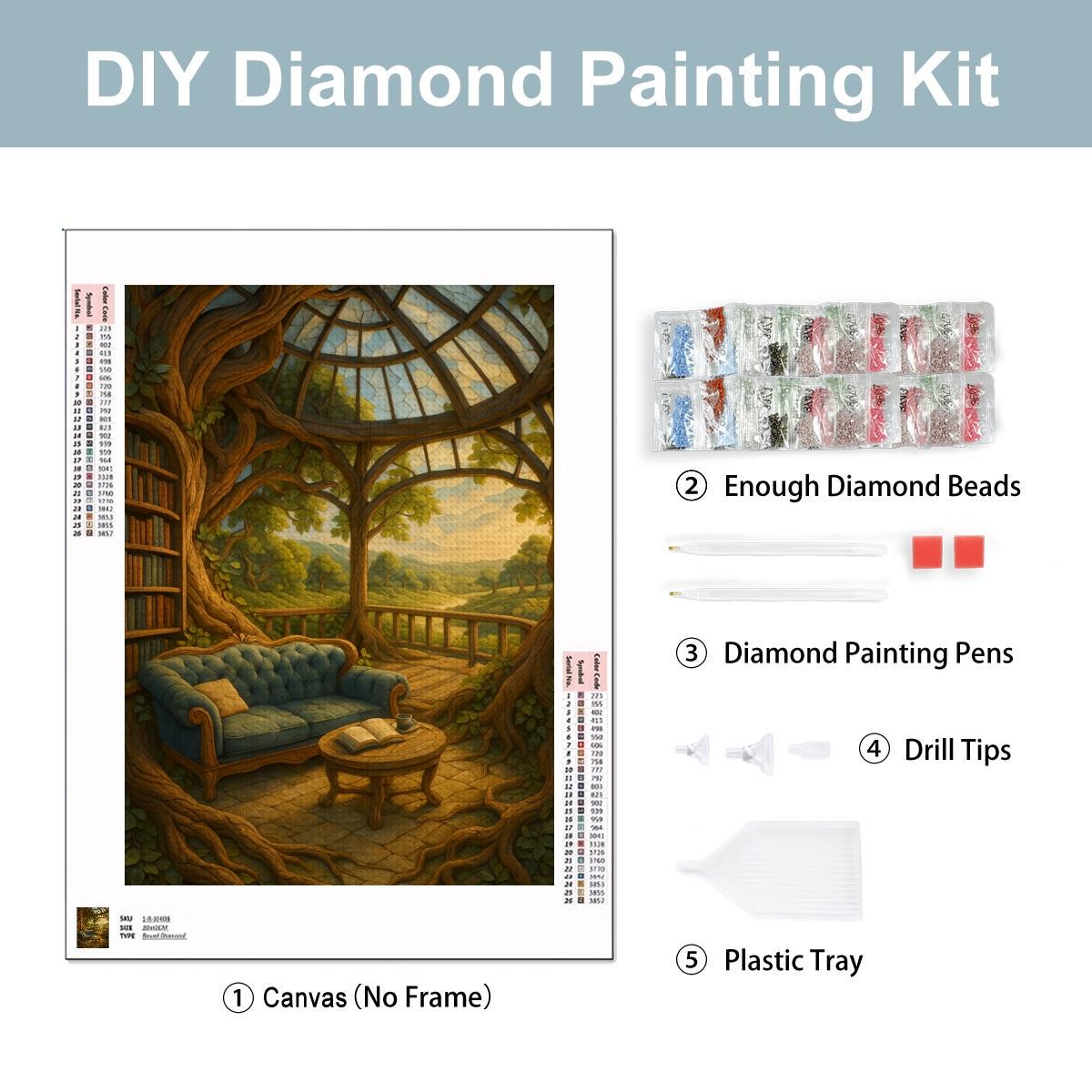 Bring imagination to life with this enchanting Library Treehouse Diamond Painting Kit featuring a peaceful reading nook surrounded by nature, books, and warm golden light. This dreamy design is perfect for book lovers, fantasy fans, and anyone who enjoys relaxing crafts that become stunning wall art.