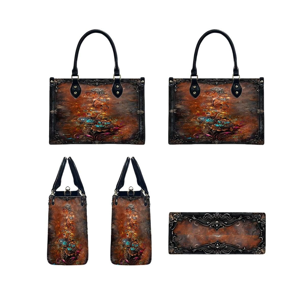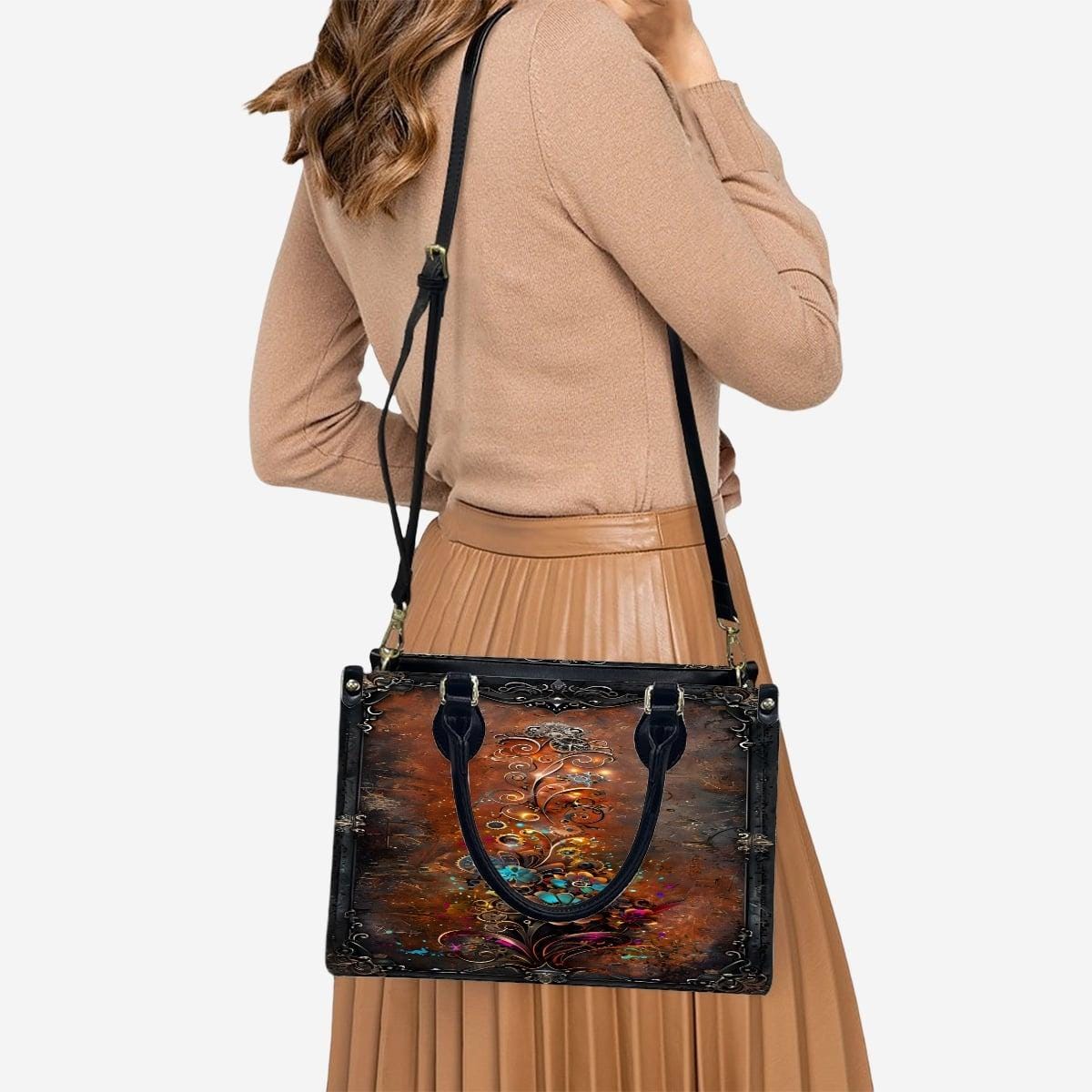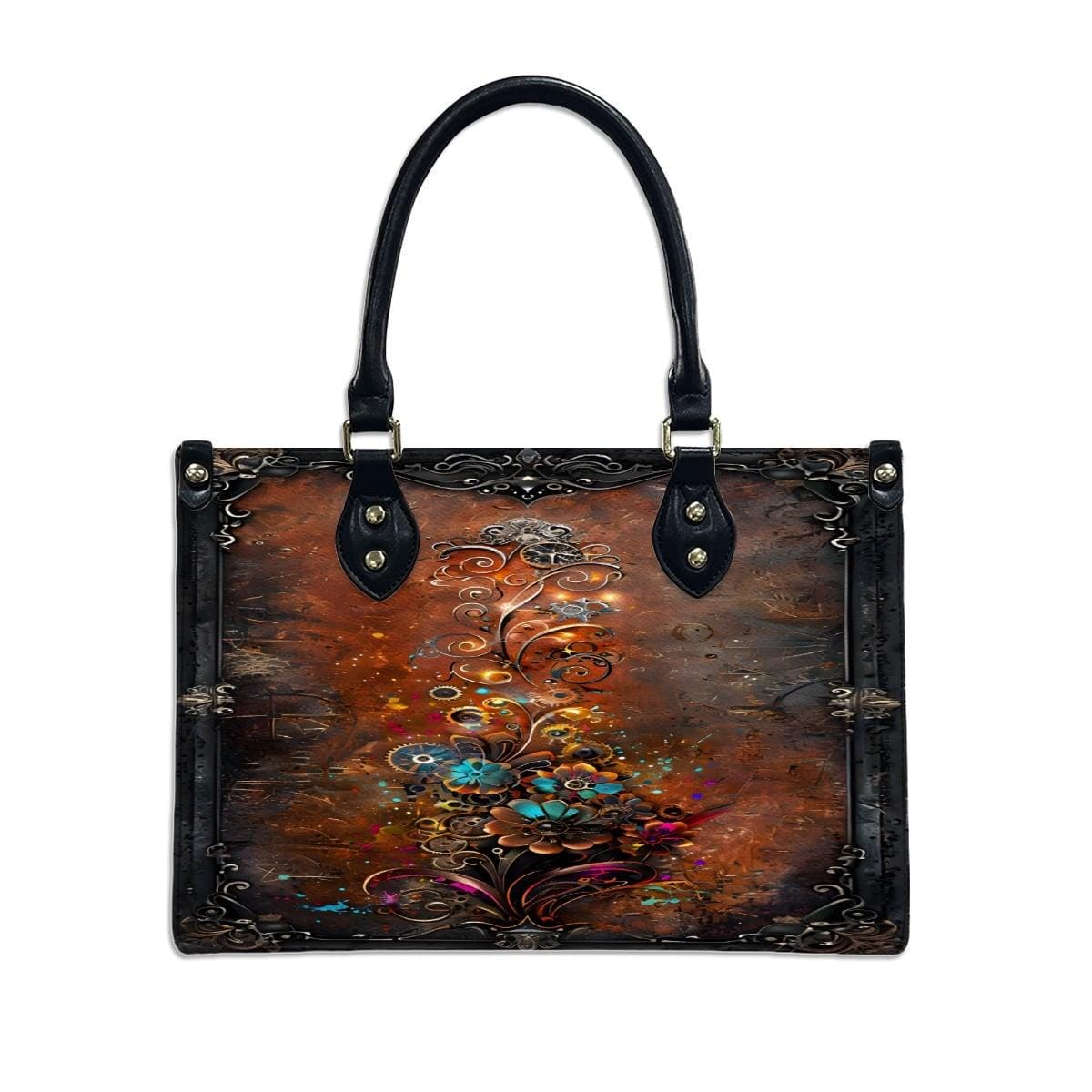 Bold, artistic, and rich in vintage detail, this Steampunk Mechanical Floral Leather Handbag features original SteadfastDay artwork blending intricate gears with blooming mechanical flowers on a deep antique bronze background.