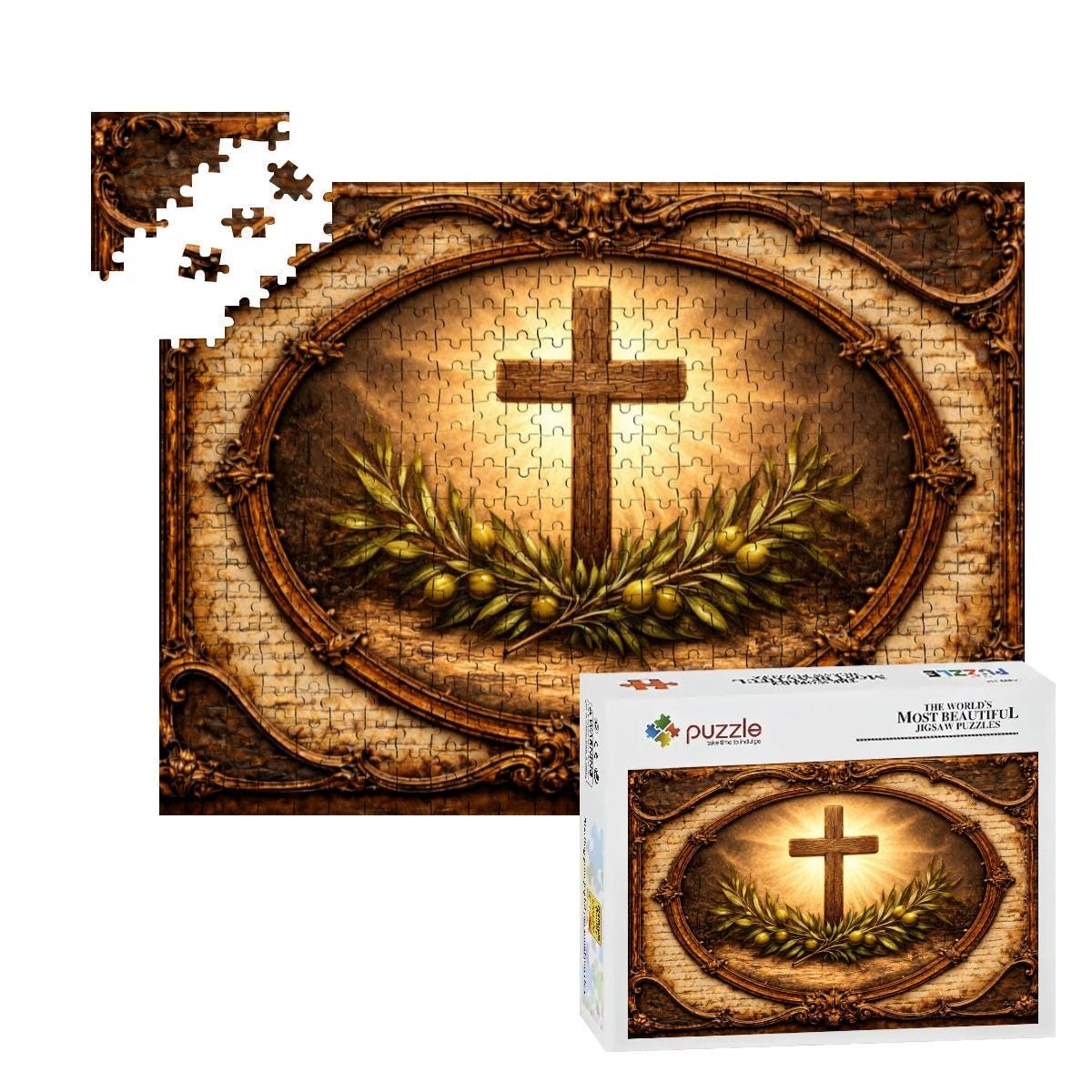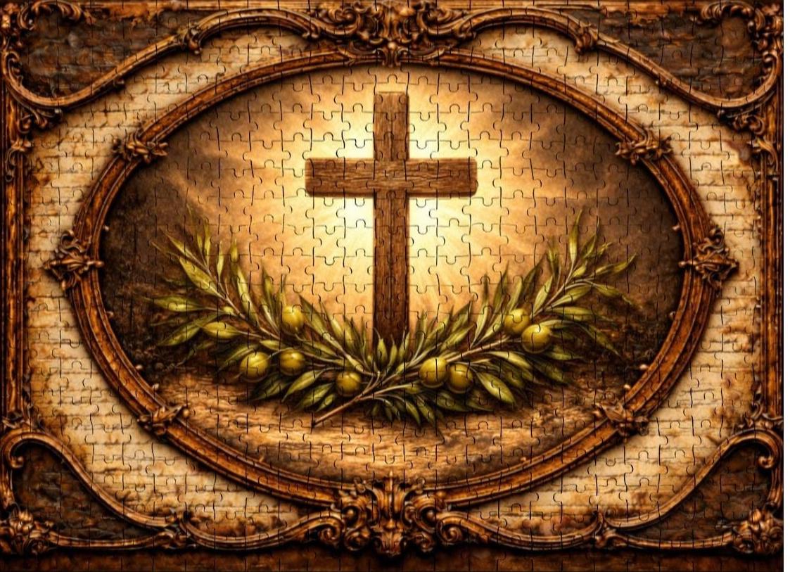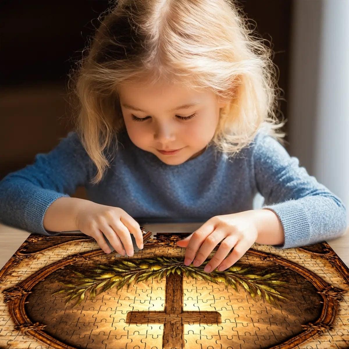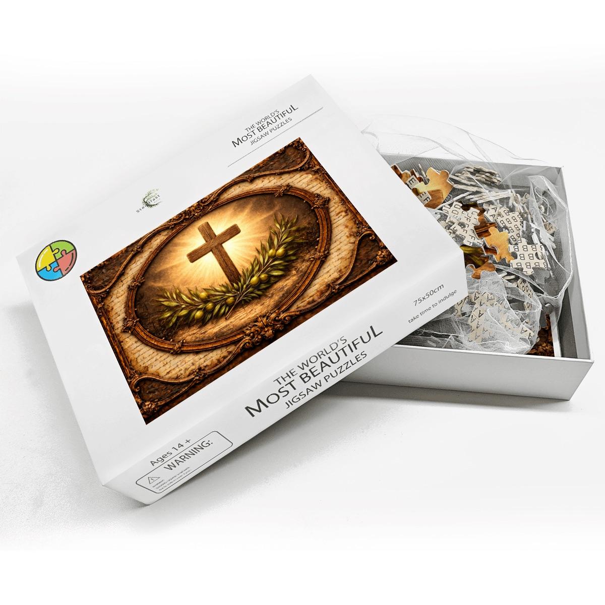 This beautiful Cross and Olive Branch Wooden Puzzle reflects faith, peace, and hope. The artwork features a glowing Christian cross surrounded by olive branches, symbolizing peace and spiritual renewal, framed in a vintage style design that creates a warm and meaningful scene.