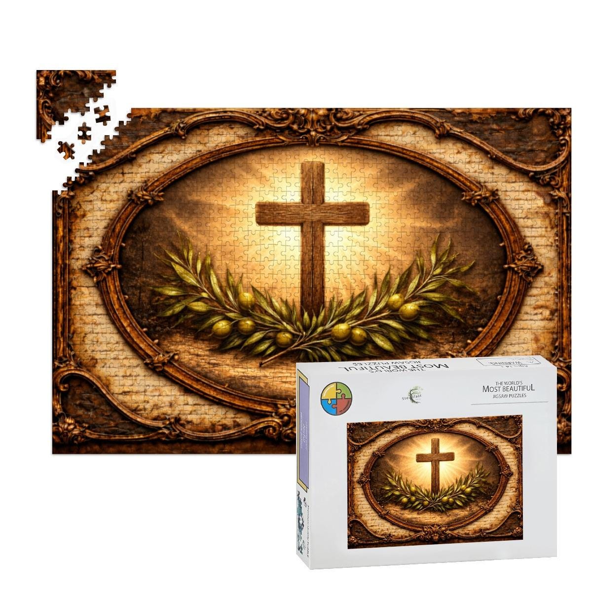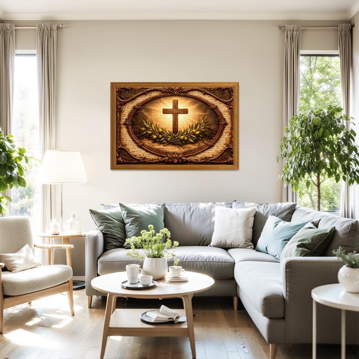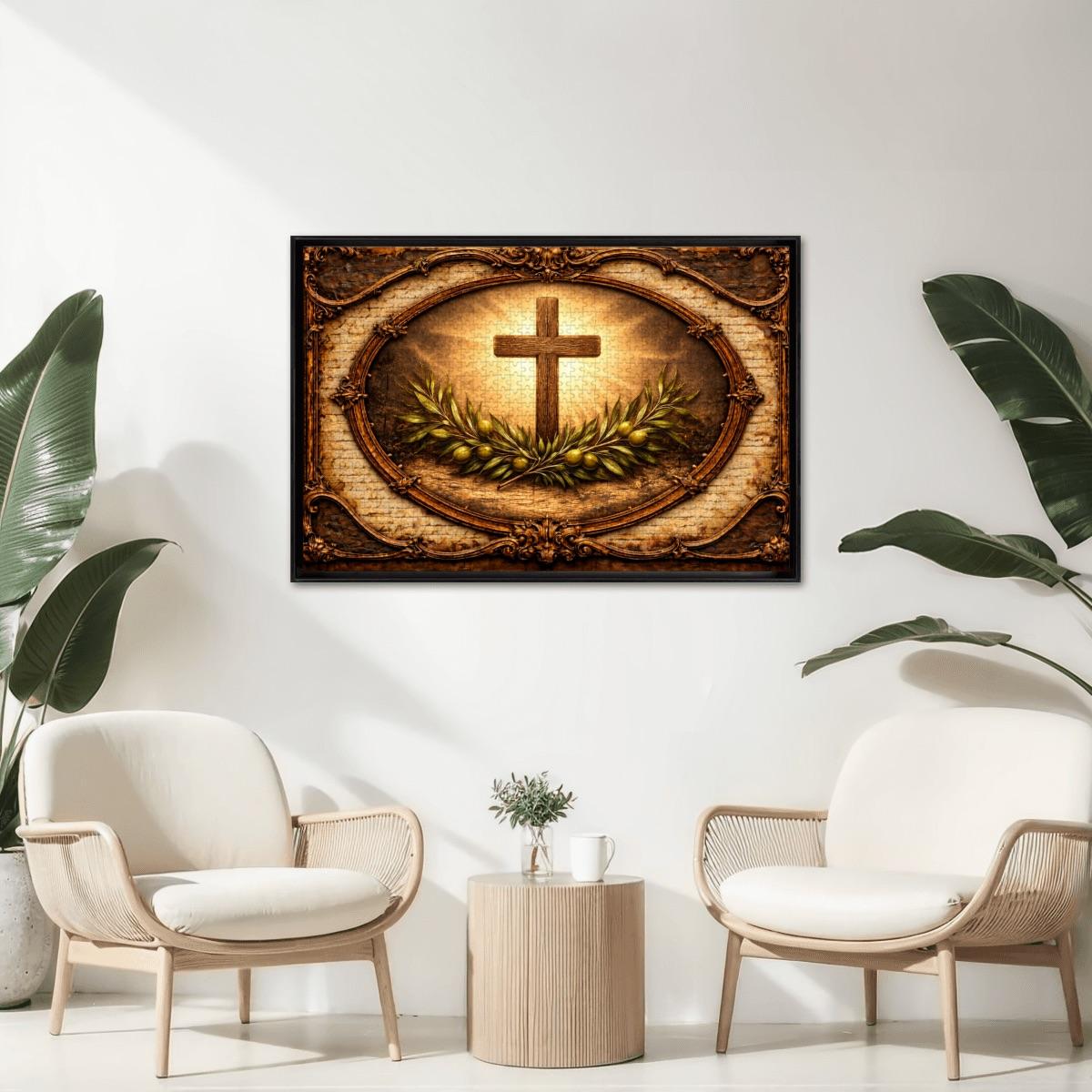 This beautiful Cross and Olive Branch Wooden Puzzle reflects faith, peace, and hope. The artwork features a glowing Christian cross surrounded by olive branches, symbolizing peace and spiritual renewal, framed in a vintage style design that creates a warm and meaningful scene.