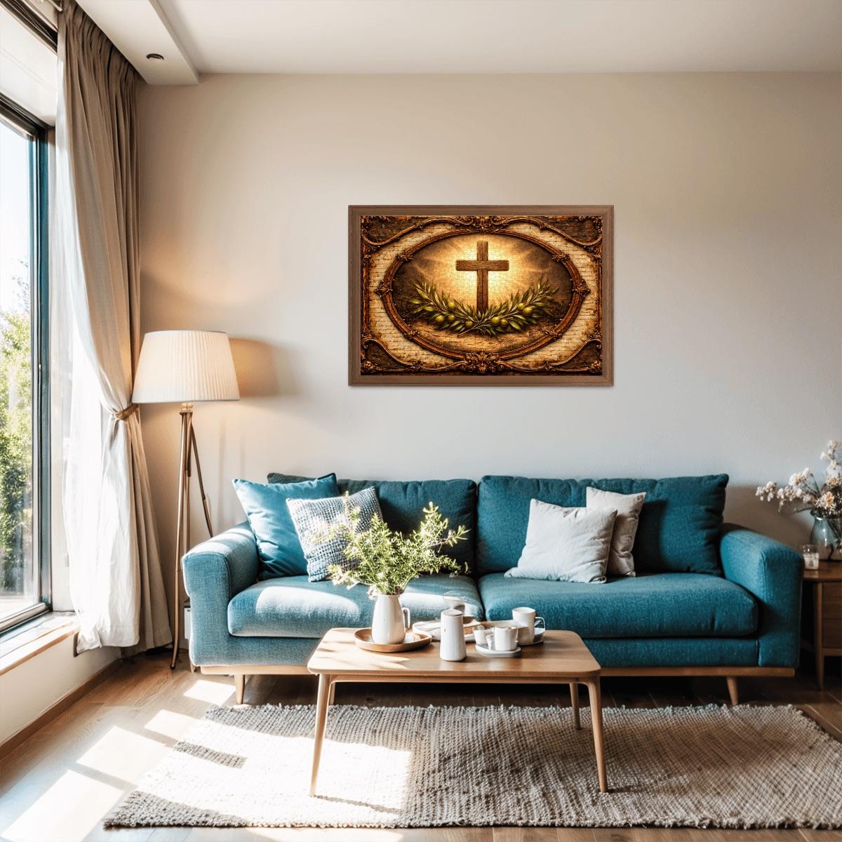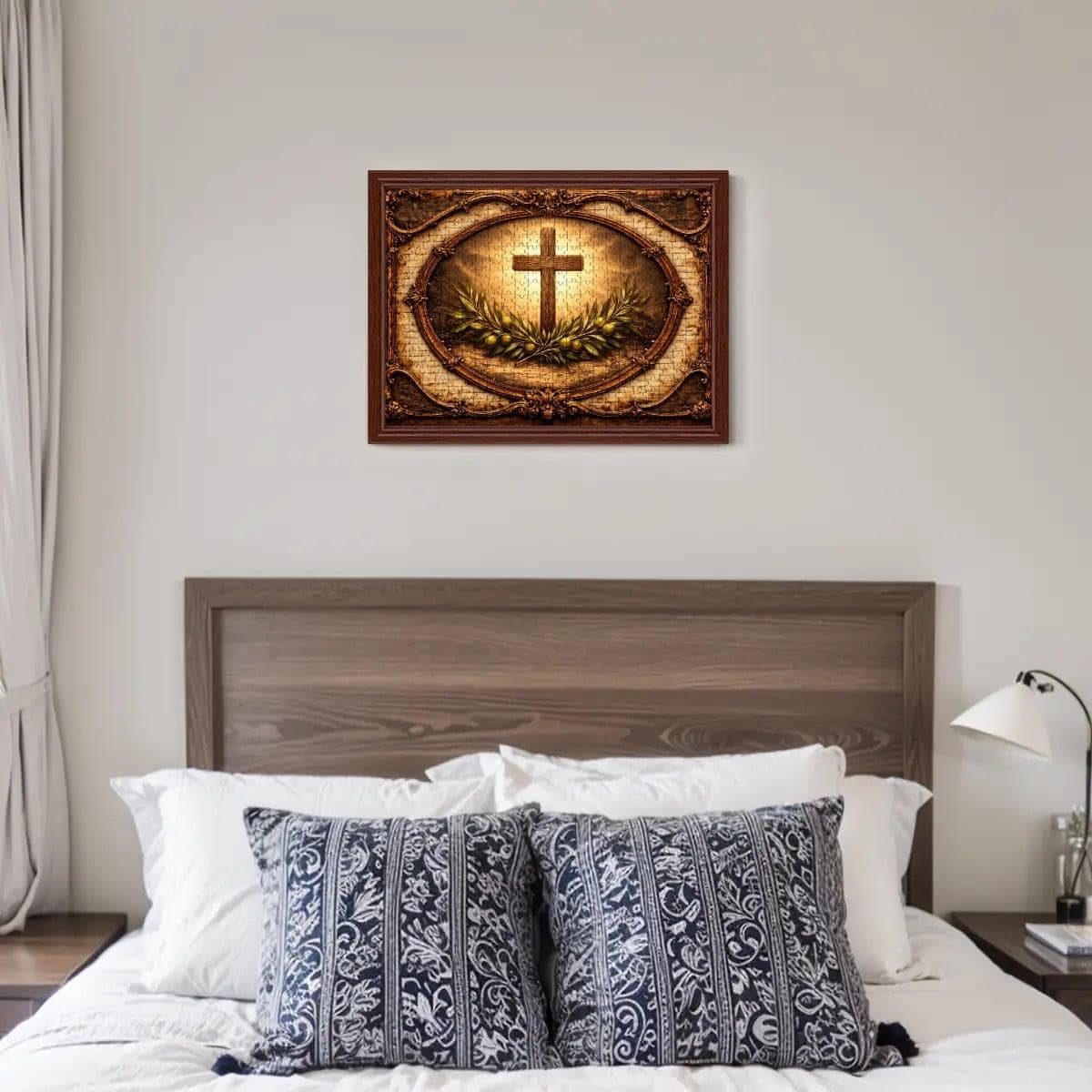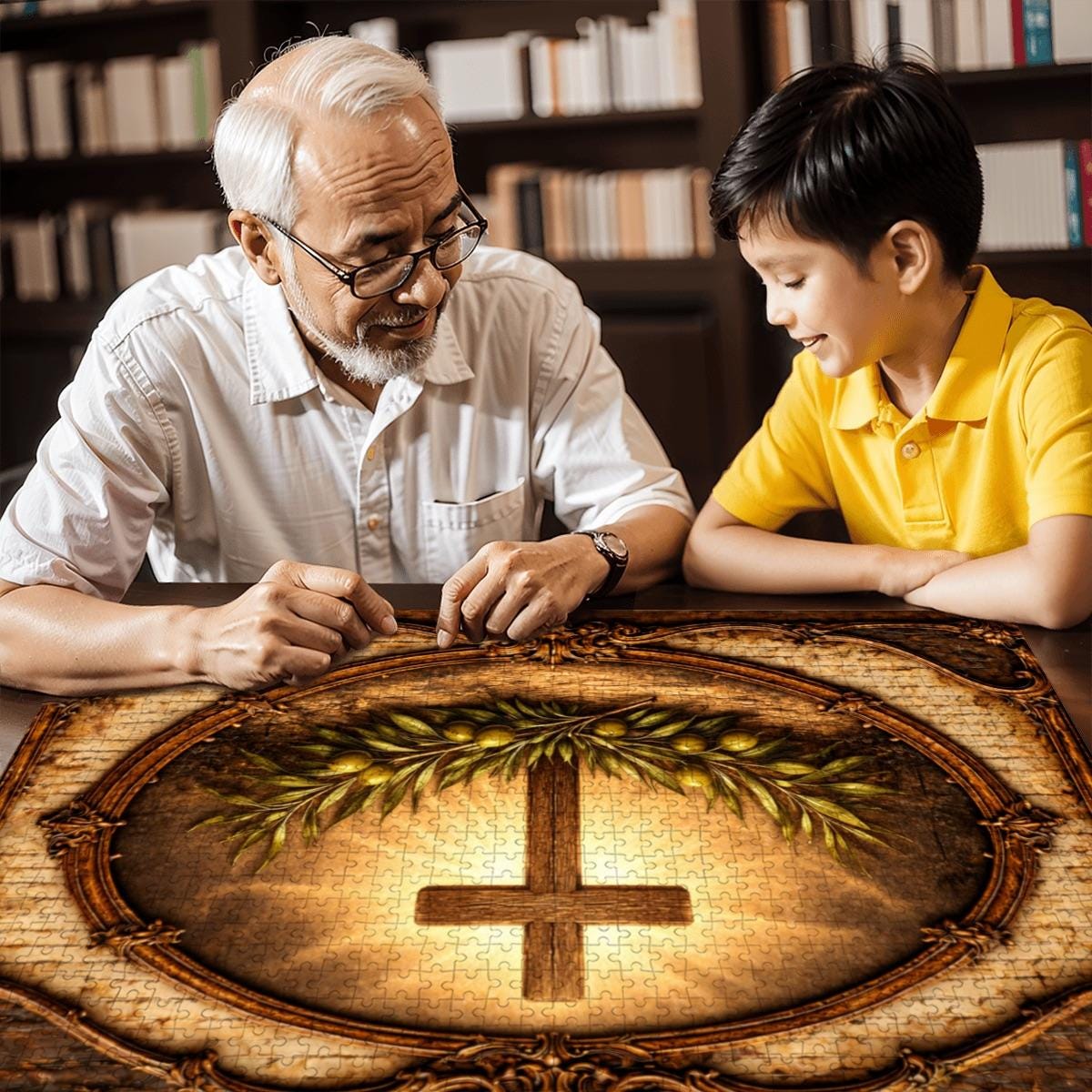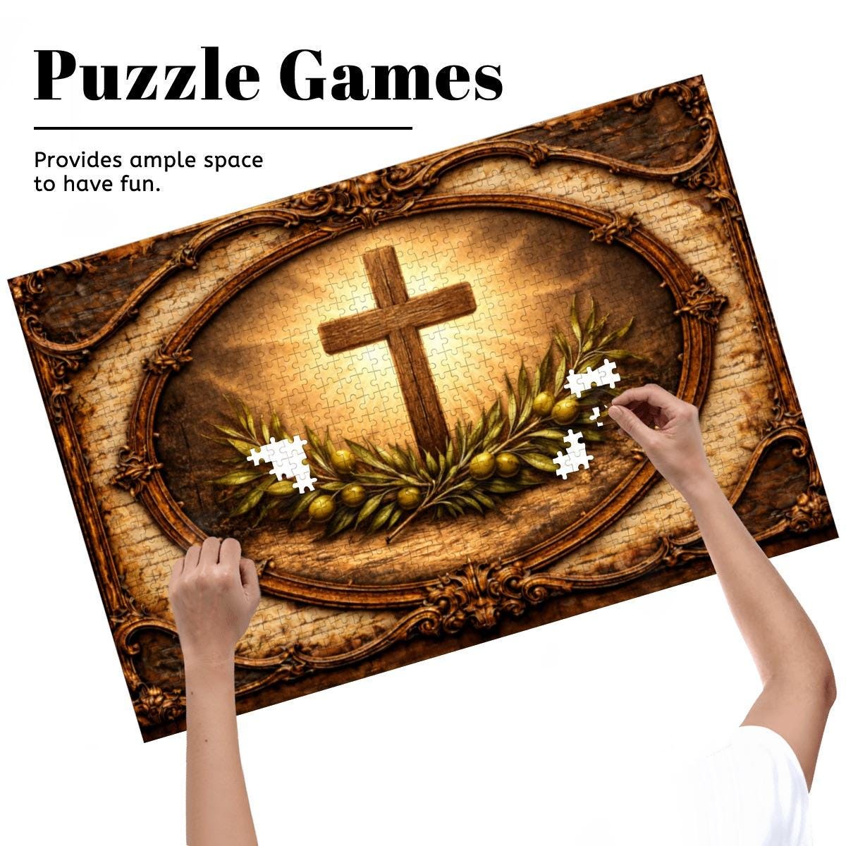 This beautiful Cross and Olive Branch Wooden Puzzle reflects faith, peace, and hope. The artwork features a glowing Christian cross surrounded by olive branches, symbolizing peace and spiritual renewal, framed in a vintage style design that creates a warm and meaningful scene.