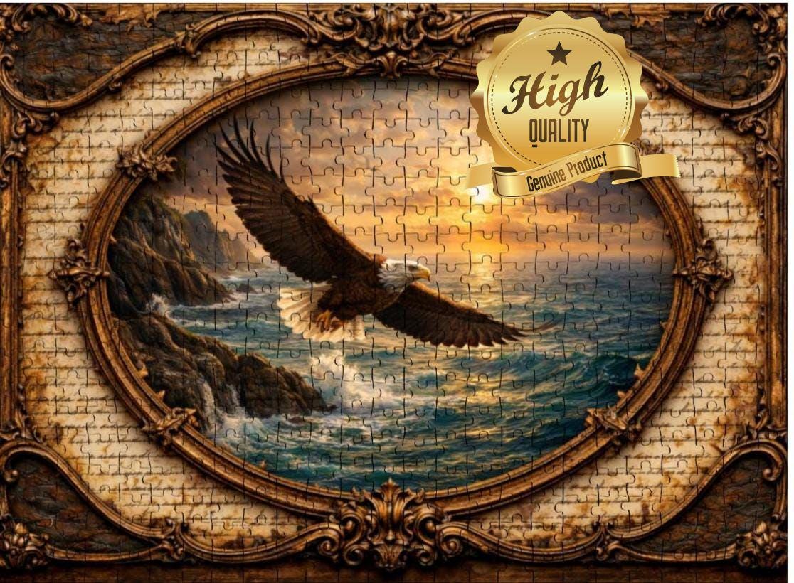 Experience the beauty of the wild with this Bald Eagle Wooden Jigsaw Puzzle, featuring a powerful eagle soaring above the ocean at sunset. The warm golden sky, rolling waves, and detailed vintage-style frame create a breathtaking scene that puzzle lovers will enjoy assembling piece by piece.