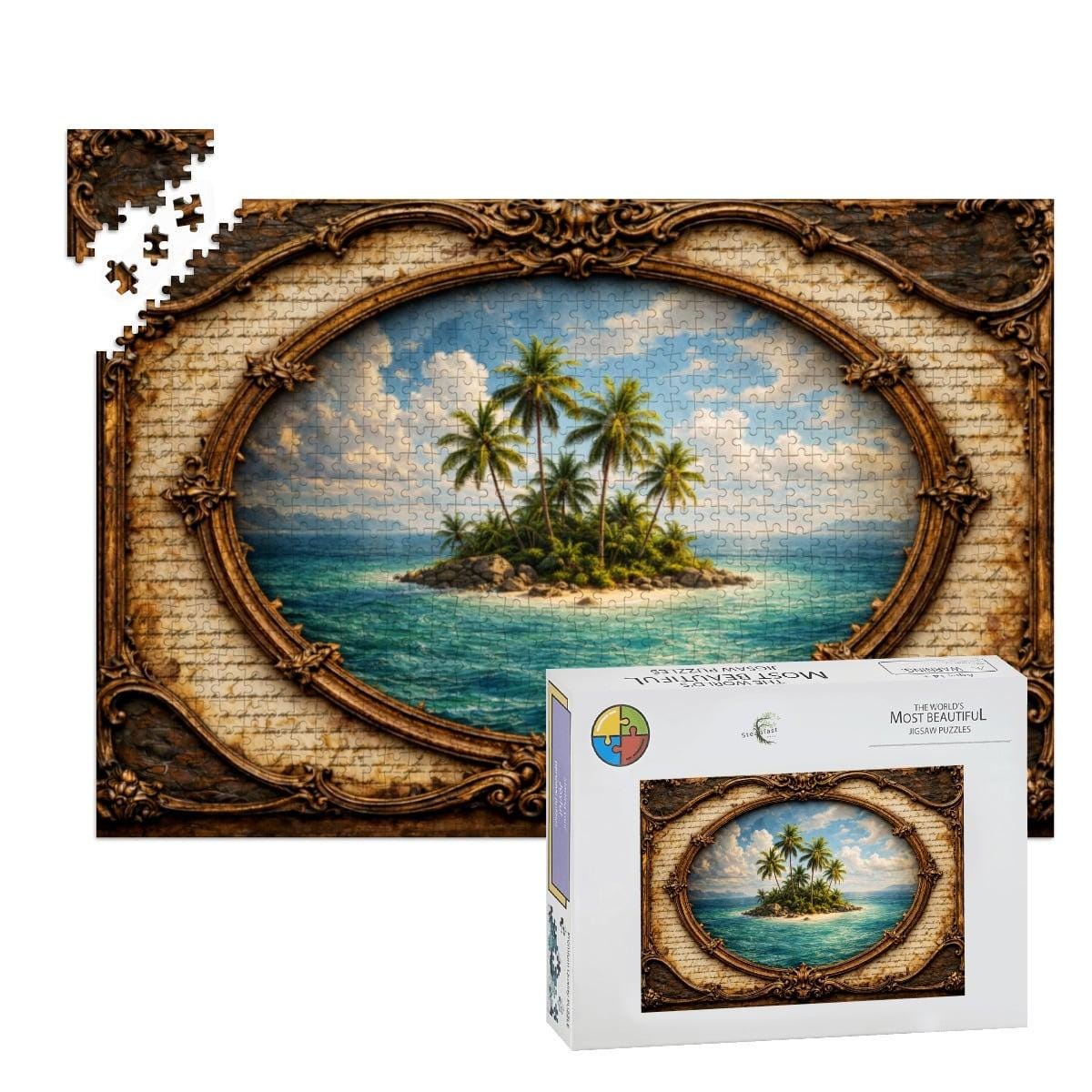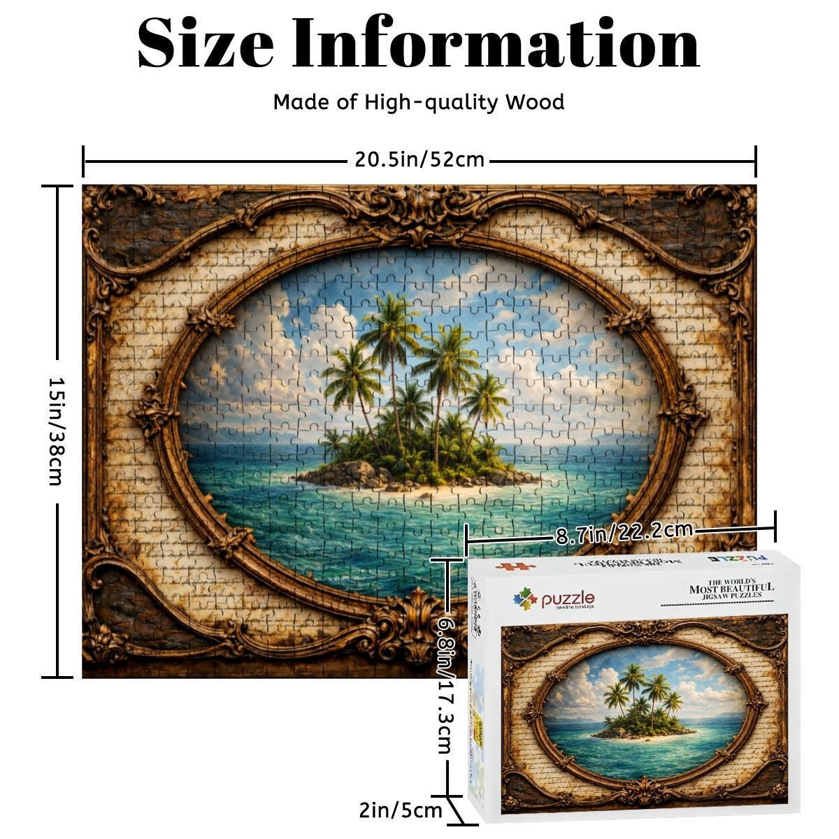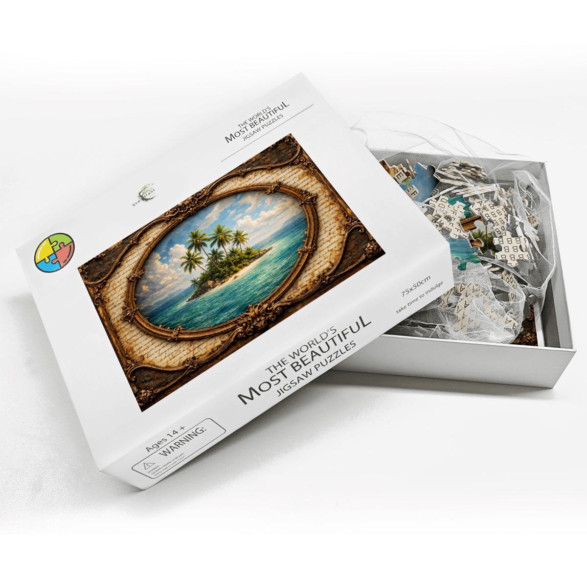 Each puzzle is crafted from high-quality wood and precision cut to ensure smooth edges and a satisfying fit. The vibrant UV printing brings the island scene to life with bright ocean blues and natural greens.