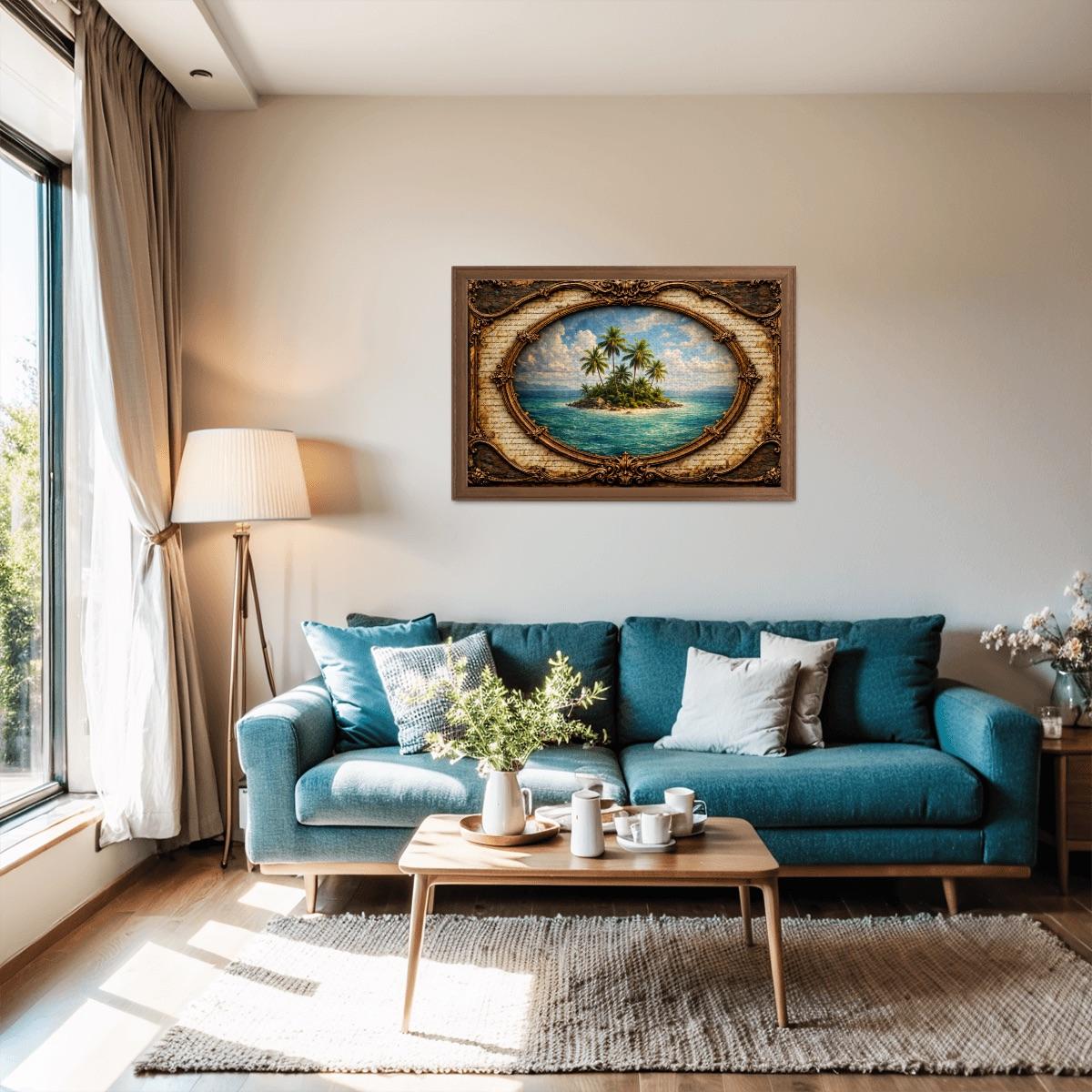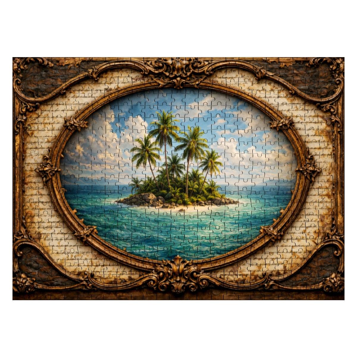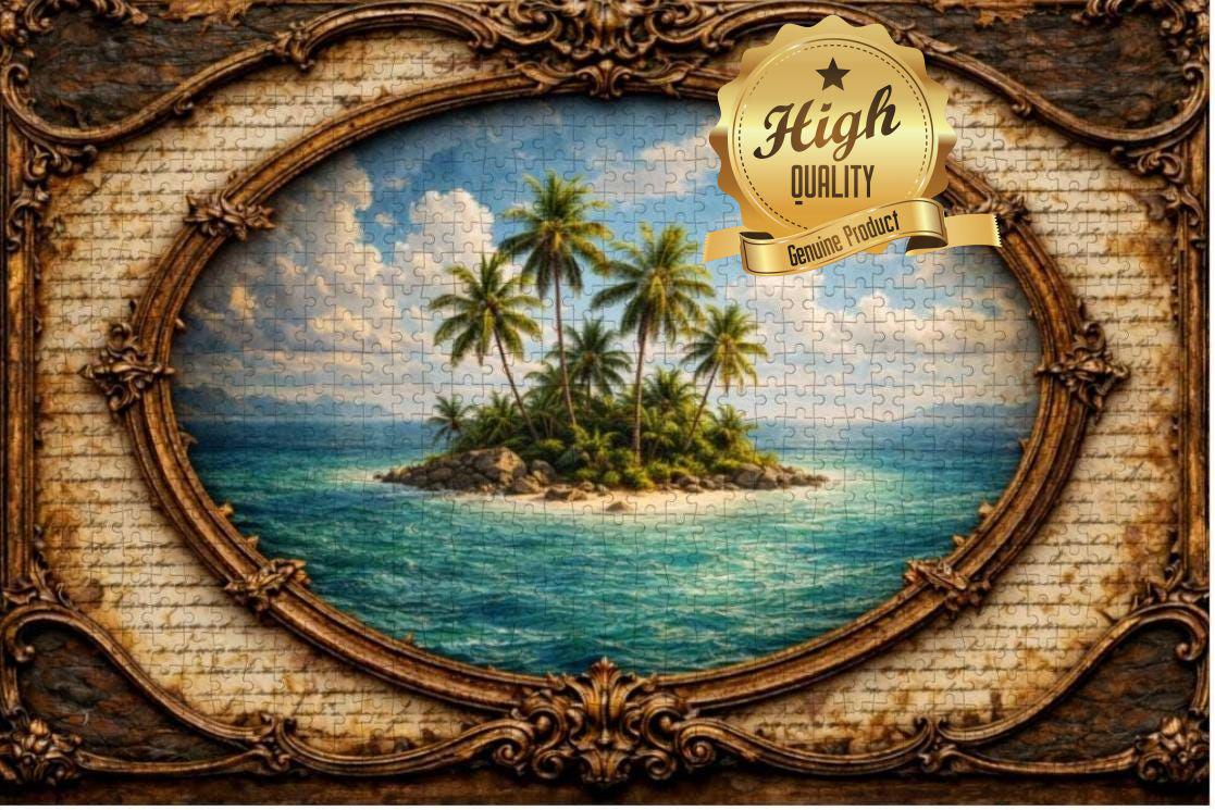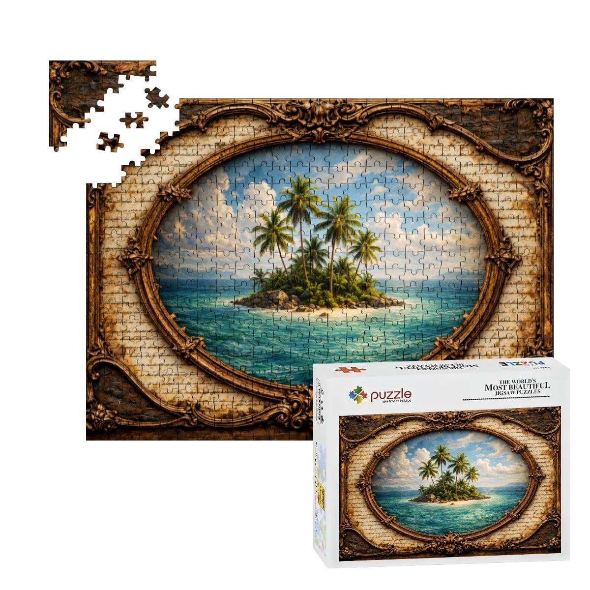 Escape to a peaceful tropical paradise with this beautiful Tropical Island Wooden Puzzle. The artwork features a small island surrounded by clear blue ocean waters with tall palm trees swaying in the breeze, framed in a vintage oval design that gives the scene a warm and timeless look.