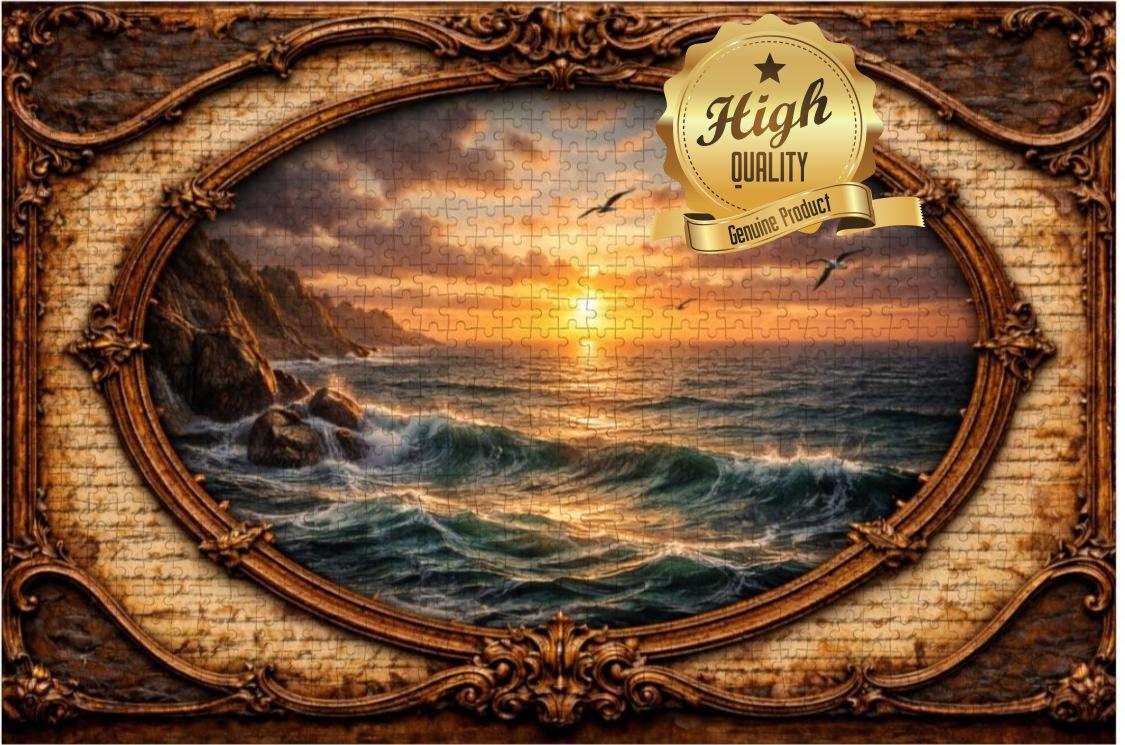 Relax and enjoy the peaceful beauty of the sea with this Ocean Sunset Wooden Jigsaw Puzzle. This stunning artwork features a bird soaring over glowing ocean waves at sunset, framed in an elegant vintage oval design that adds warmth and timeless charm to the scene.