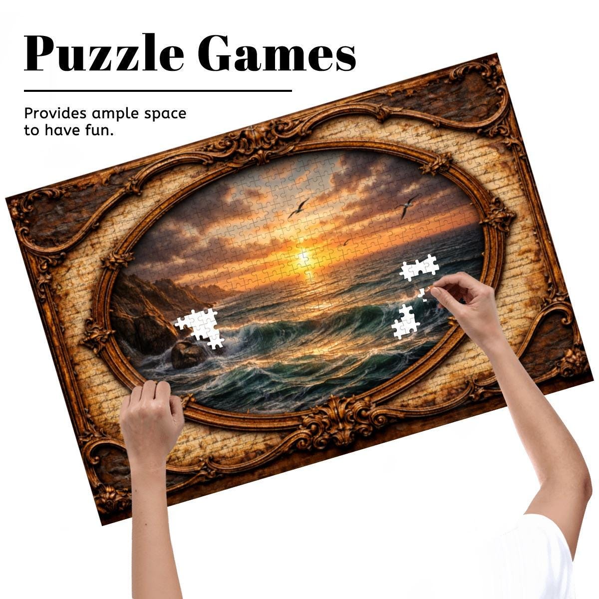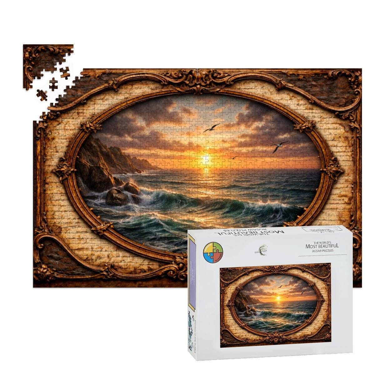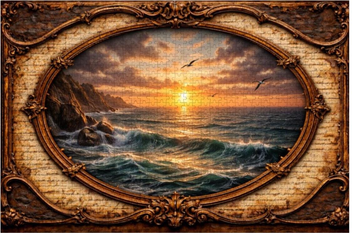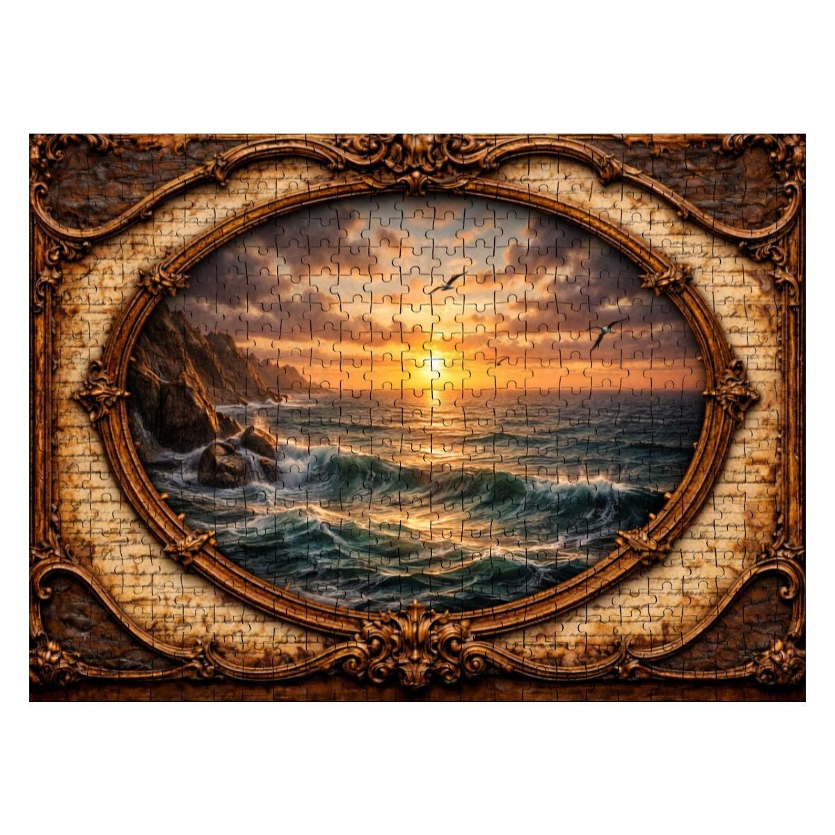 Relax and enjoy the peaceful beauty of the sea with this Ocean Sunset Wooden Jigsaw Puzzle. This stunning artwork features a bird soaring over glowing ocean waves at sunset, framed in an elegant vintage oval design that adds warmth and timeless charm to the scene.
