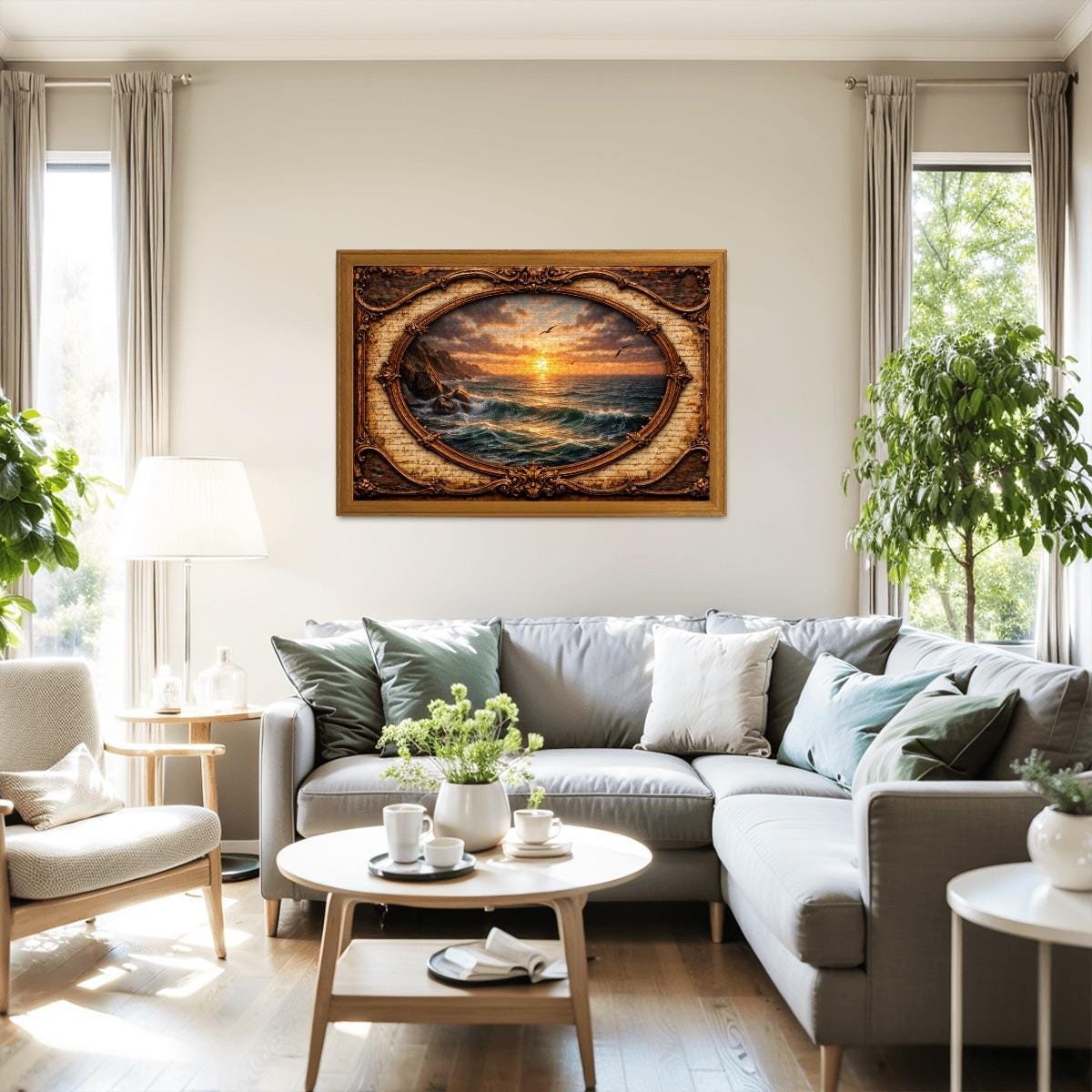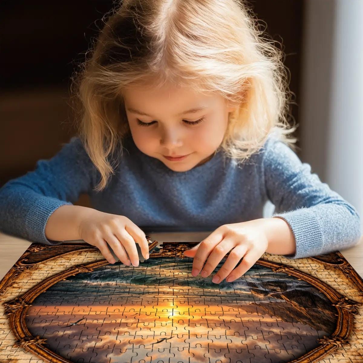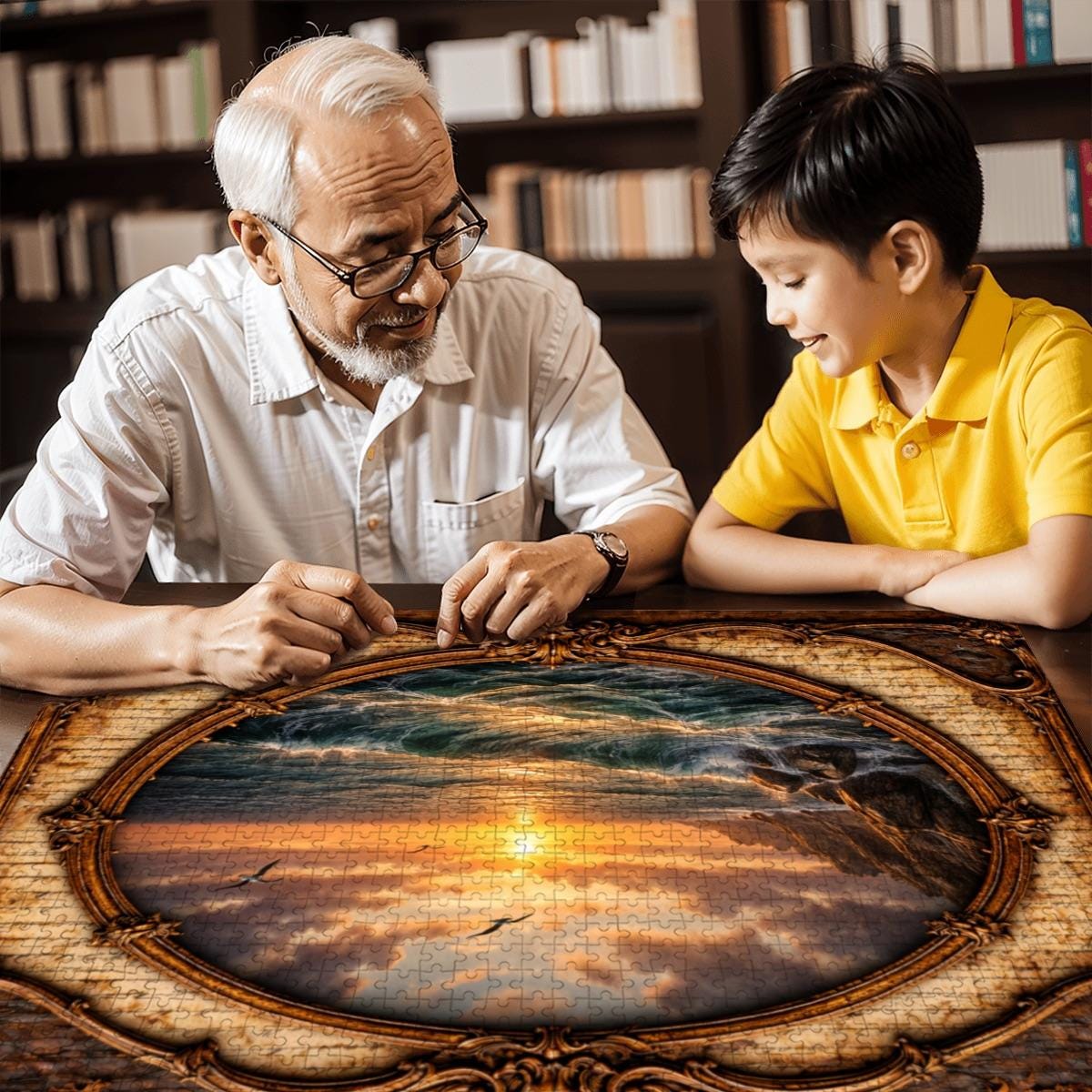 Relax and enjoy the peaceful beauty of the sea with this Ocean Sunset Wooden Jigsaw Puzzle. This stunning artwork features a bird soaring over glowing ocean waves at sunset, framed in an elegant vintage oval design that adds warmth and timeless charm to the scene.